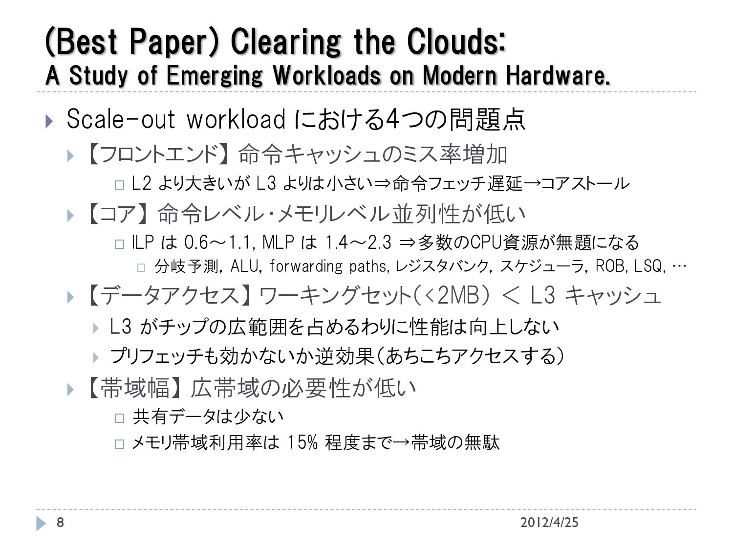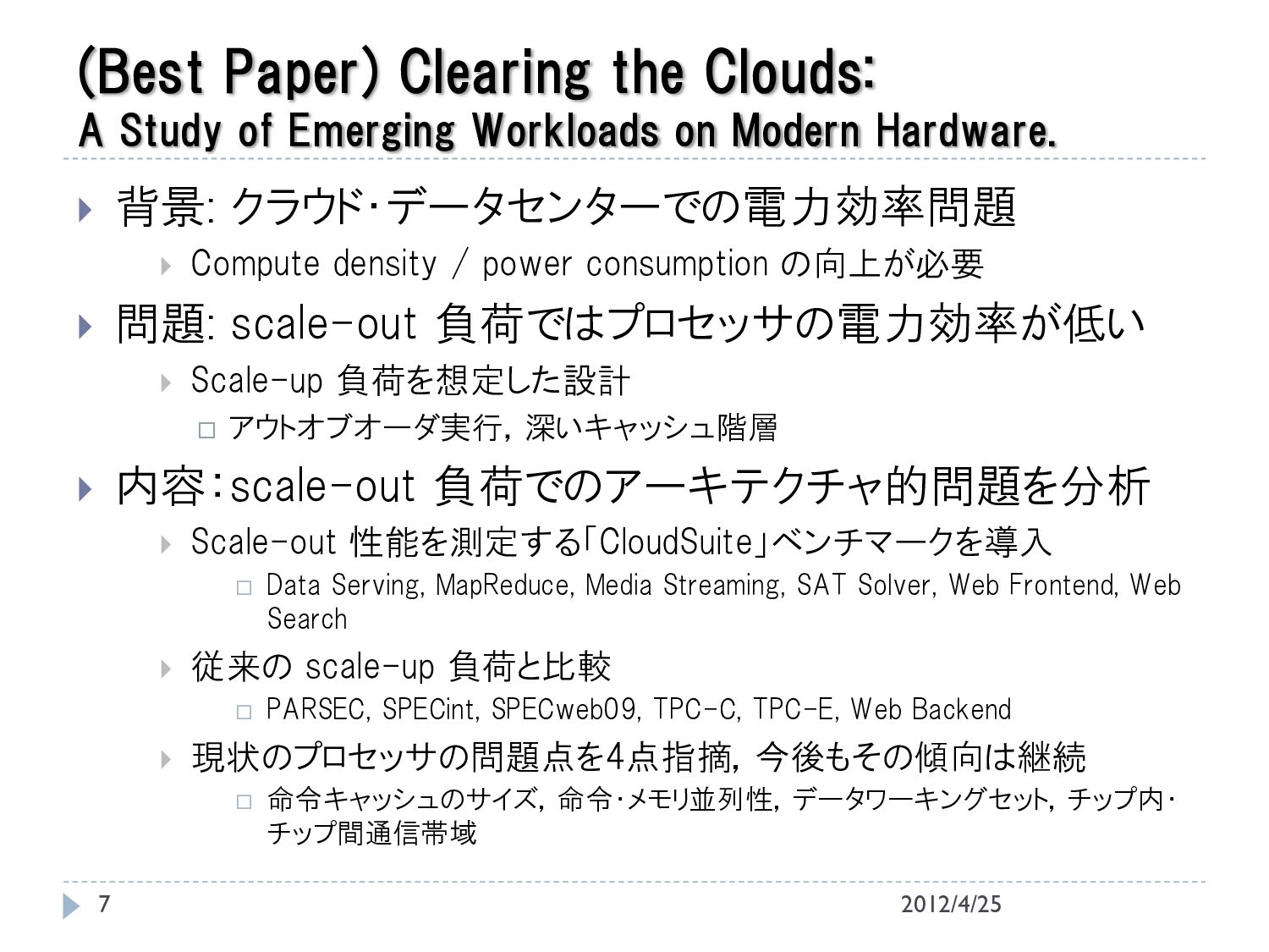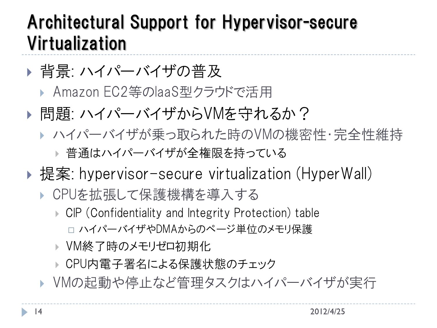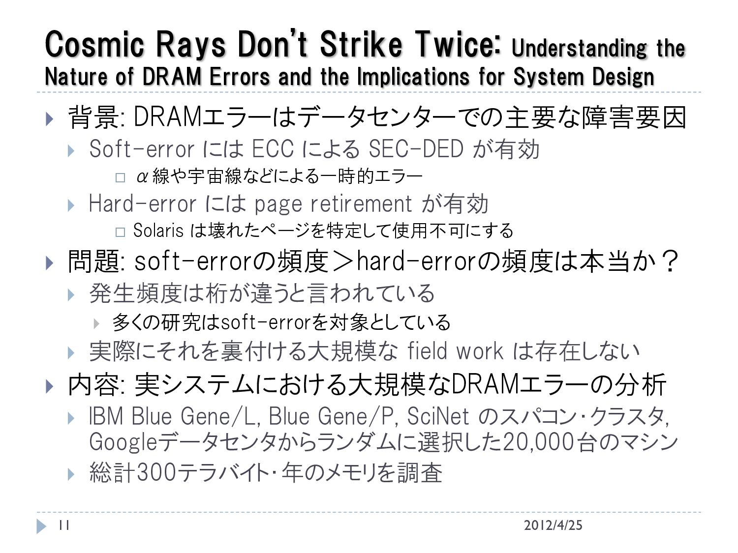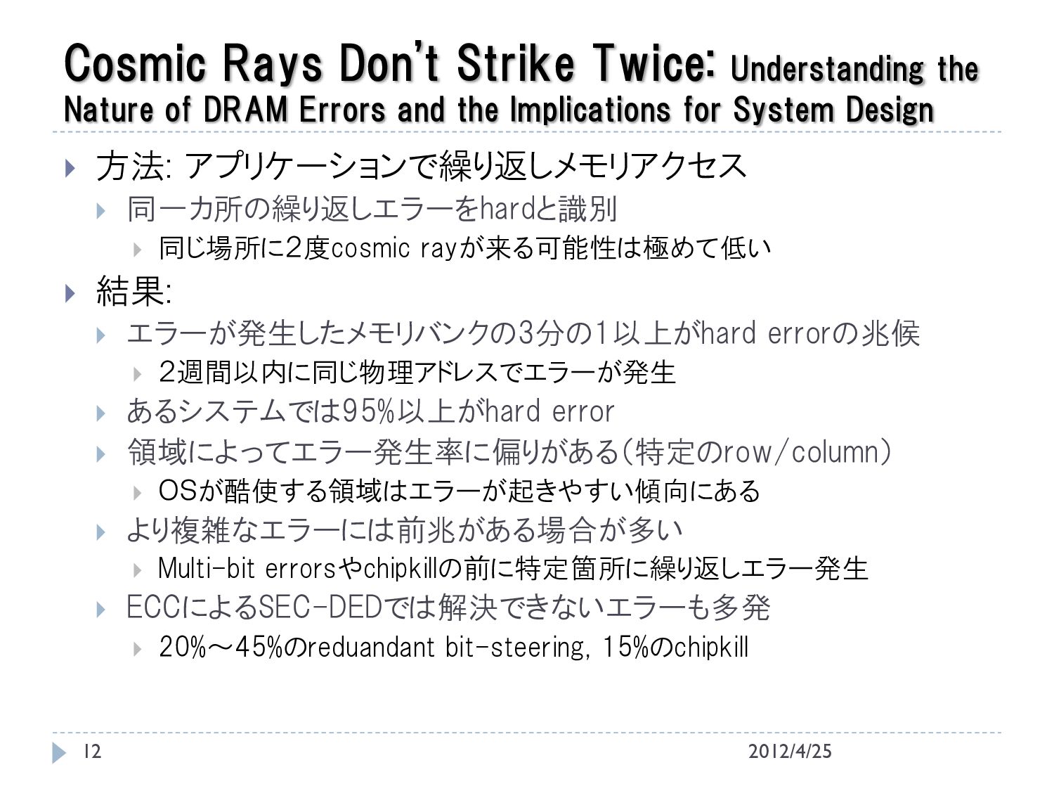 request handling and interrupts (only 23.3%), initialization and cleanup (36%), error handling (5%), configuration (15%), power management (7.4%), ioctl handling (6.2%) 15%のドライバは計算処理をしている(sound, NIC, wireless, CD-ROM, ..) 複数デバイスサポート(3,217個のバス・デバイスドライバで14,000デバイス) ドライバの相互作用 デバイス内プロセッサの活用,汎用性向上,隔離用インターフェイス {Kernel library, Memory management, Synchronization}, Device library, Kernel services 多くのドライバはカーネルサービスとの相互作用少⇒ユーザレベル・VM等での隔離が容易 デバイスもカーネルも直接は呼び出さないドライバ⇒”miniport”ドライバとして単純化可能 ドライバの冗長性 ライブラリやサブシステムによる抽象化の機会 8%のコードに類似性がある