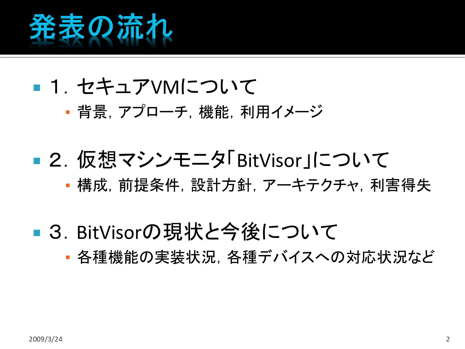 1.セキュアVMについて ▪ 背景,アプローチ,機能,利用イメージ 2.仮想マシンモニタ「BitVisor」について ▪ 構成,前提条件,設計方針,アーキテクチャ,利害得失 3.BitVisorの現状と今後について