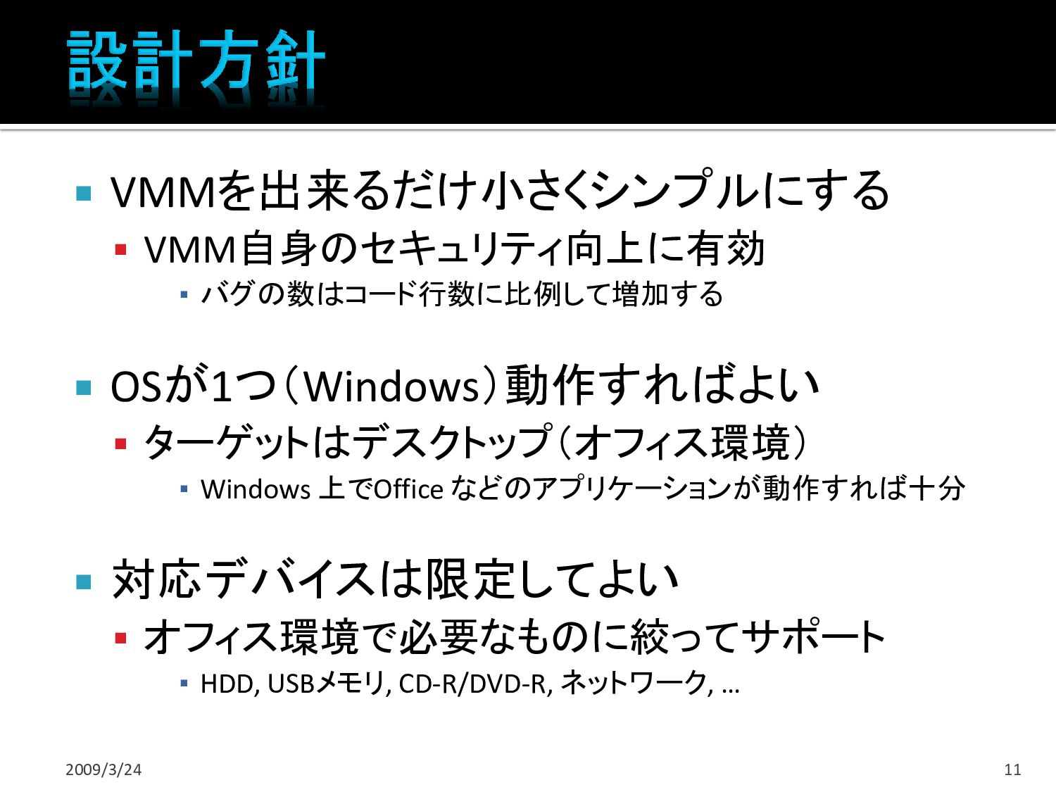 VMMを出来るだけ小さくシンプルにする VMM自身のセキュリティ向上に有効 ▪ バグの数はコード行数に比例して増加する OSが1つ(Windows)動作すればよい ターゲットはデスクトップ(オフィス環境)