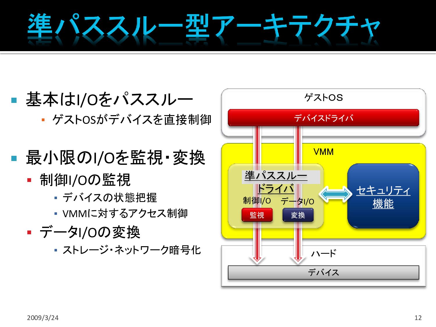 ▪ VMMに対するアクセス制御 データI/Oの変換 ▪ ストレージ・ネットワーク暗号化 VMM ハード ゲストOS デバイス 2009/3/24 12 デバイスドライバ 準パススルー ドライバ 監視 変換 制御I/O データI/O セキュリティ 機能