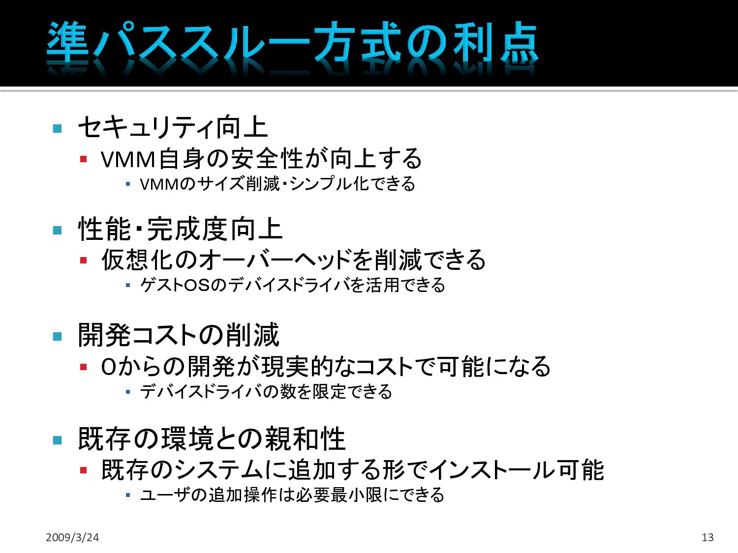 ▪ ゲストOSのデバイスドライバを活用できる 開発コストの削減 0からの開発が現実的なコストで可能になる ▪ デバイスドライバの数を限定できる 既存の環境との親和性 既存のシステムに追加する形でインストール可能 ▪ ユーザの追加操作は必要最小限にできる 2009/3/24 13