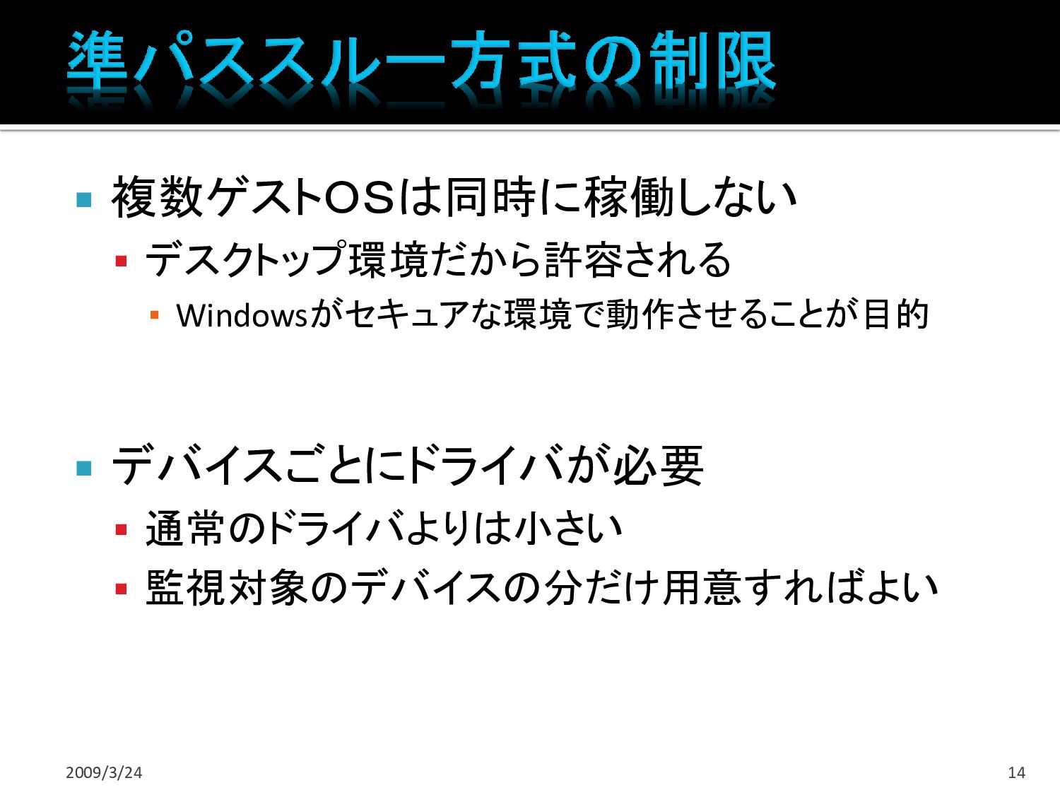 ▪ Windows 上でOffice などのアプリケーションが動作すれば十分 対応デバイスは限定してよい オフィス環境で必要なものに絞ってサポート ▪ HDD, USBメモリ, CD-R/DVD-R, ネットワーク, … 2009/3/24 11