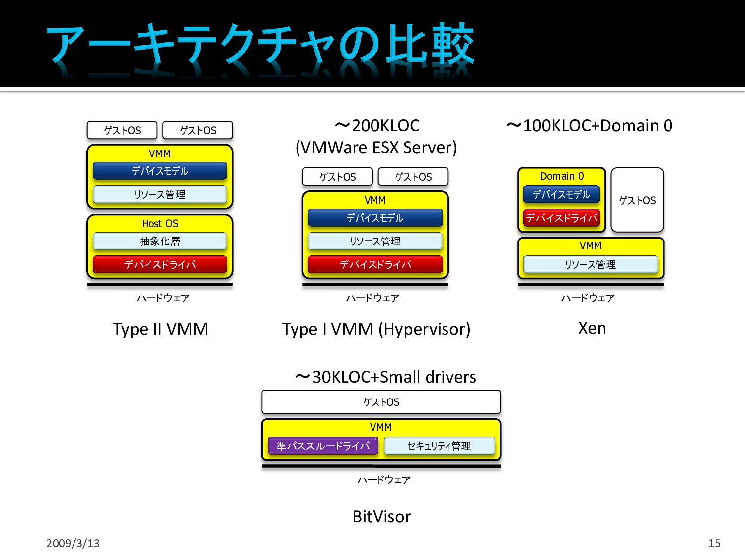 デバイスドライバ デバイスドライバ デバイスモデル VMM Domain 0 ゲストOS デバイスドライバ リソース管理 抽象化層 デバイスモデル ハードウェア ハードウェア ハードウェア リソース管理 リソース管理 デバイスモデル Type II VMM Type I VMM (Hypervisor) Xen ~200KLOC (VMWare ESX Server) ~100KLOC+Domain 0 VMM ゲストOS 準パススルードライバ ハードウェア セキュリティ管理 BitVisor ~30KLOC+Small drivers