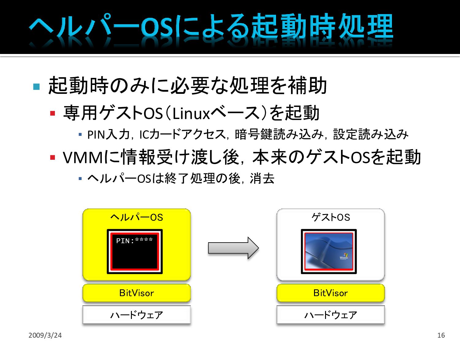 2009/3/24 16 BitVisor ハードウェア ヘルパーOS PIN:**** BitVisor ハードウェア ゲストOS