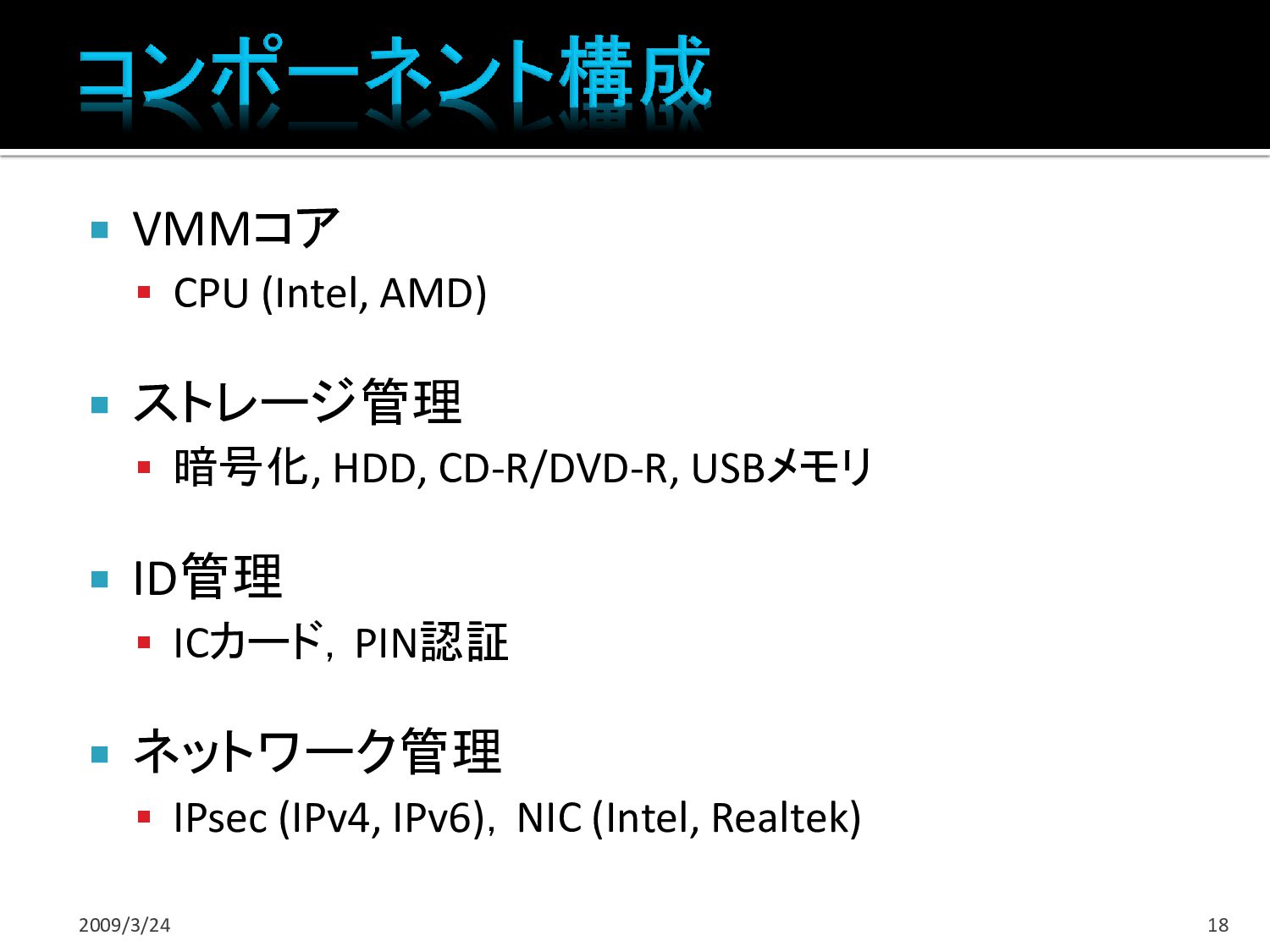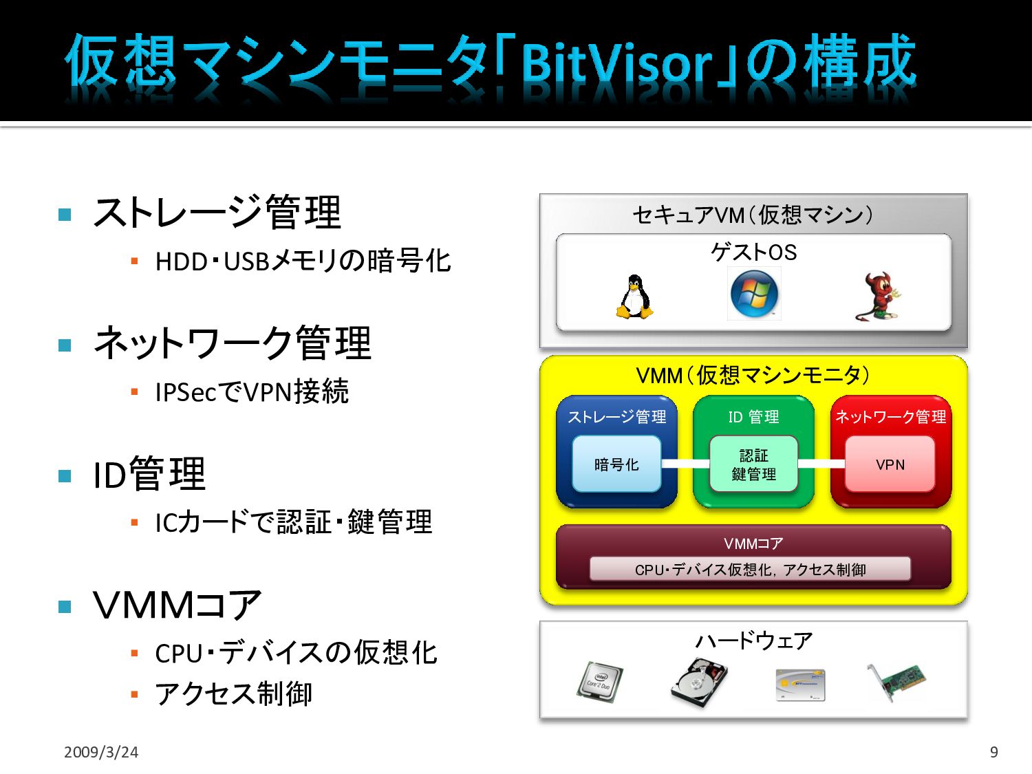 ID管理 ▪ ICカードで認証・鍵管理 VMMコア ▪ CPU・デバイスの仮想化 ▪ アクセス制御 VMM(仮想マシンモニタ) ハードウェア ゲストOS ネットワーク管理 ストレージ管理 ID 管理 認証 鍵管理 VPN 暗号化 VMMコア CPU・デバイス仮想化,アクセス制御 2009/3/24 9