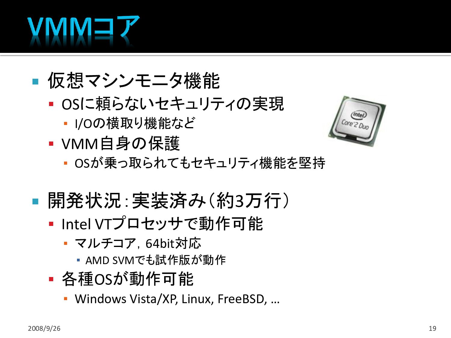 開発状況:実装済み(約3万行) Intel VTプロセッサで動作可能 ▪ マルチコア,64bit対応 ▪ AMD SVMでも試作版が動作 各種OSが動作可能 ▪ Windows Vista/XP, Linux, FreeBSD, … 2008/9/26 19