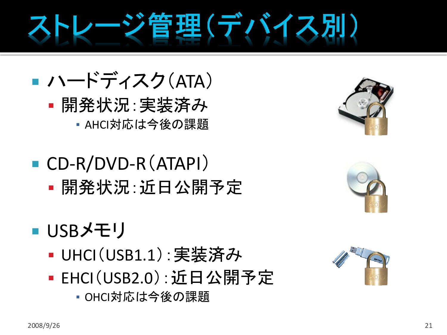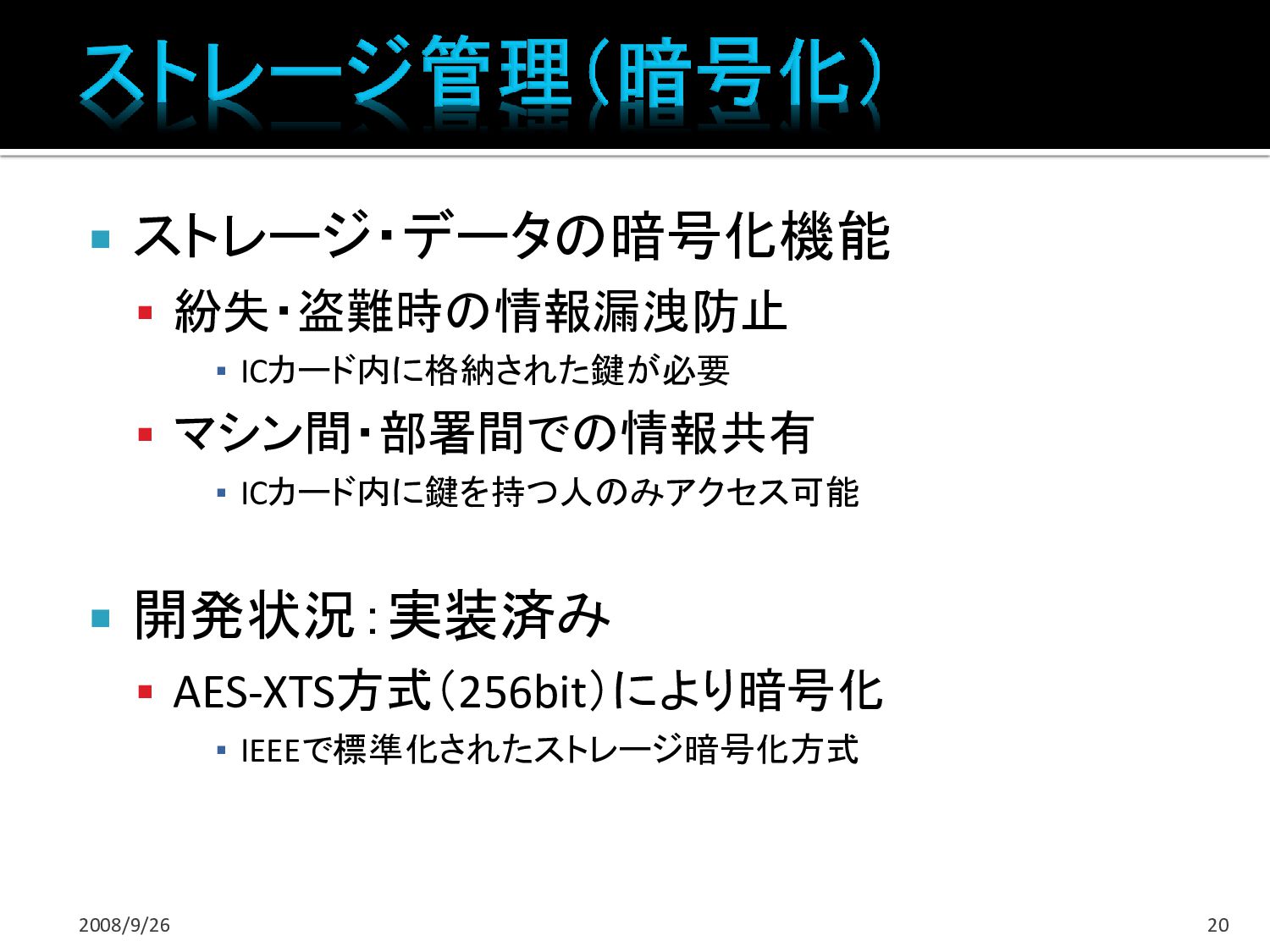 開発状況:実装済み AES-XTS方式(256bit)により暗号化 ▪ IEEEで標準化されたストレージ暗号化方式 2008/9/26 20