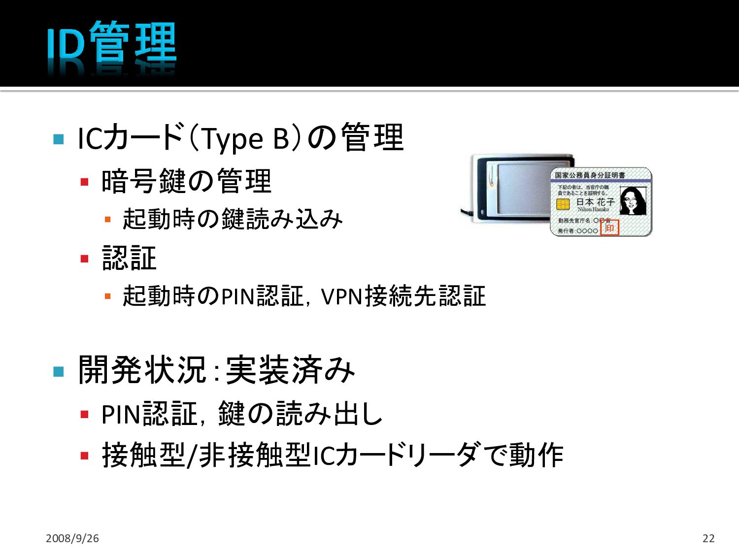 起動時のPIN認証,VPN接続先認証 開発状況:実装済み PIN認証,鍵の読み出し 接触型/非接触型ICカードリーダで動作 2008/9/26 22