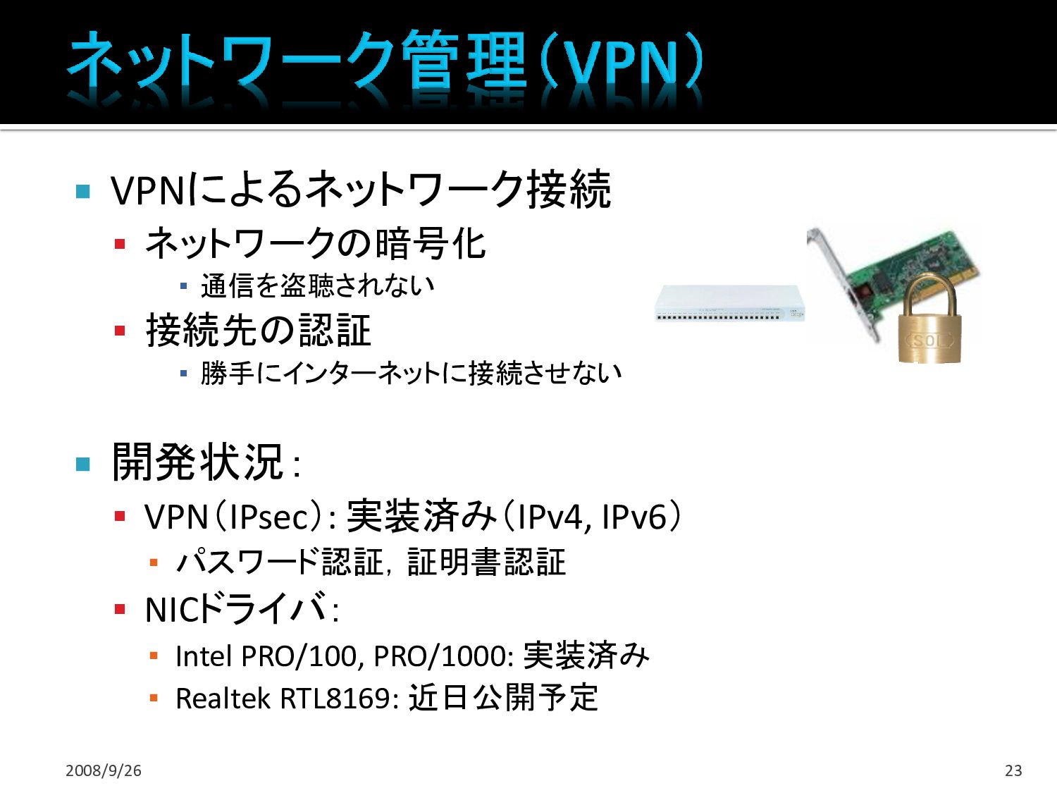 開発状況: VPN(IPsec): 実装済み(IPv4, IPv6) ▪ パスワード認証,証明書認証 NICドライバ: ▪ Intel PRO/100, PRO/1000: 実装済み ▪ Realtek RTL8169: 近日公開予定 2008/9/26 23