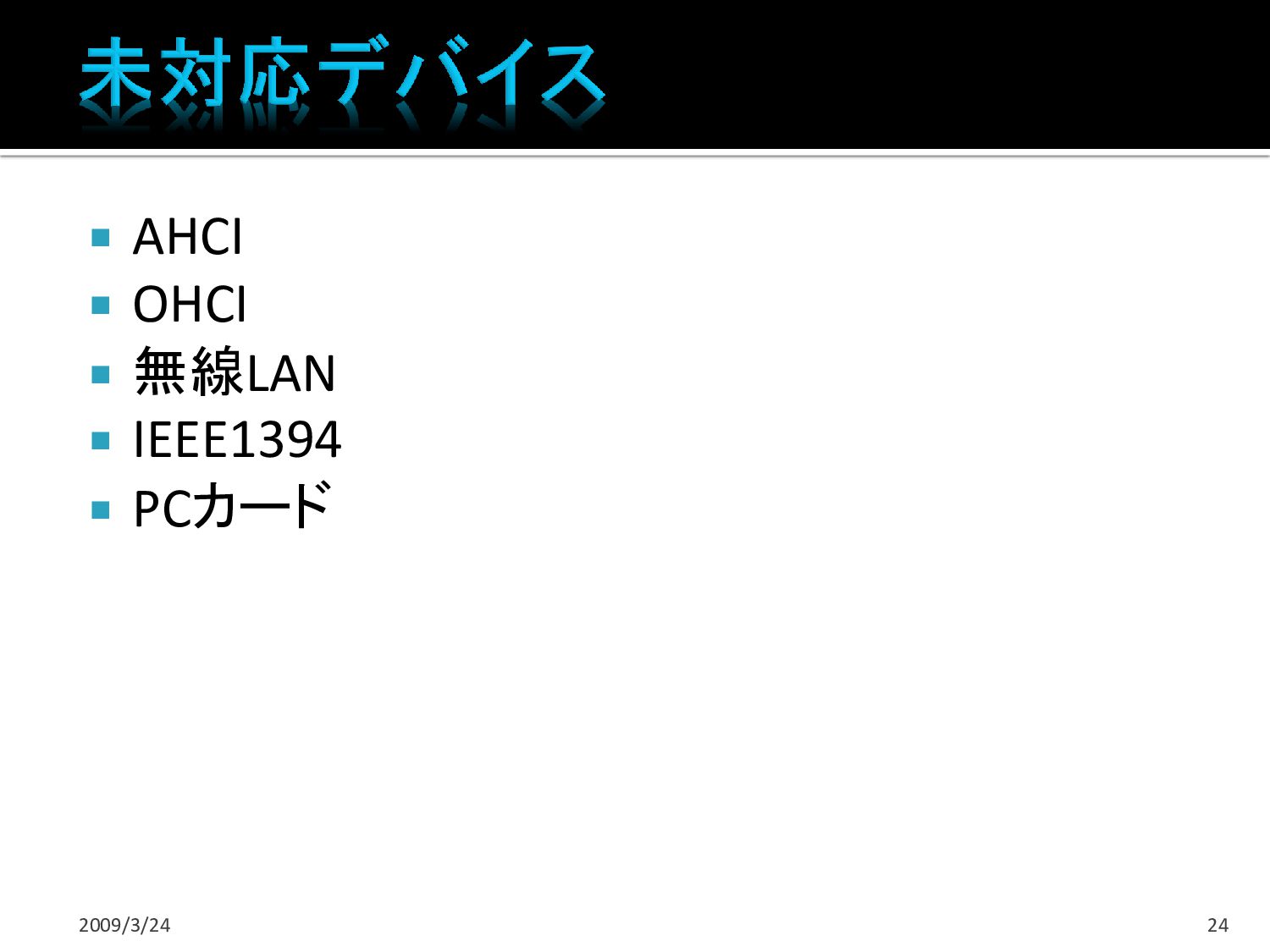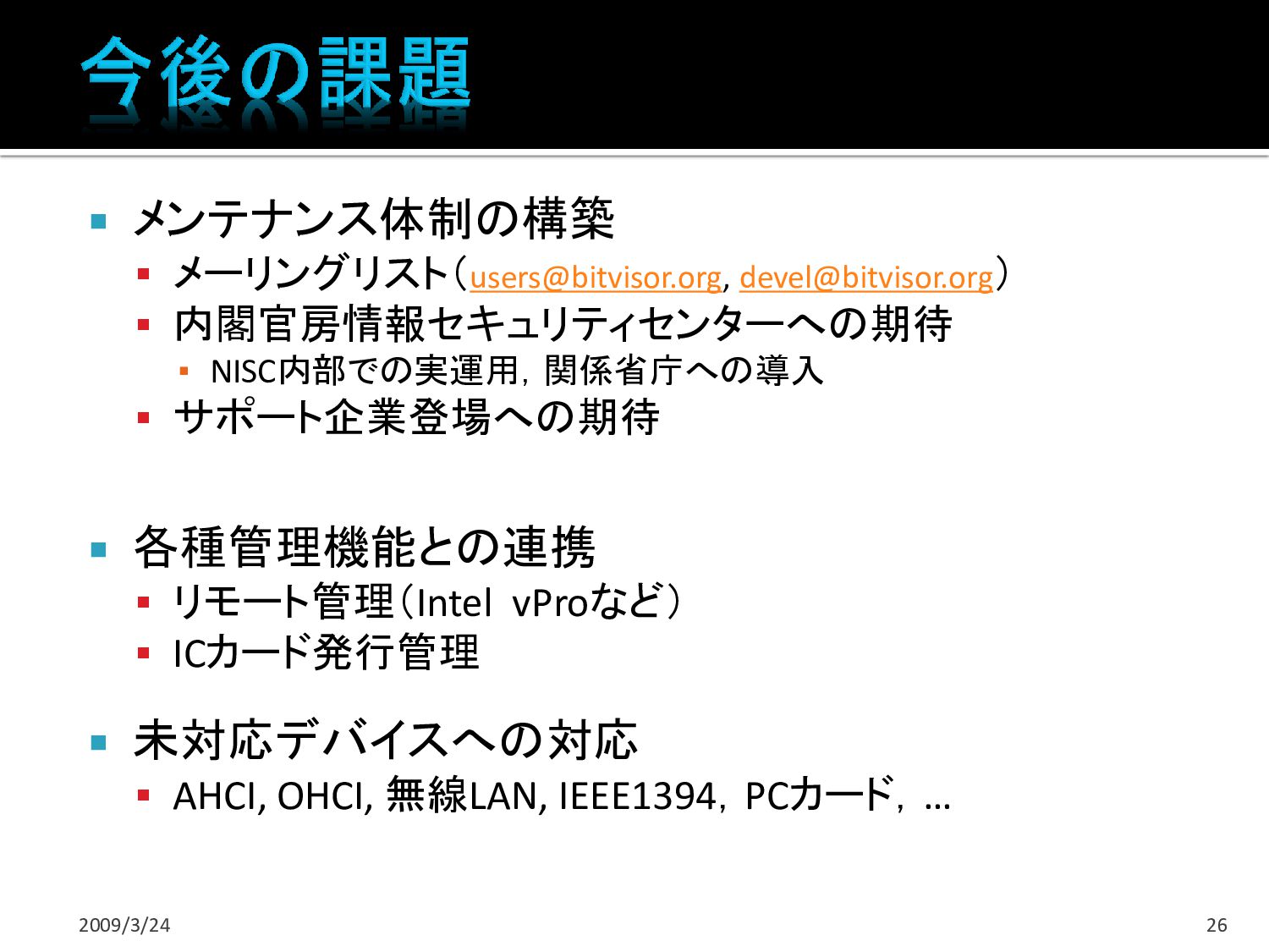 サポート企業登場への期待 各種管理機能との連携 リモート管理(Intel vProなど) ICカード発行管理 未対応デバイスへの対応 AHCI, OHCI, 無線LAN, IEEE1394,PCカード,… 2009/3/24 26