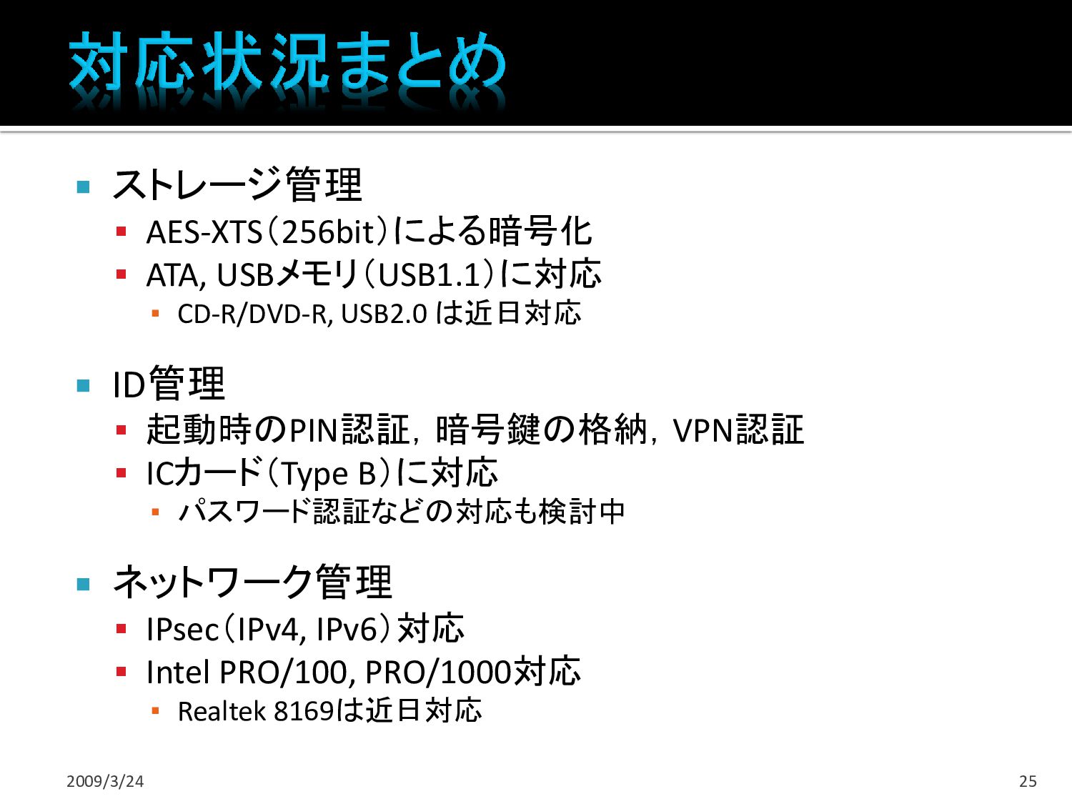 HDD, CD-R/DVD-R, USBメモリ ID管理 ICカード,PIN認証 ネットワーク管理 IPsec (IPv4, IPv6),NIC (Intel, Realtek) 2009/3/24 18
