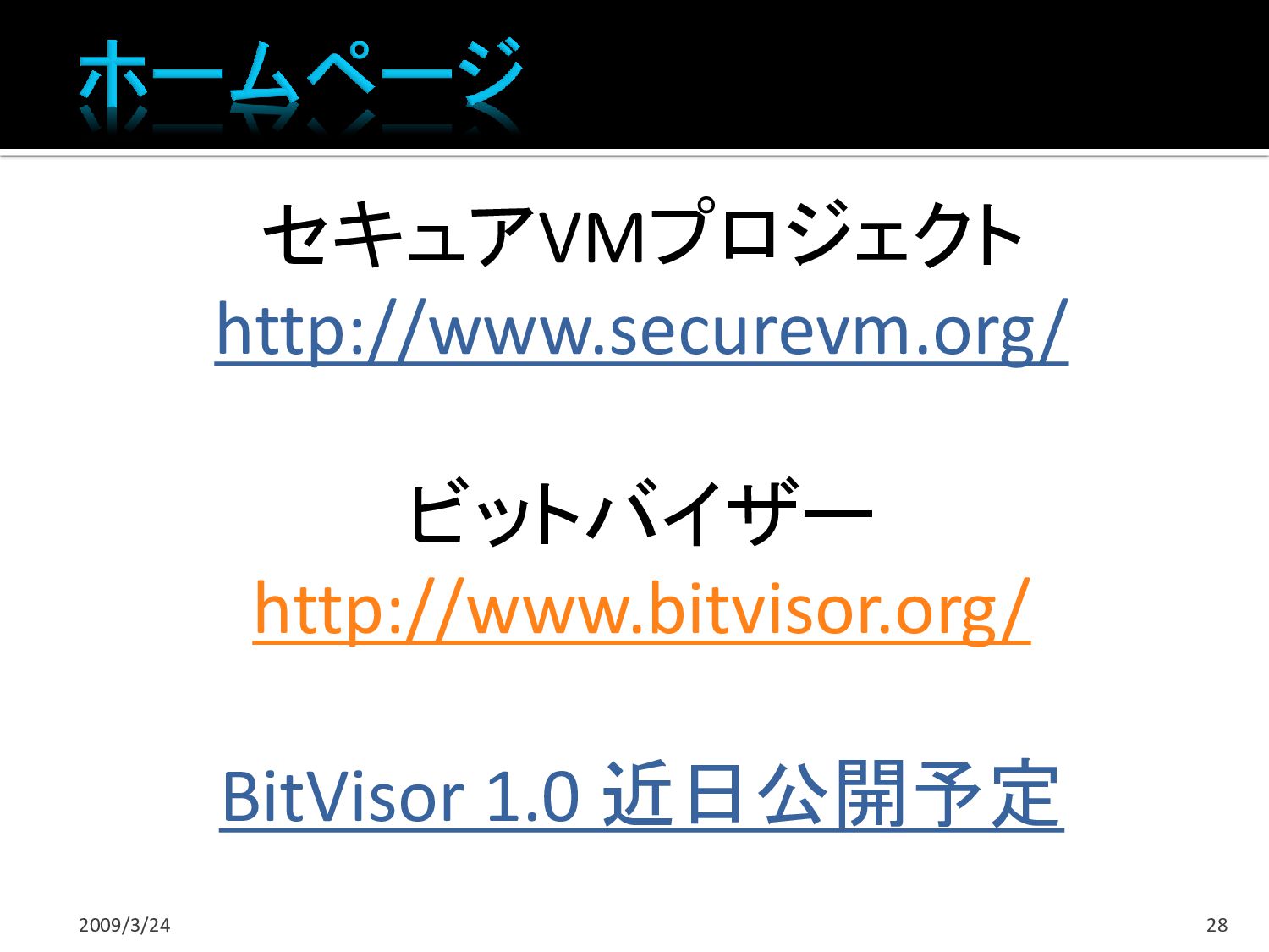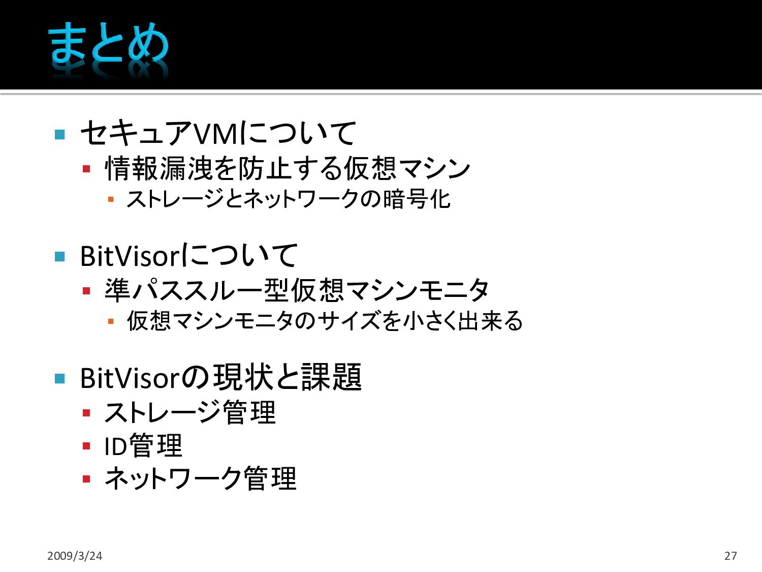 ▪ 仮想マシンモニタのサイズを小さく出来る BitVisorの現状と課題 ストレージ管理 ID管理 ネットワーク管理 2009/3/24 27