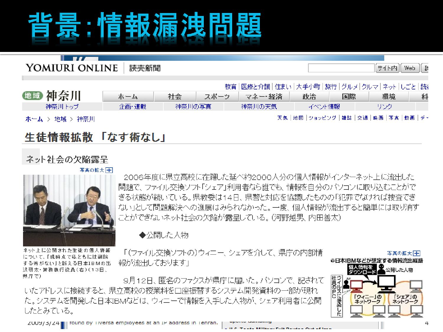 「デスクトップ環境」からの情報漏洩 ▪ ストレージ経由(PC本体・USBメモリの紛失・盗難,…) ▪ ネットワーク経由(ウィルス感染,ファイル交換ソフト,…) 「きわどい」情報の漏洩 ▪ 自衛隊,官公庁,教育機関,病院,銀行,…