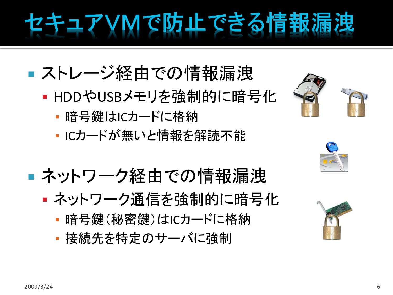 「ユーザ任せのセキュリティはやめたい」 (山口内閣官房情報セキュリティ補佐官談) 持続的なセキュリティ ▪ 仮想マシンモニタは脆弱性が少ない セキュリティアップデートの手間が軽減 2009/3/24 5 ハードウェア 仮想マシンモニタ セキュアVM OS
