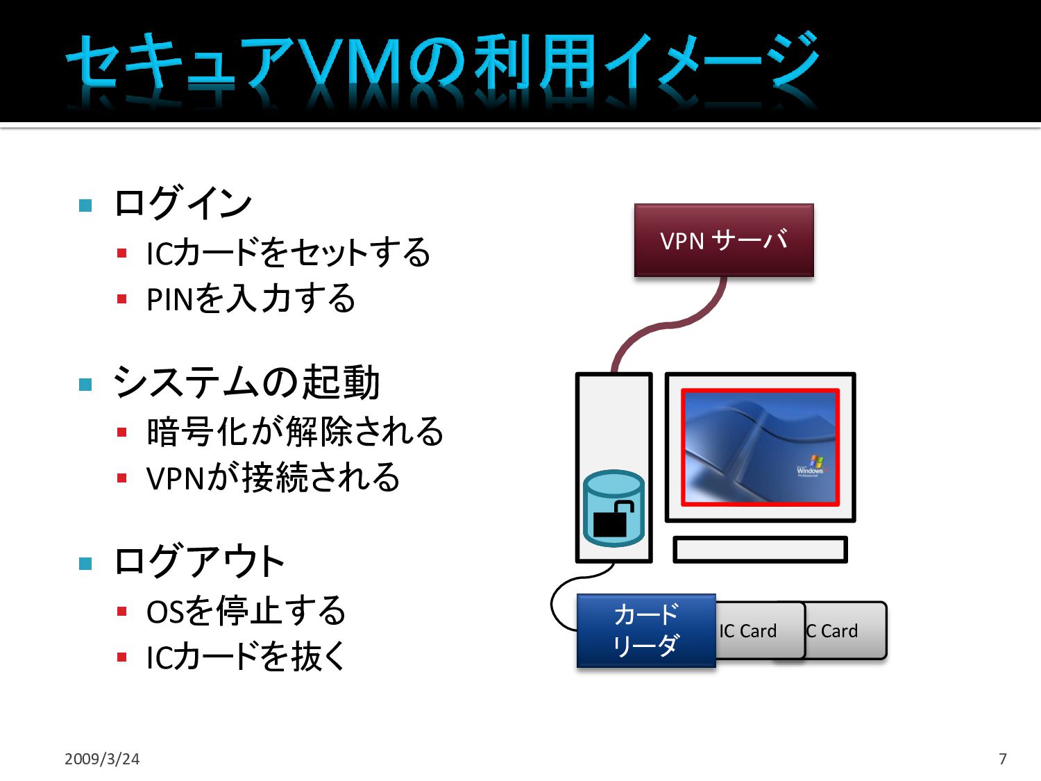 ネットワーク通信を強制的に暗号化 ▪ 暗号鍵(秘密鍵)はICカードに格納 ▪ 接続先を特定のサーバに強制 2009/3/24 6