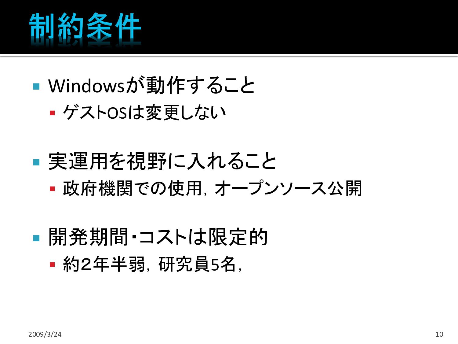Windowsが動作すること ゲストOSは変更しない 実運用を視野に入れること 政府機関での使用,オープンソース公開 開発期間・コストは限定的