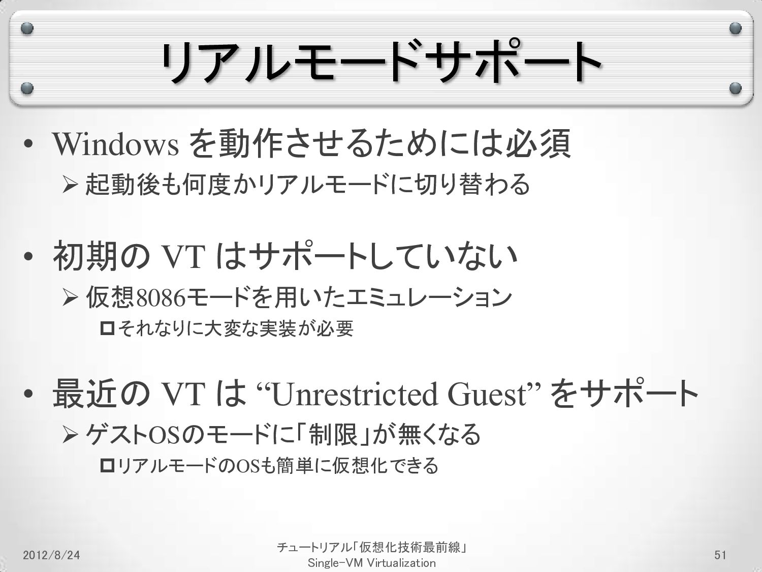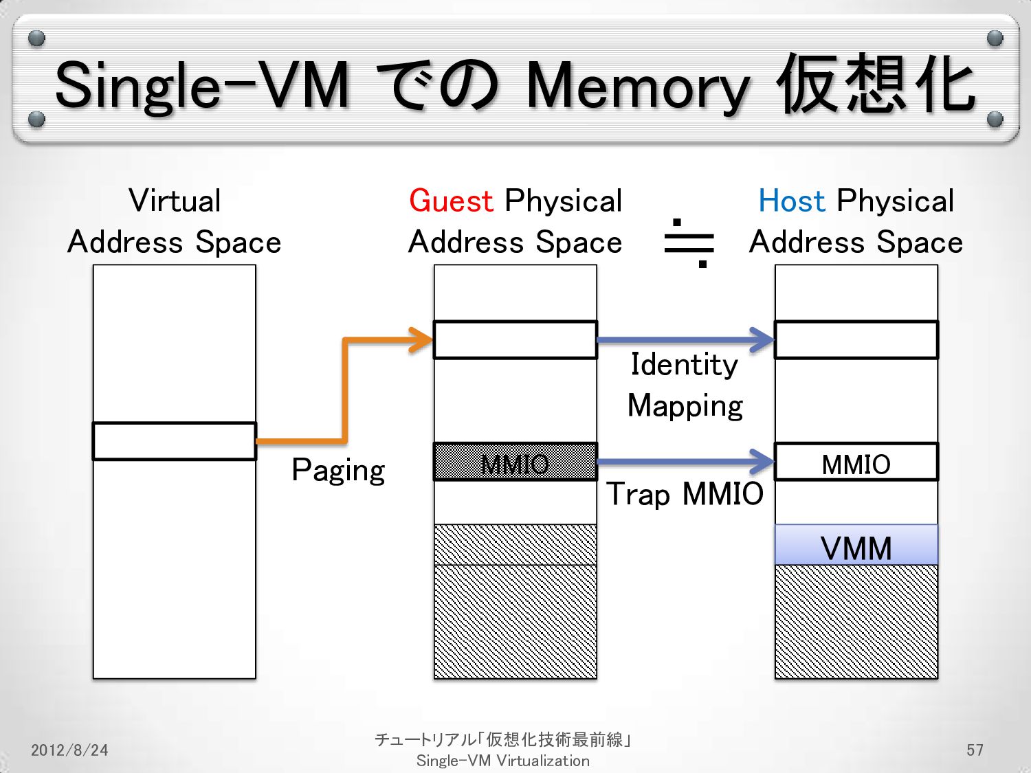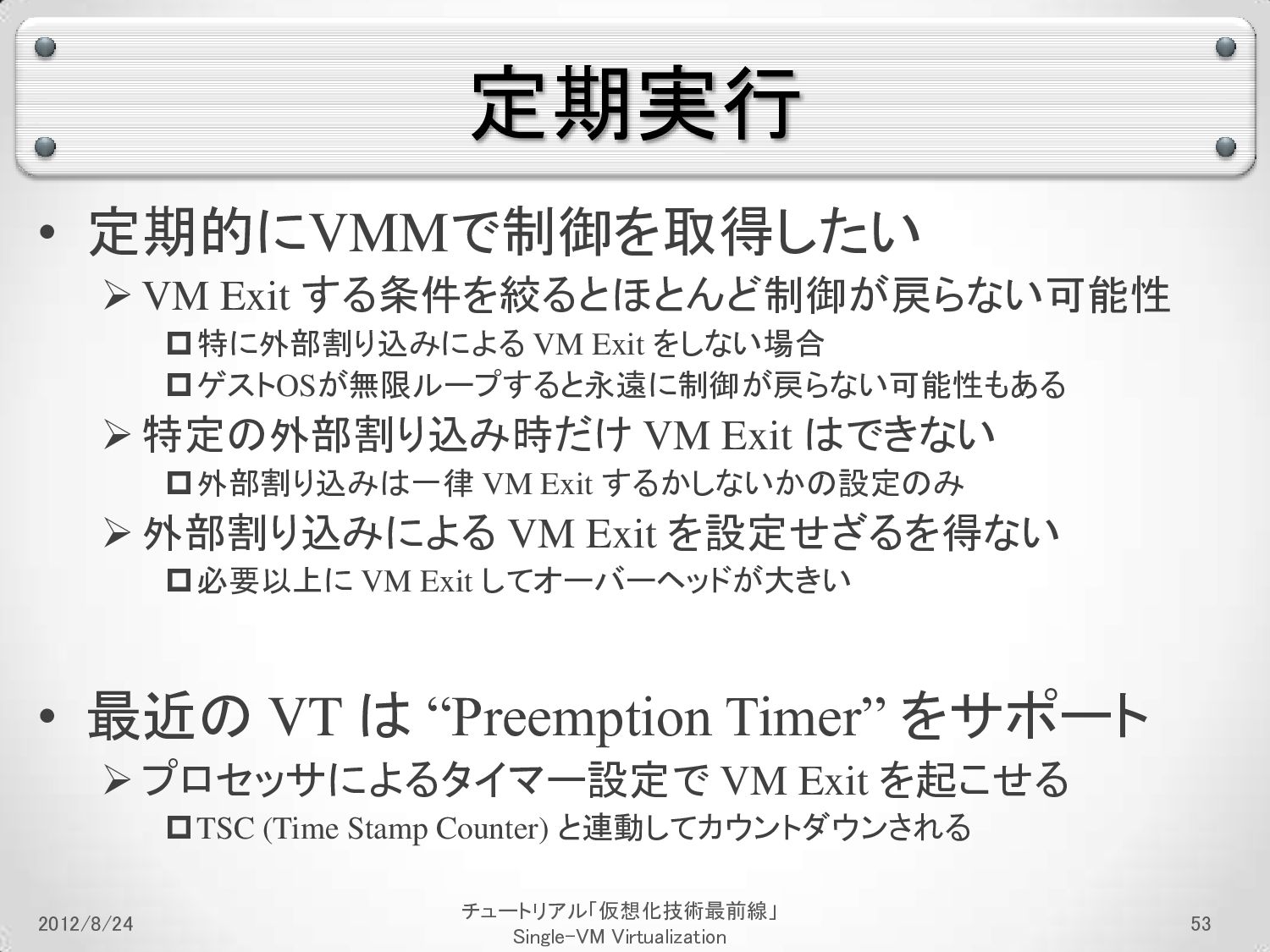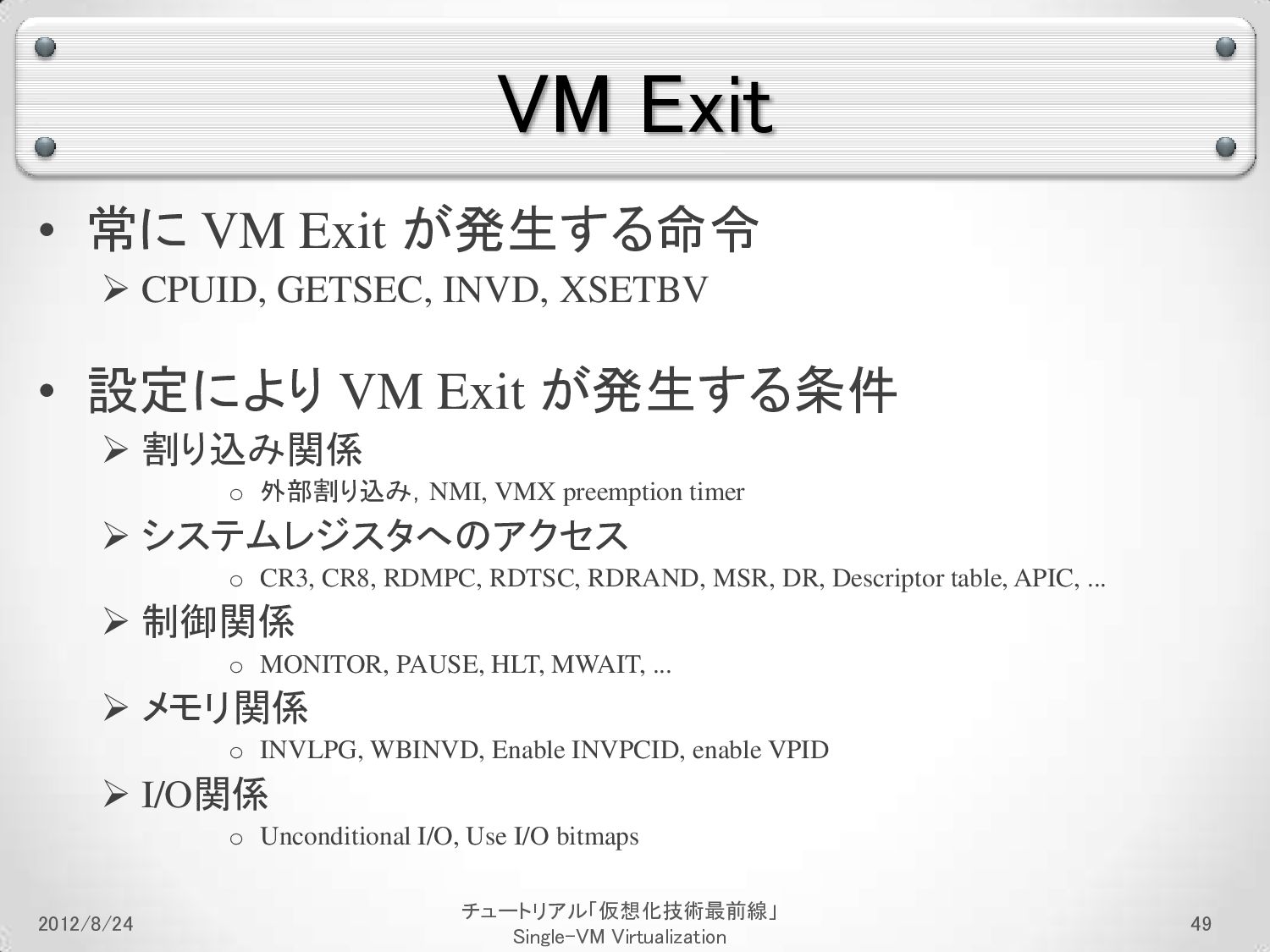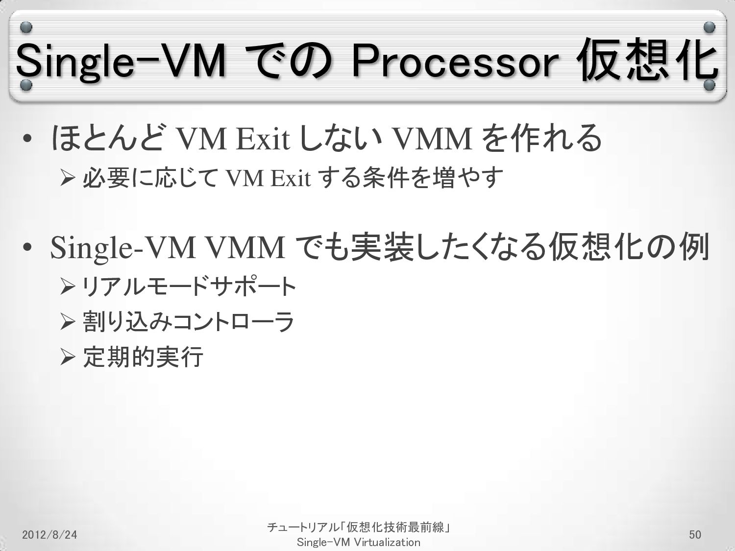 INVD, XSETBV • 設定により VM Exit が発生する条件 割り込み関係 o 外部割り込み,NMI, VMX preemption timer システムレジスタへのアクセス o CR3, CR8, RDMPC, RDTSC, RDRAND, MSR, DR, Descriptor table, APIC, ... 制御関係 o MONITOR, PAUSE, HLT, MWAIT, ... メモリ関係 o INVLPG, WBINVD, Enable INVPCID, enable VPID I/O関係 o Unconditional I/O, Use I/O bitmaps 2012/8/24 チュートリアル「仮想化技術最前線」 Single-VM Virtualization 49