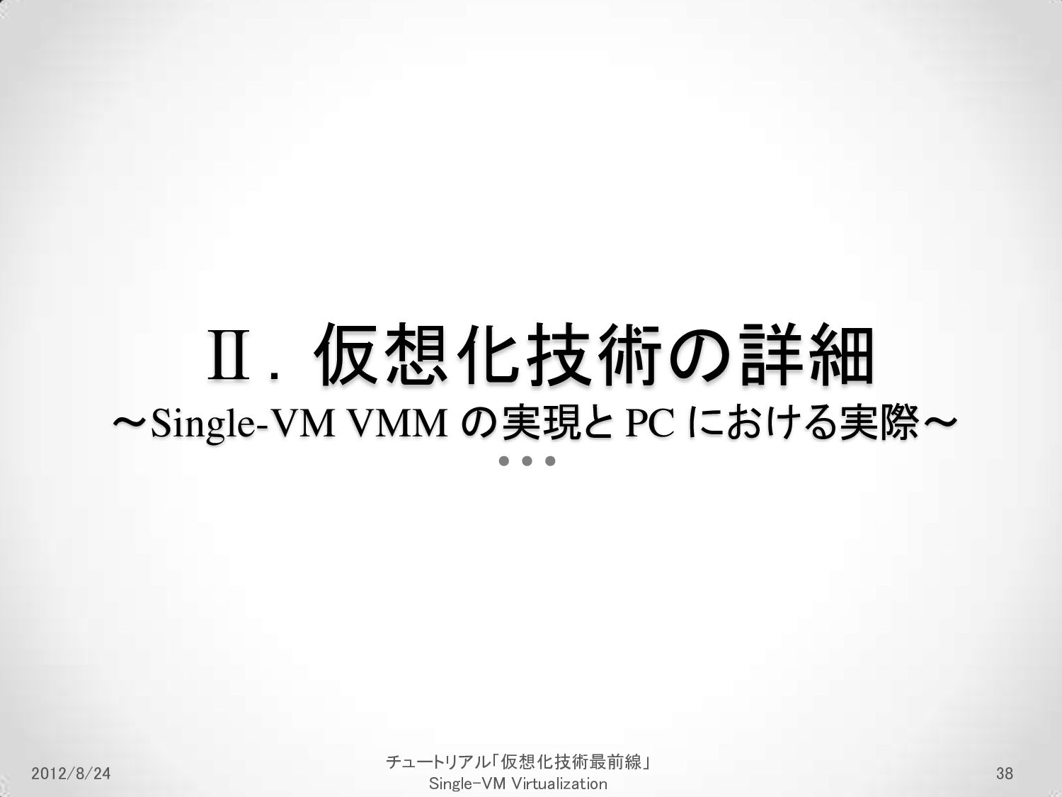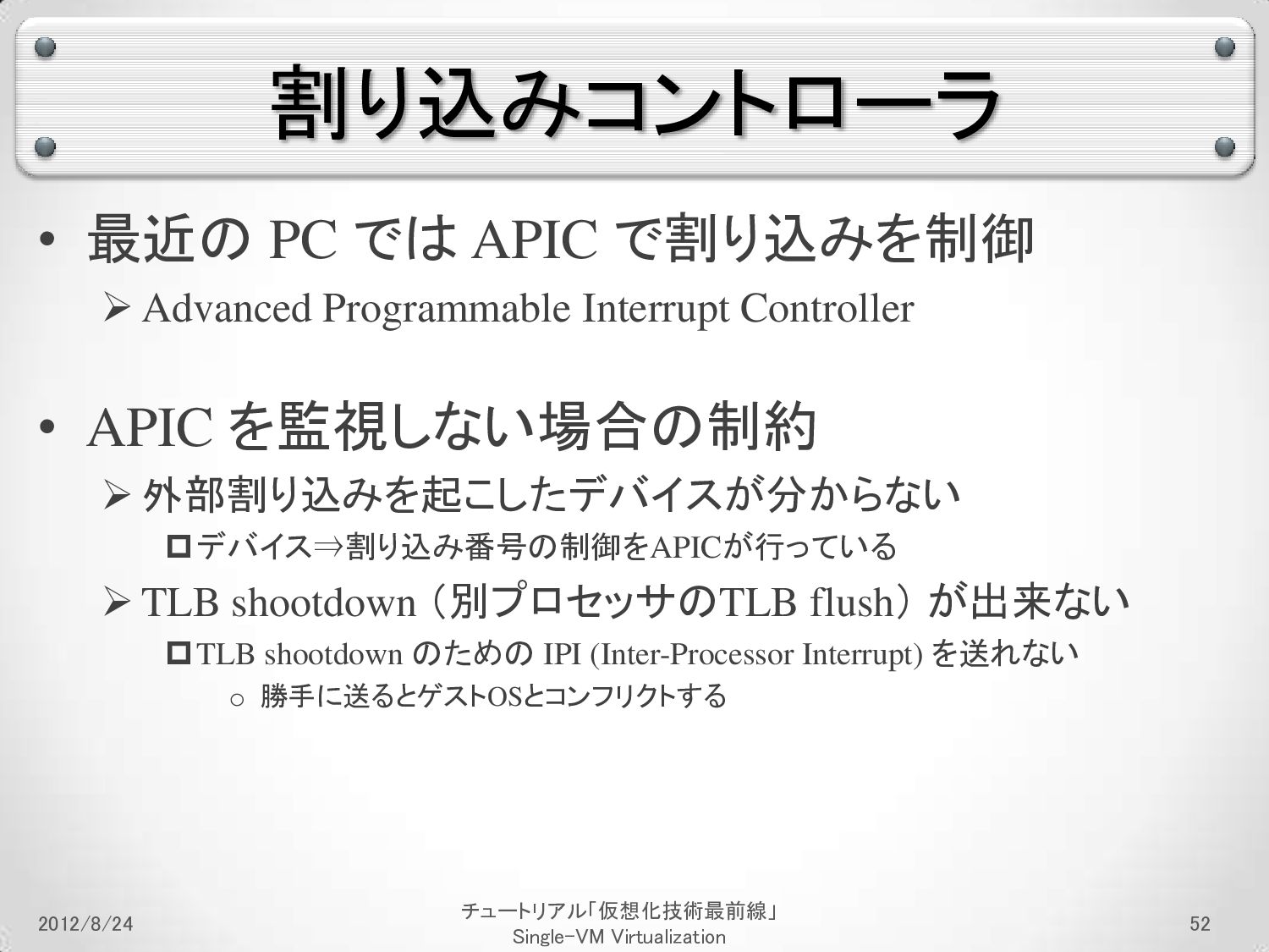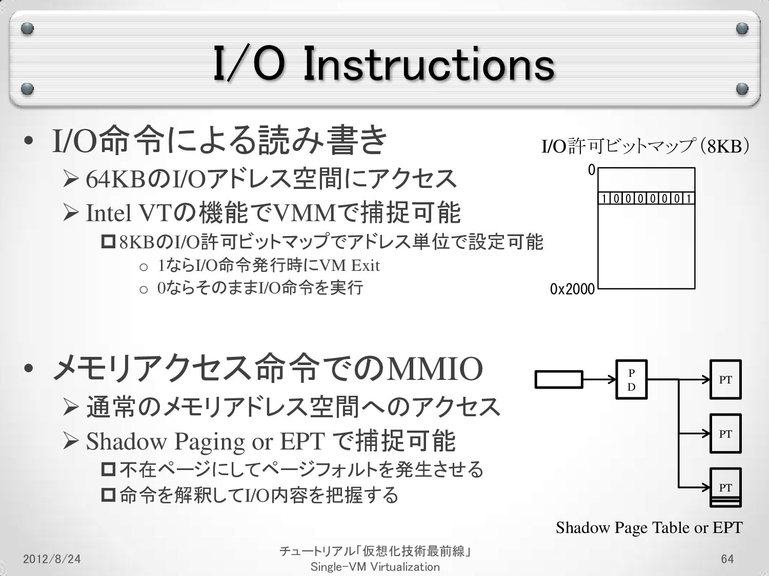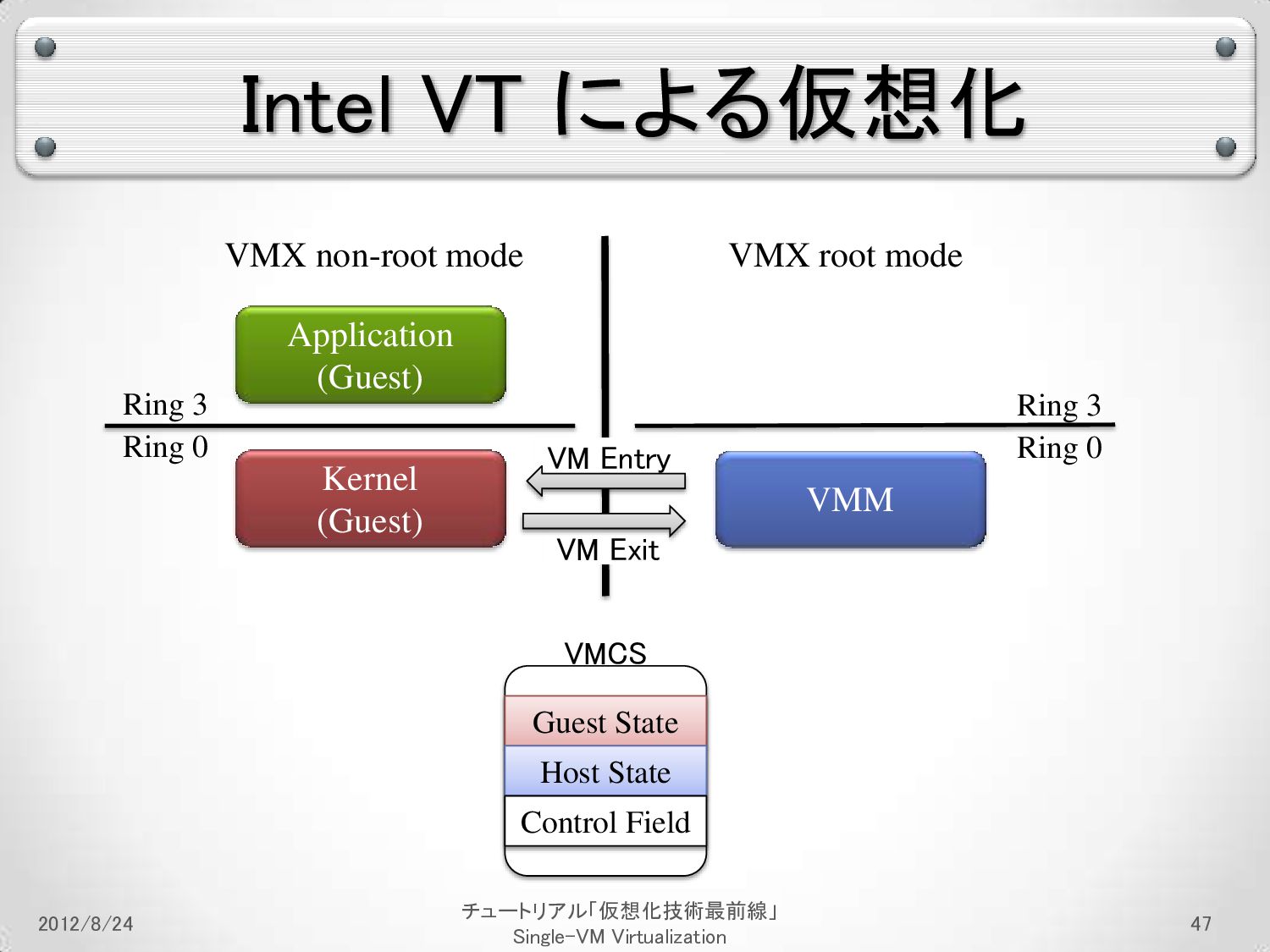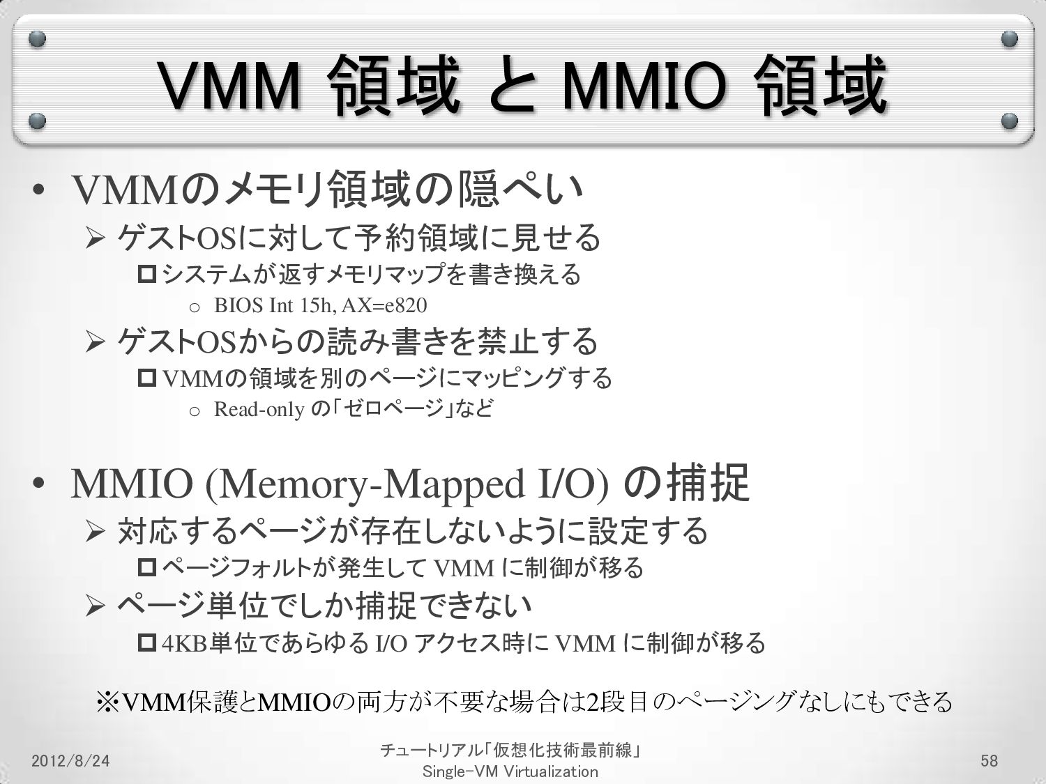 INVD, XSETBV • 設定により VM Exit が発生する条件 割り込み関係 o 外部割り込み,NMI, VMX preemption timer システムレジスタへのアクセス o CR3, CR8, RDMPC, RDTSC, RDRAND, MSR, DR, Descriptor table, APIC, ... 制御関係 o MONITOR, PAUSE, HLT, MWAIT, ... メモリ関係 o INVLPG, WBINVD, Enable INVPCID, enable VPID I/O関係 o Unconditional I/O, Use I/O bitmaps 2012/8/24 チュートリアル「仮想化技術最前線」 Single-VM Virtualization 49