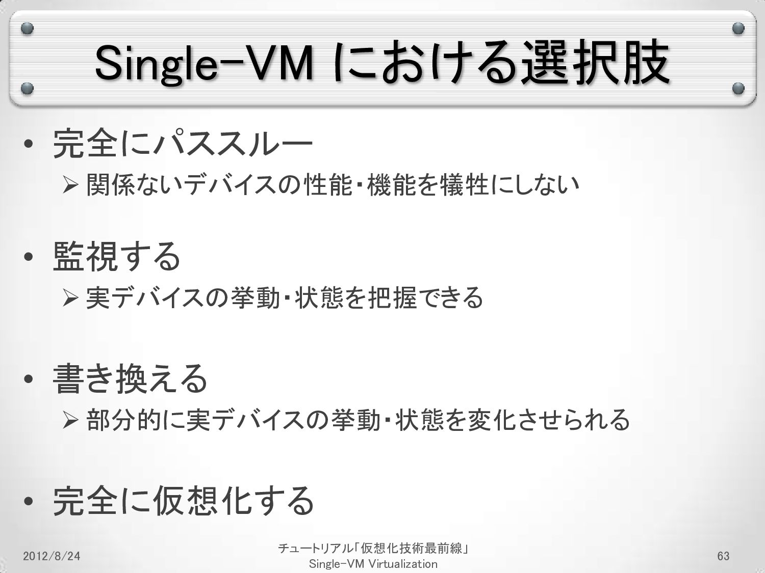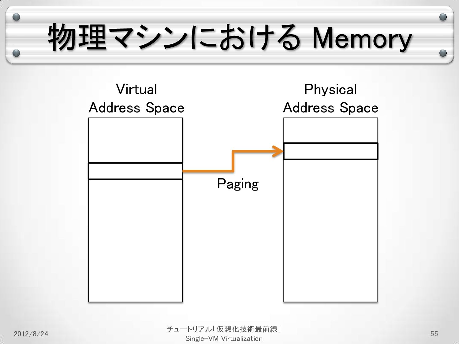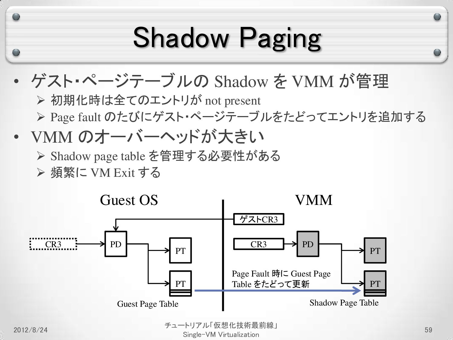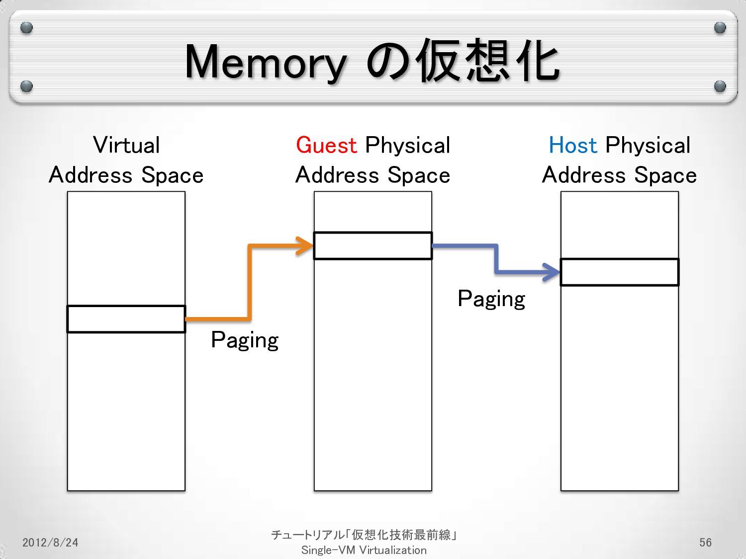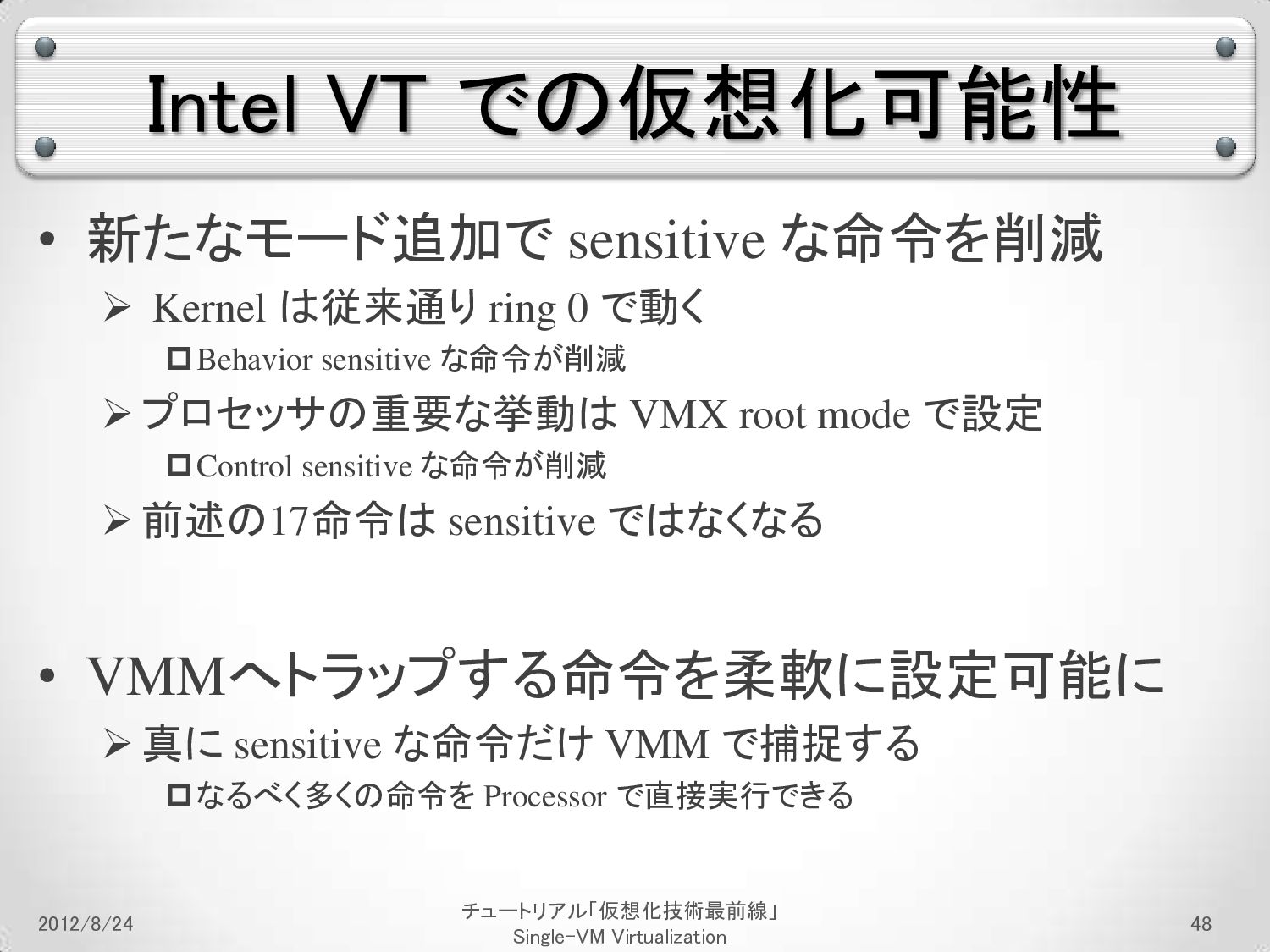 INVD, XSETBV • 設定により VM Exit が発生する条件 割り込み関係 o 外部割り込み,NMI, VMX preemption timer システムレジスタへのアクセス o CR3, CR8, RDMPC, RDTSC, RDRAND, MSR, DR, Descriptor table, APIC, ... 制御関係 o MONITOR, PAUSE, HLT, MWAIT, ... メモリ関係 o INVLPG, WBINVD, Enable INVPCID, enable VPID I/O関係 o Unconditional I/O, Use I/O bitmaps 2012/8/24 チュートリアル「仮想化技術最前線」 Single-VM Virtualization 49