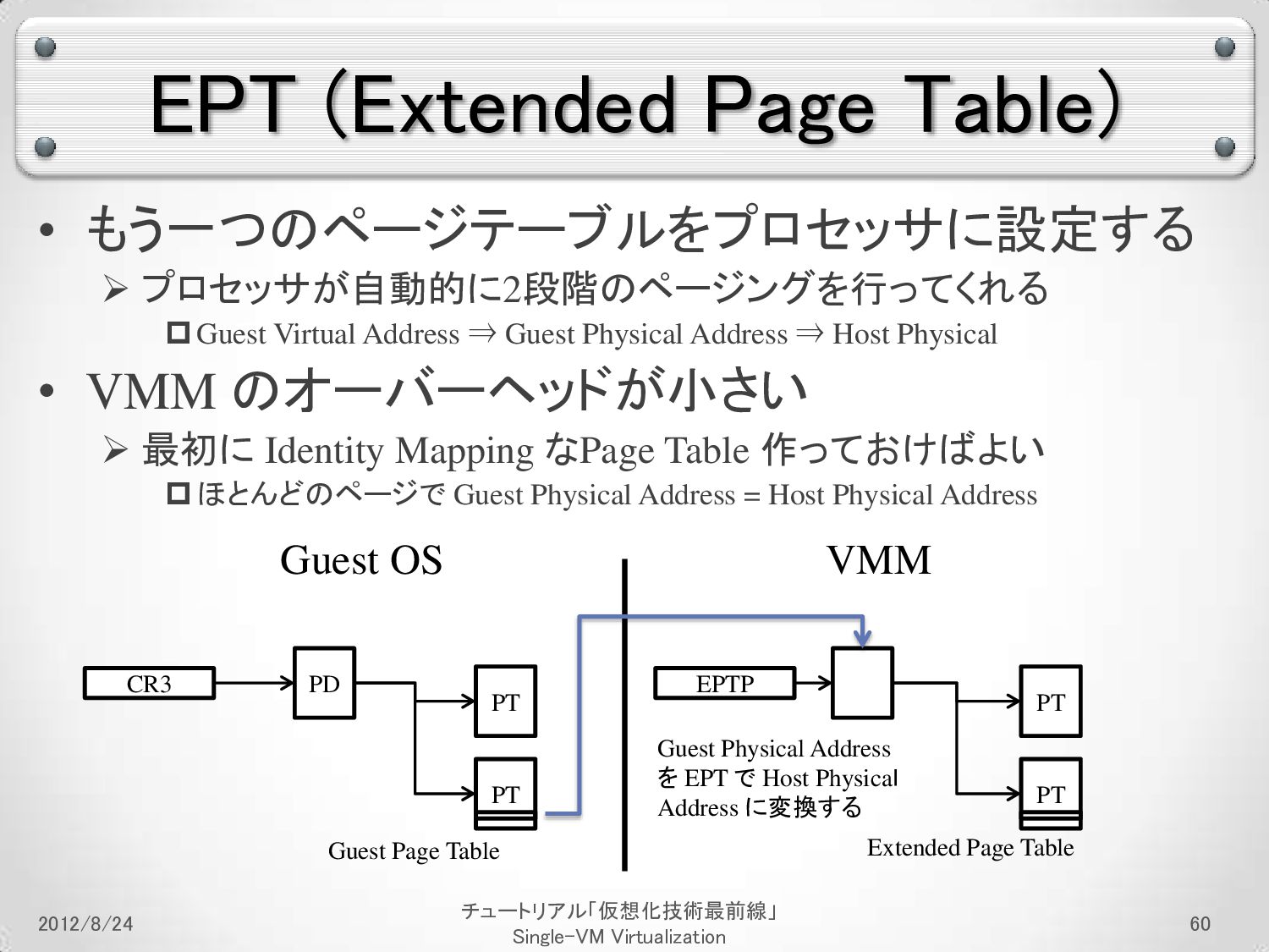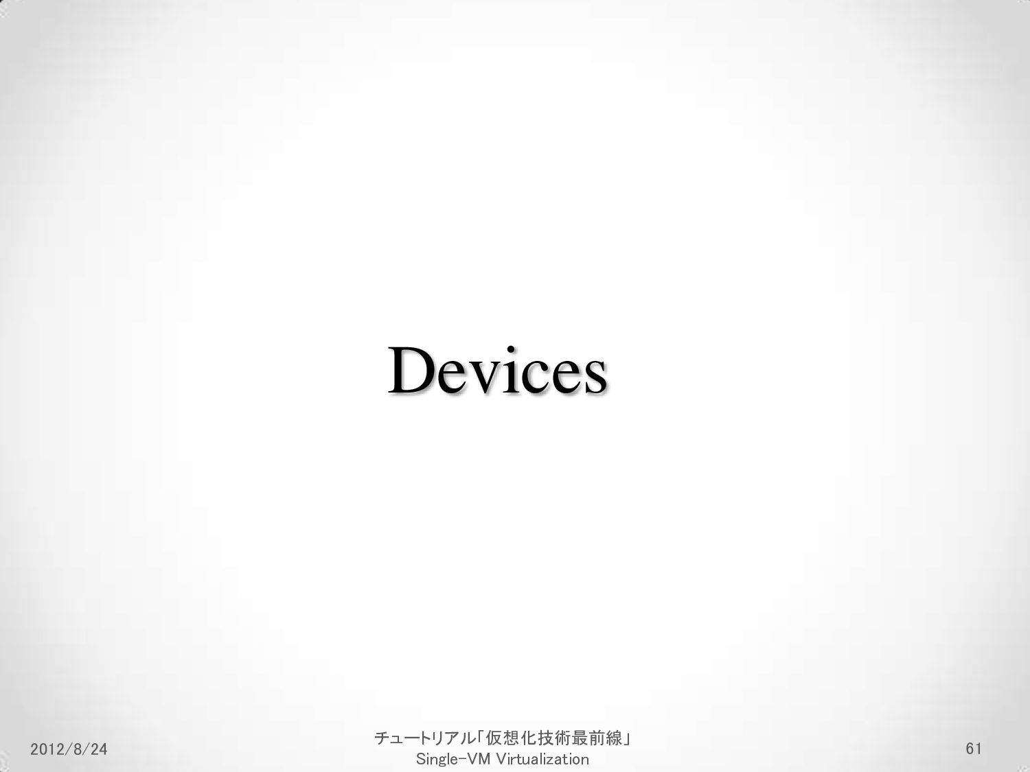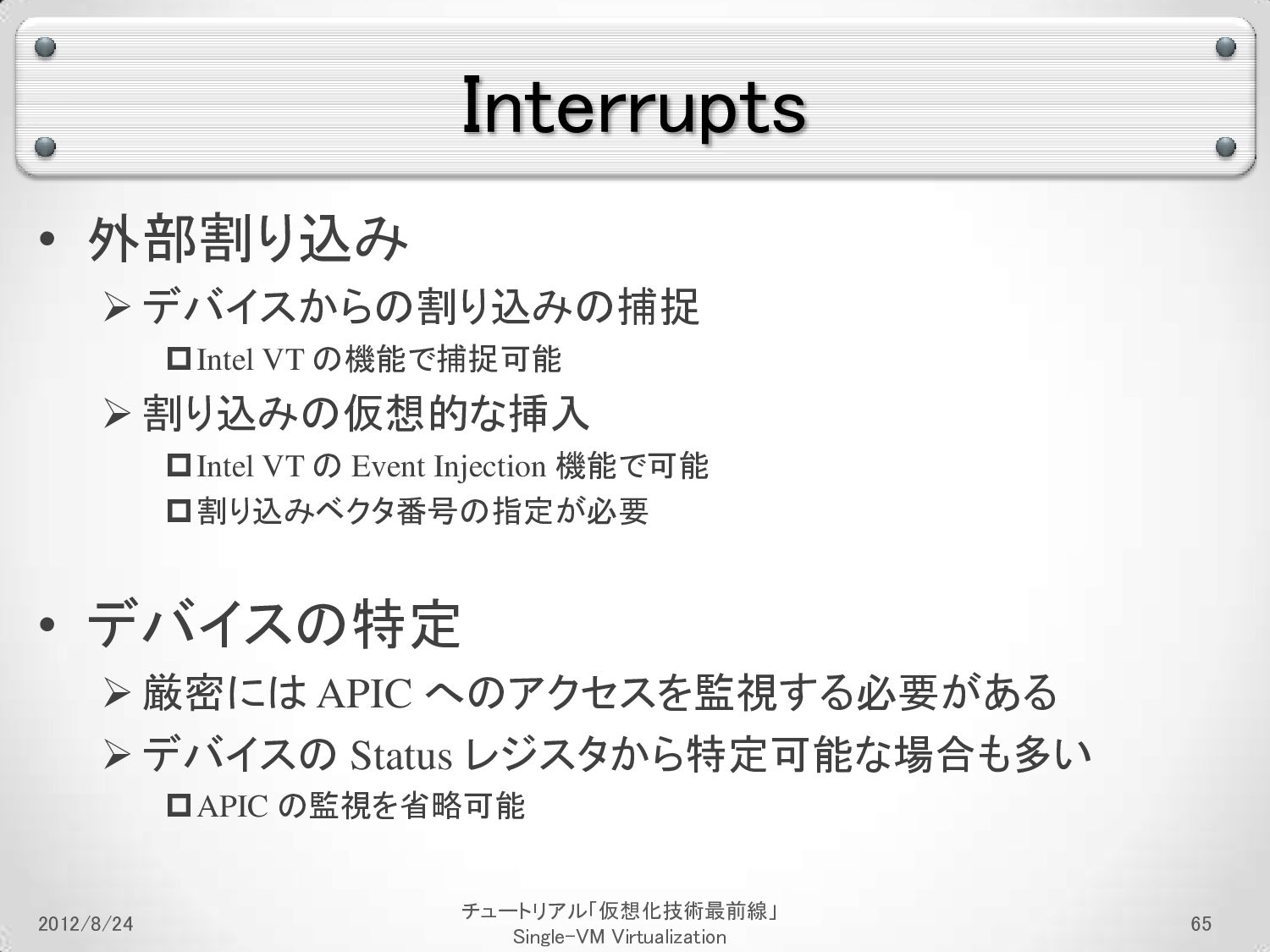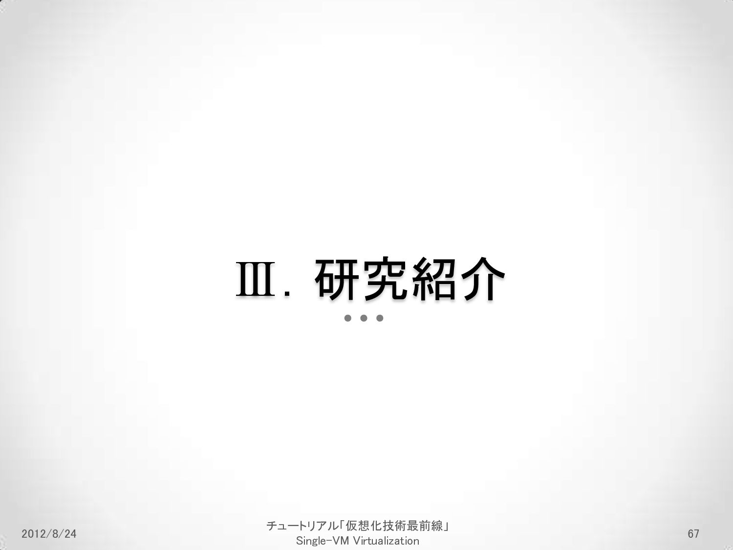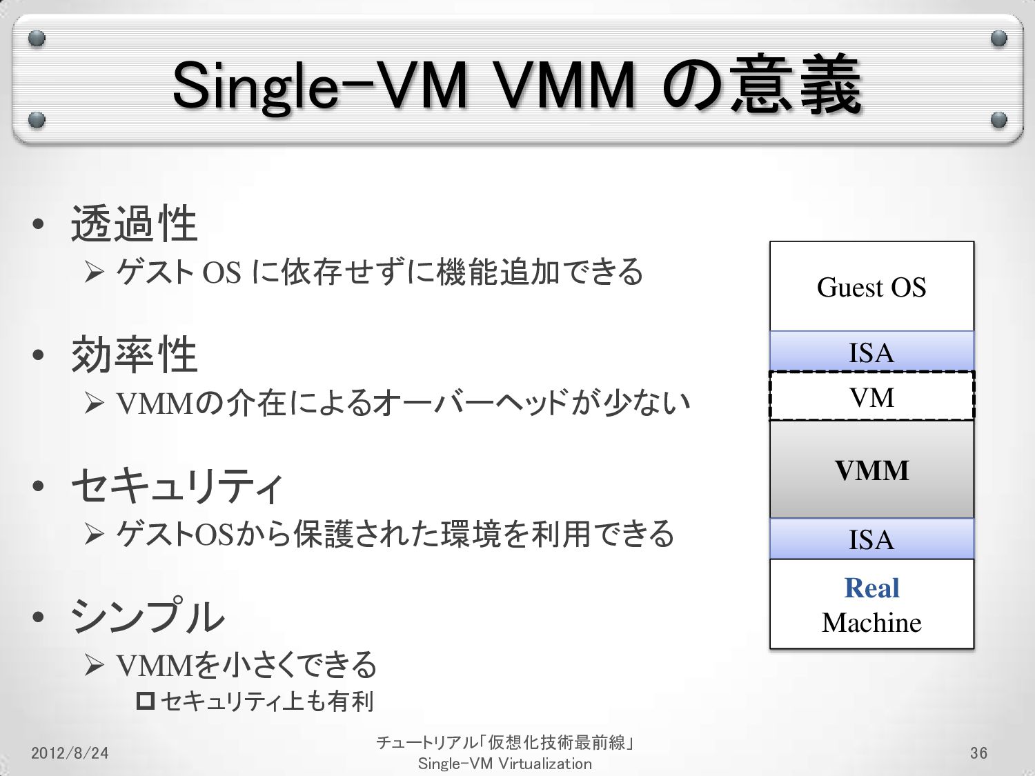 INVD, XSETBV • 設定により VM Exit が発生する条件 割り込み関係 o 外部割り込み,NMI, VMX preemption timer システムレジスタへのアクセス o CR3, CR8, RDMPC, RDTSC, RDRAND, MSR, DR, Descriptor table, APIC, ... 制御関係 o MONITOR, PAUSE, HLT, MWAIT, ... メモリ関係 o INVLPG, WBINVD, Enable INVPCID, enable VPID I/O関係 o Unconditional I/O, Use I/O bitmaps 2012/8/24 チュートリアル「仮想化技術最前線」 Single-VM Virtualization 49