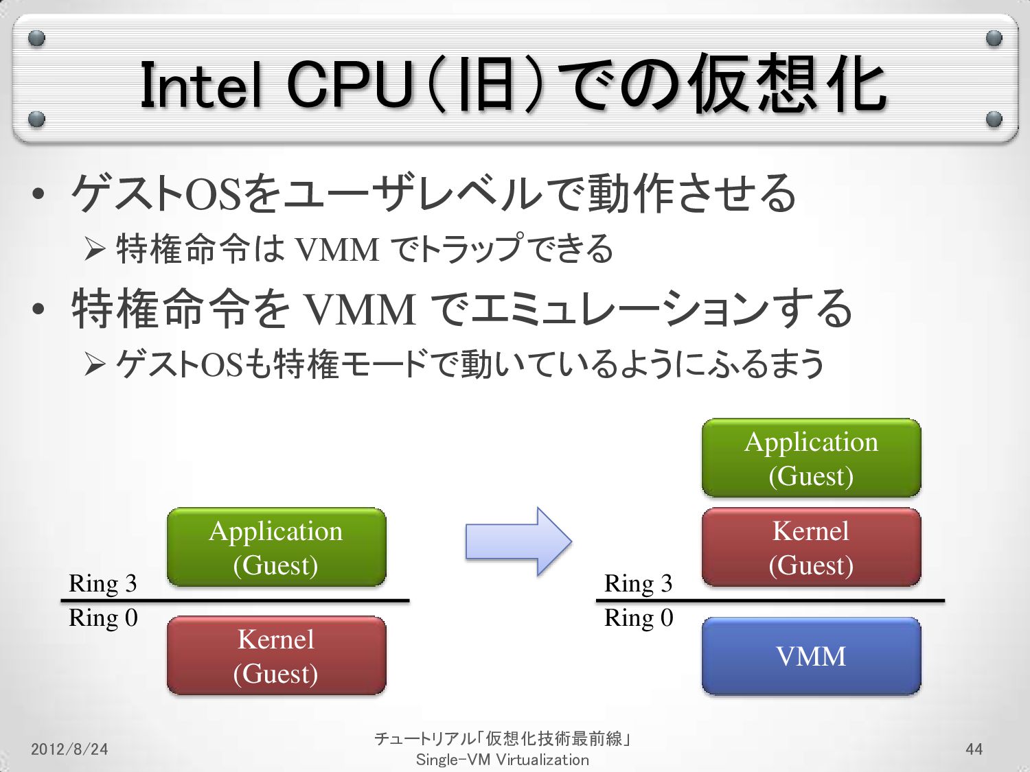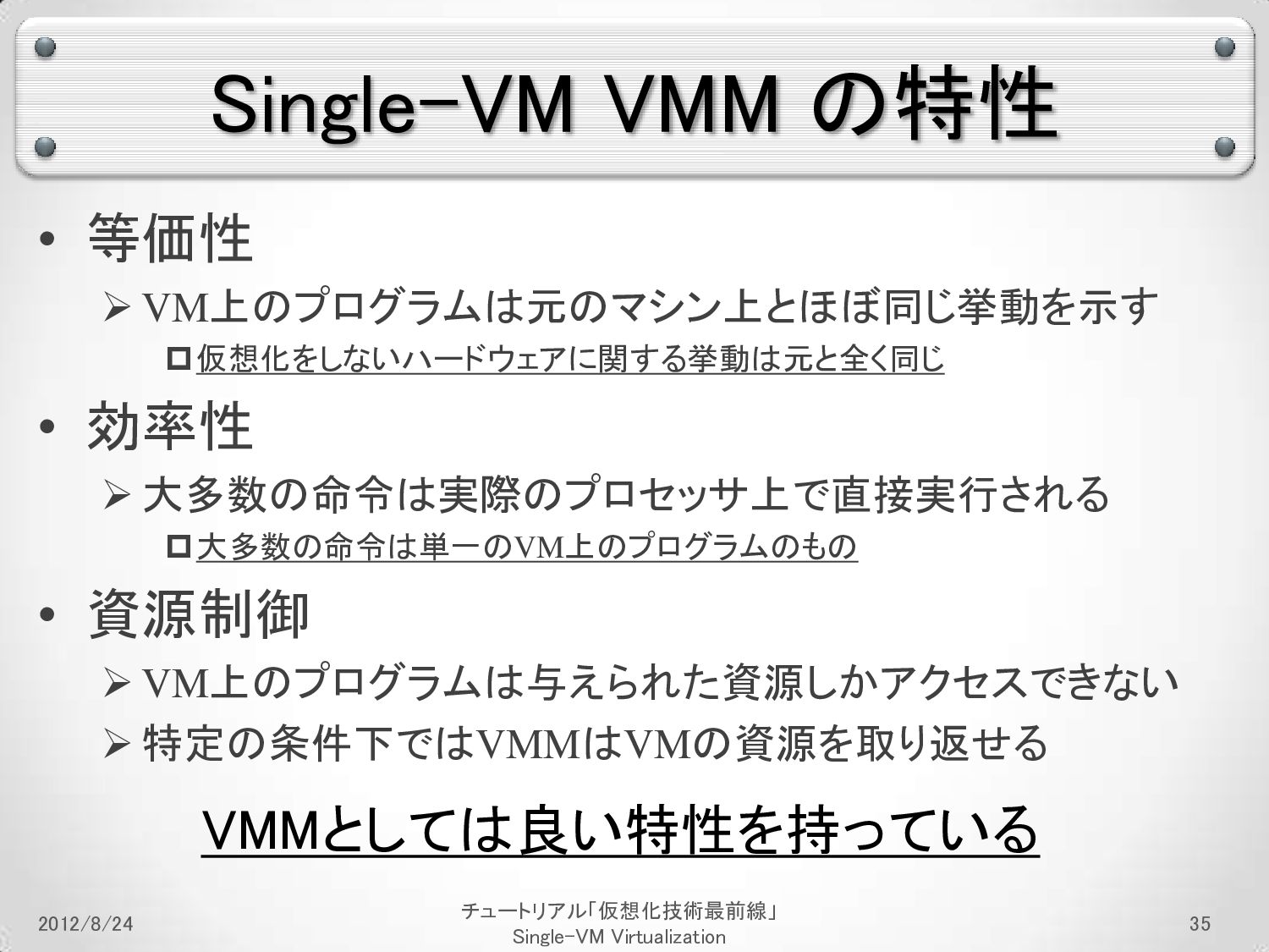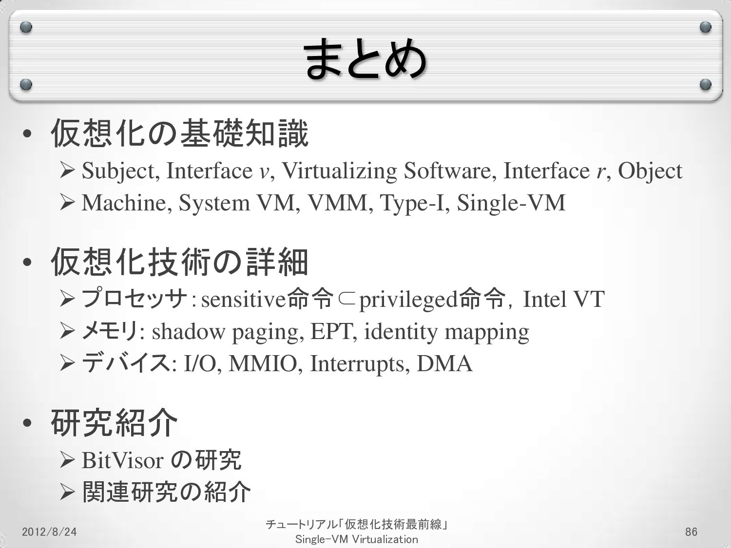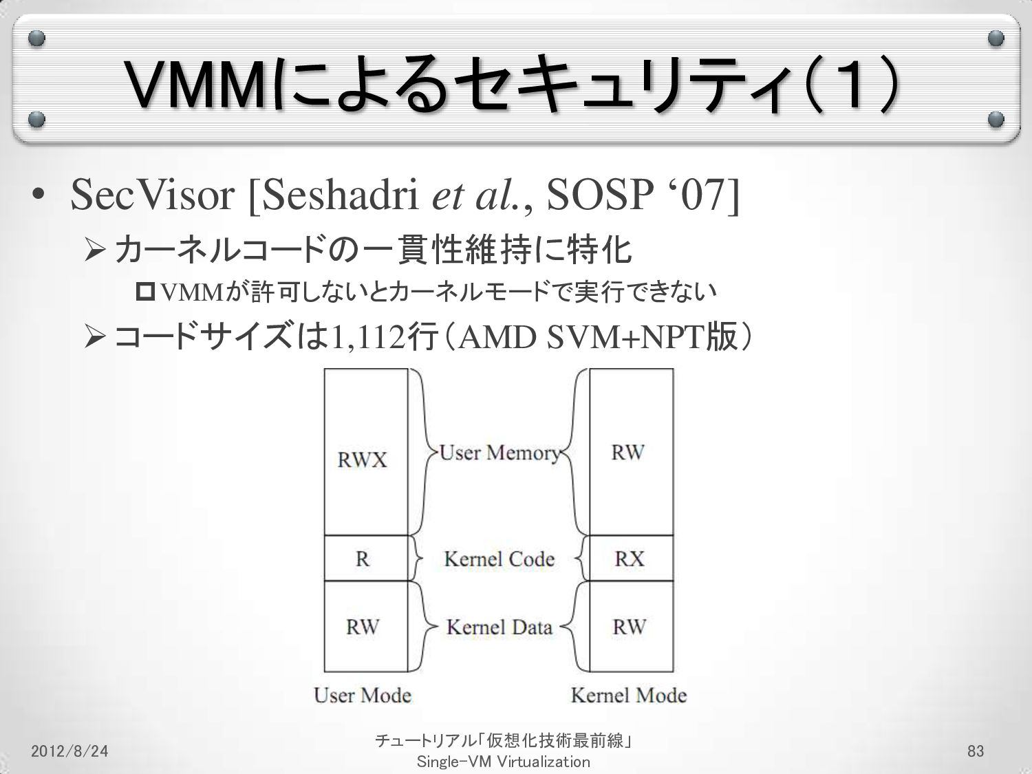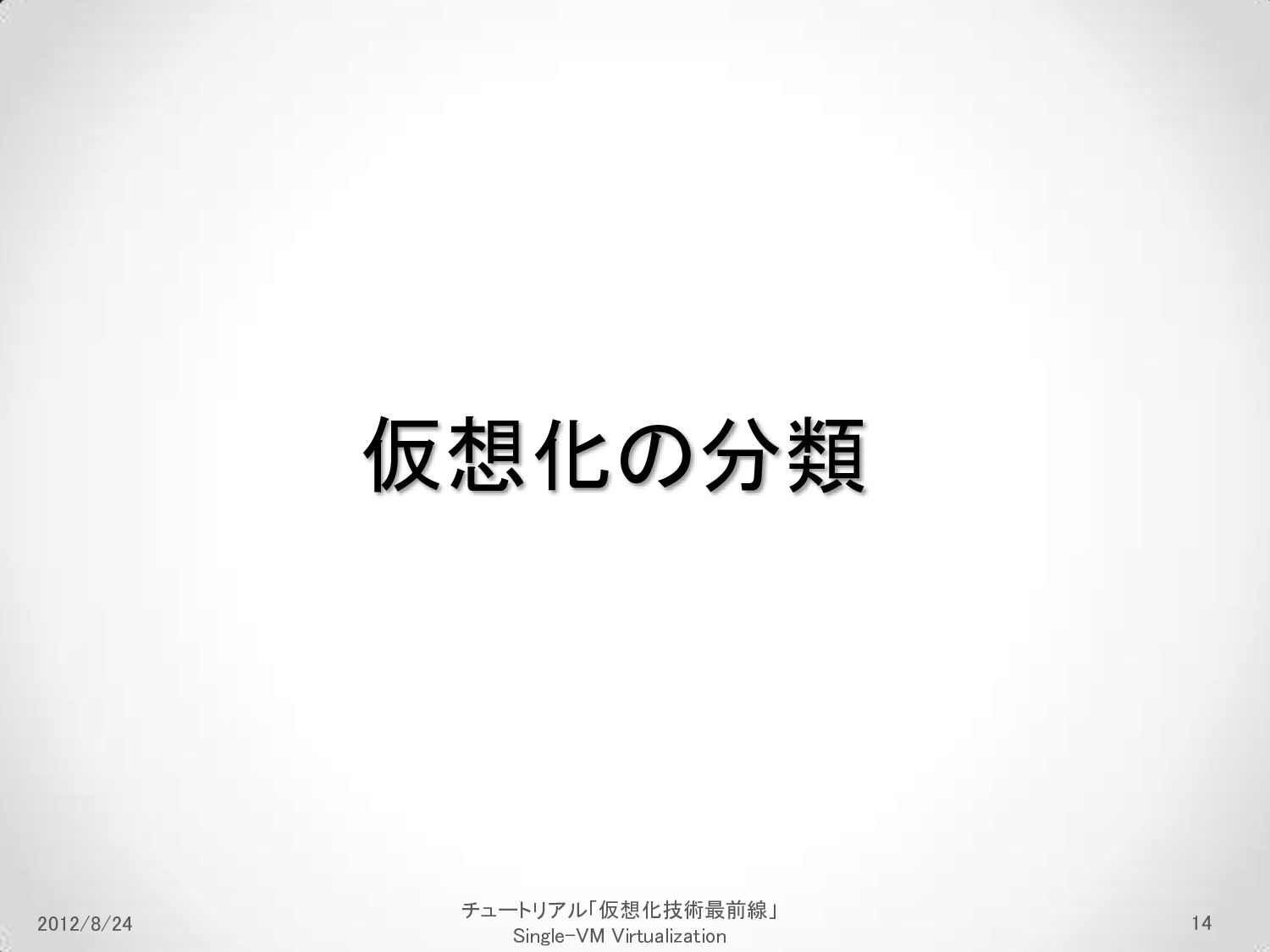 INVD, XSETBV • 設定により VM Exit が発生する条件 割り込み関係 o 外部割り込み,NMI, VMX preemption timer システムレジスタへのアクセス o CR3, CR8, RDMPC, RDTSC, RDRAND, MSR, DR, Descriptor table, APIC, ... 制御関係 o MONITOR, PAUSE, HLT, MWAIT, ... メモリ関係 o INVLPG, WBINVD, Enable INVPCID, enable VPID I/O関係 o Unconditional I/O, Use I/O bitmaps 2012/8/24 チュートリアル「仮想化技術最前線」 Single-VM Virtualization 49