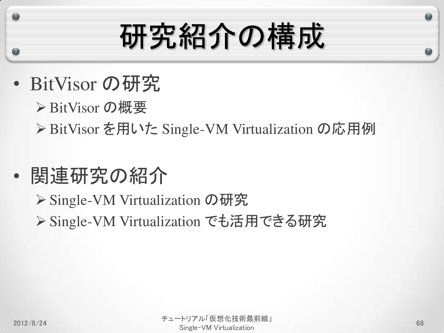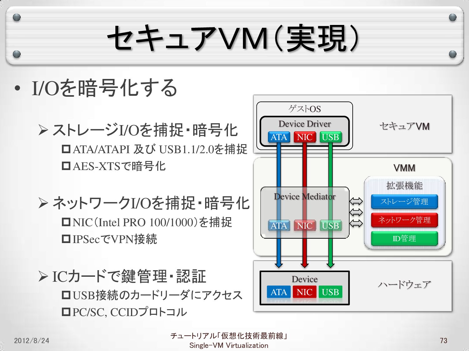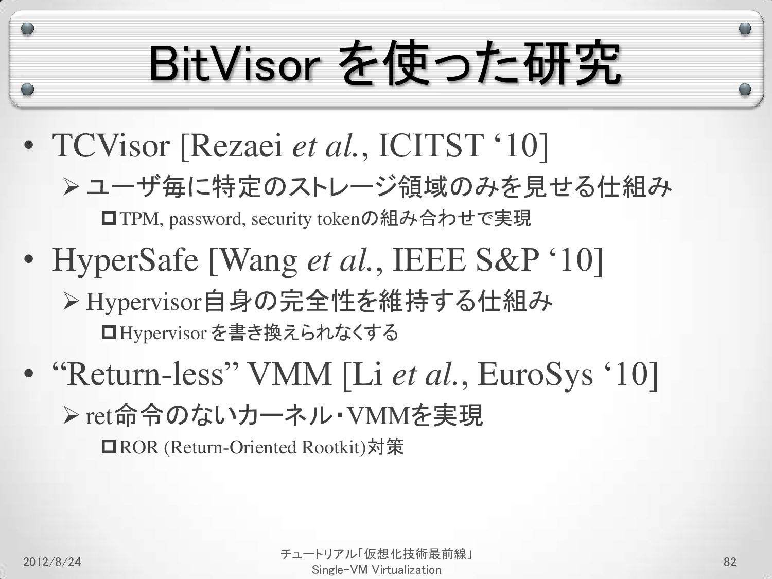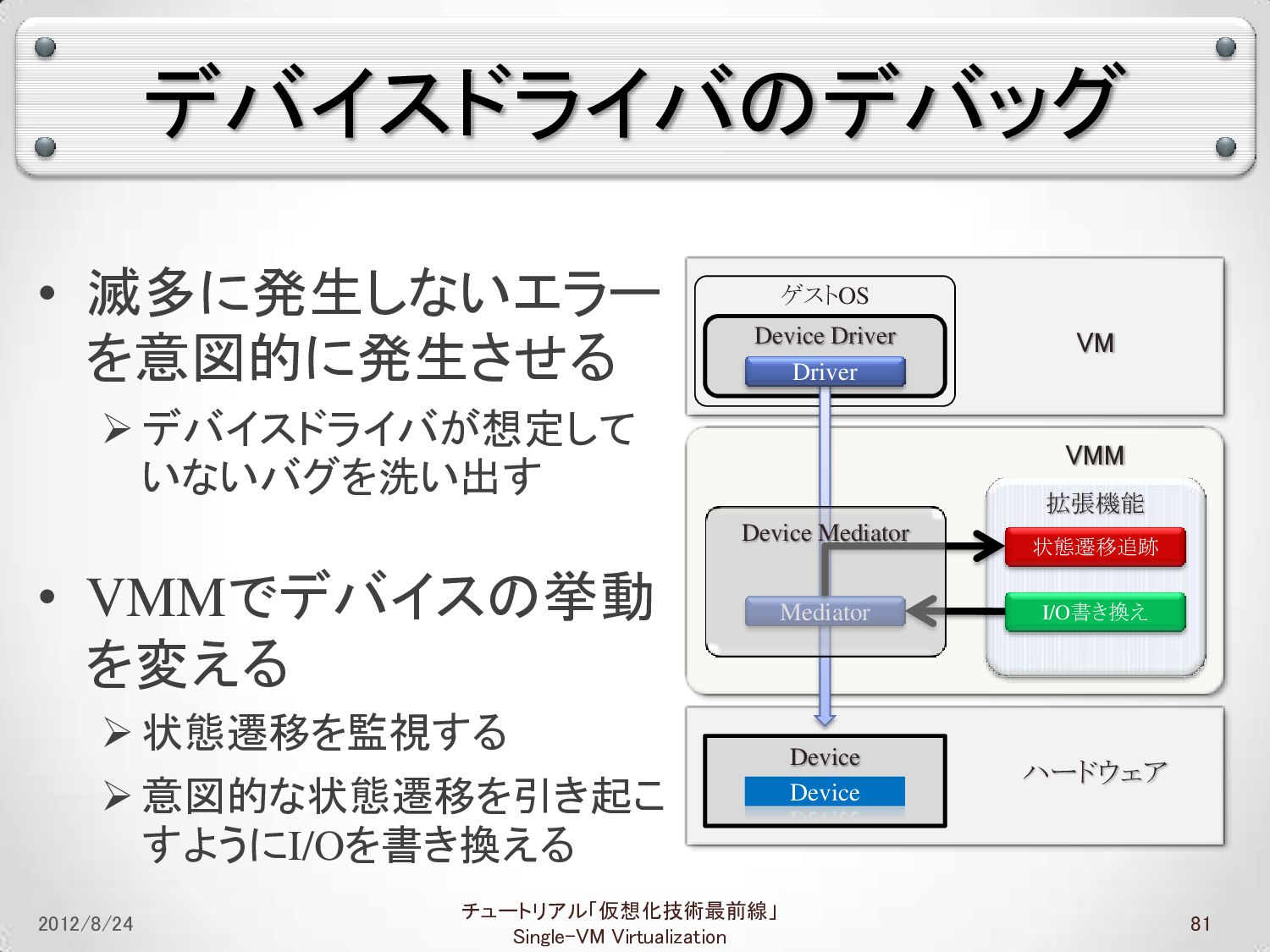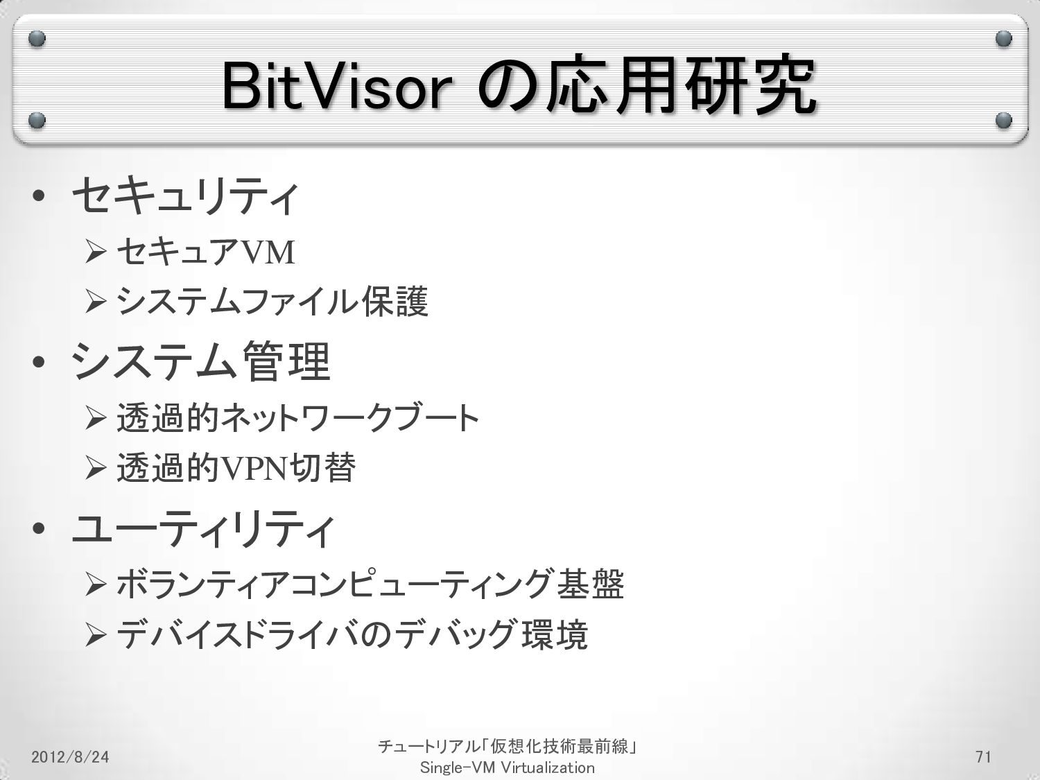 INVD, XSETBV • 設定により VM Exit が発生する条件 割り込み関係 o 外部割り込み,NMI, VMX preemption timer システムレジスタへのアクセス o CR3, CR8, RDMPC, RDTSC, RDRAND, MSR, DR, Descriptor table, APIC, ... 制御関係 o MONITOR, PAUSE, HLT, MWAIT, ... メモリ関係 o INVLPG, WBINVD, Enable INVPCID, enable VPID I/O関係 o Unconditional I/O, Use I/O bitmaps 2012/8/24 チュートリアル「仮想化技術最前線」 Single-VM Virtualization 49