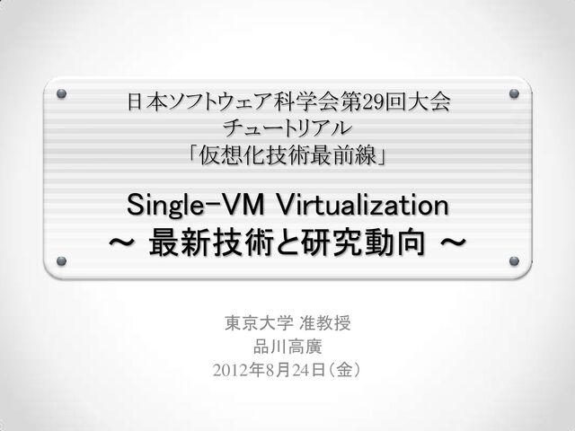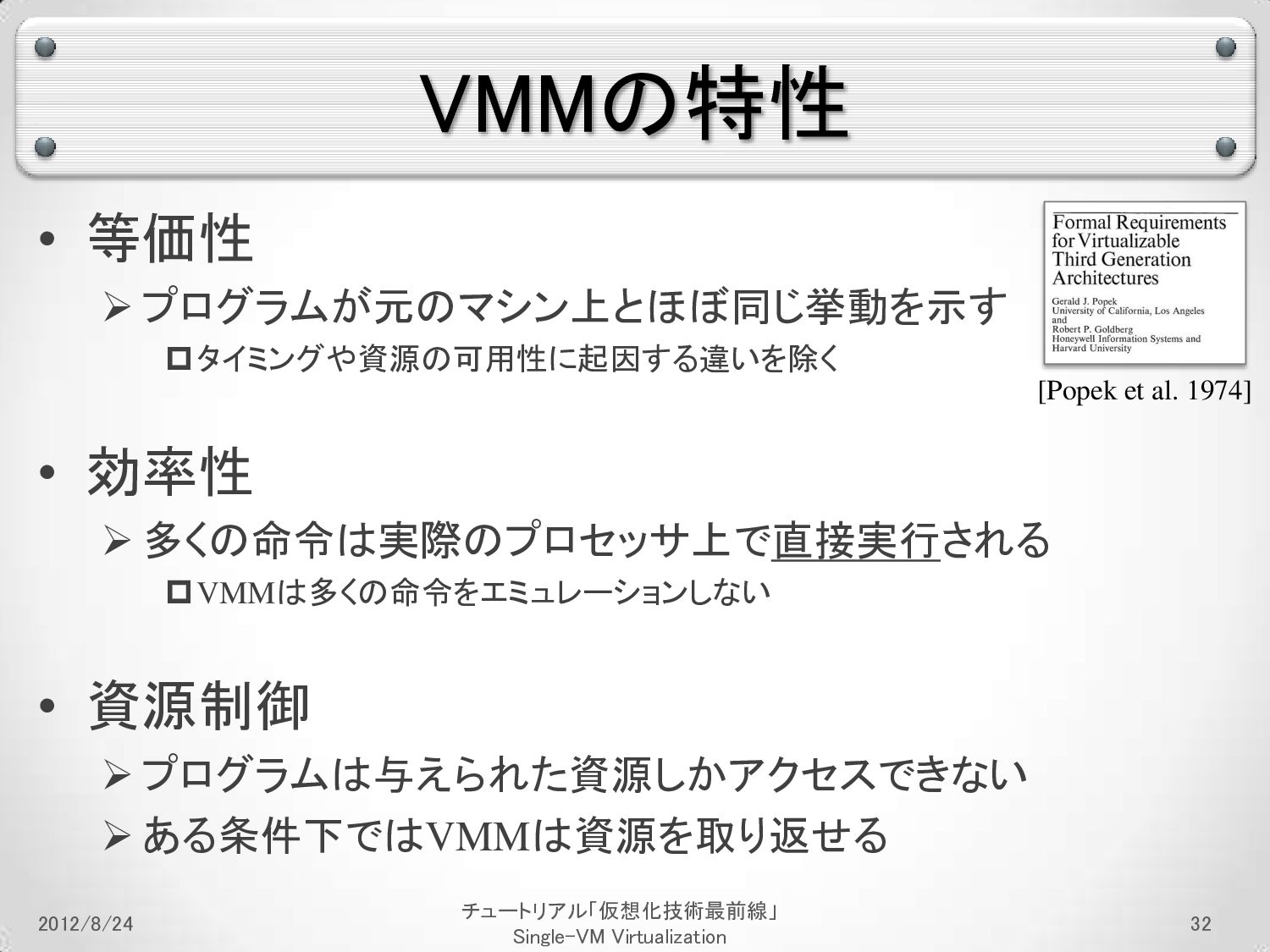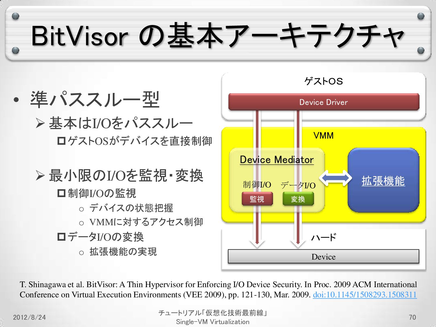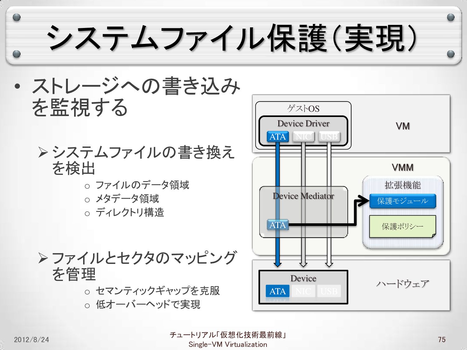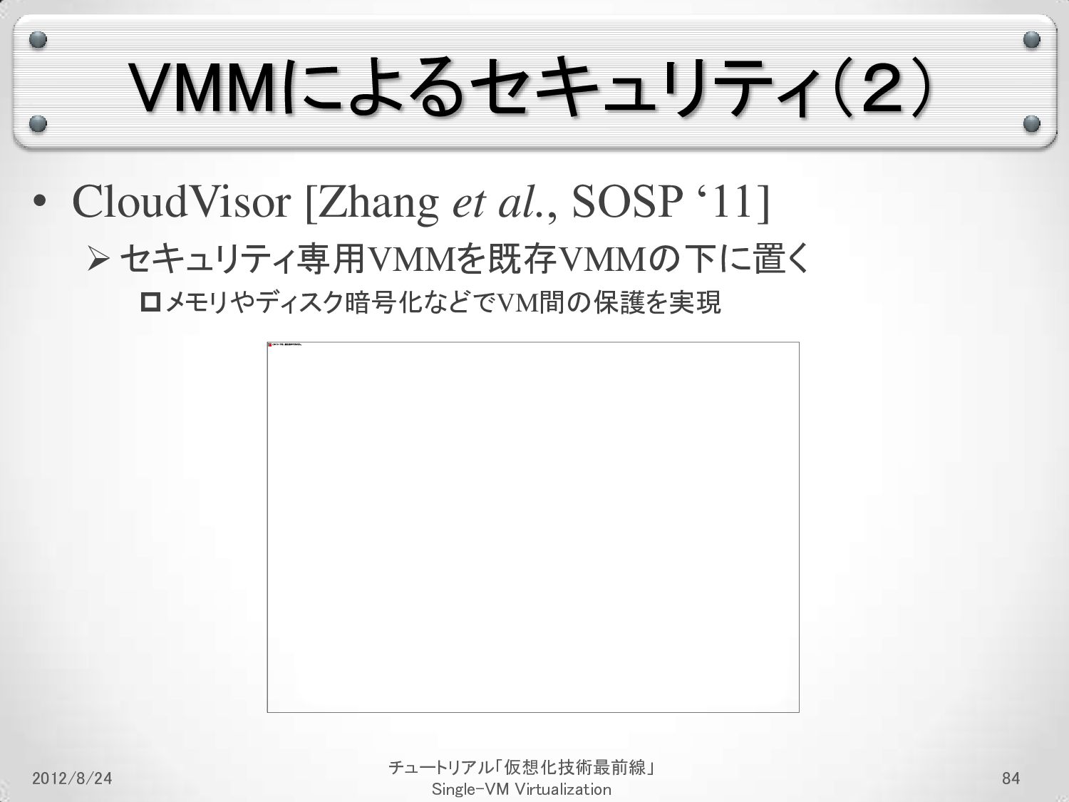 INVD, XSETBV • 設定により VM Exit が発生する条件 割り込み関係 o 外部割り込み,NMI, VMX preemption timer システムレジスタへのアクセス o CR3, CR8, RDMPC, RDTSC, RDRAND, MSR, DR, Descriptor table, APIC, ... 制御関係 o MONITOR, PAUSE, HLT, MWAIT, ... メモリ関係 o INVLPG, WBINVD, Enable INVPCID, enable VPID I/O関係 o Unconditional I/O, Use I/O bitmaps 2012/8/24 チュートリアル「仮想化技術最前線」 Single-VM Virtualization 49