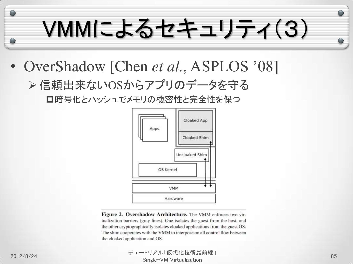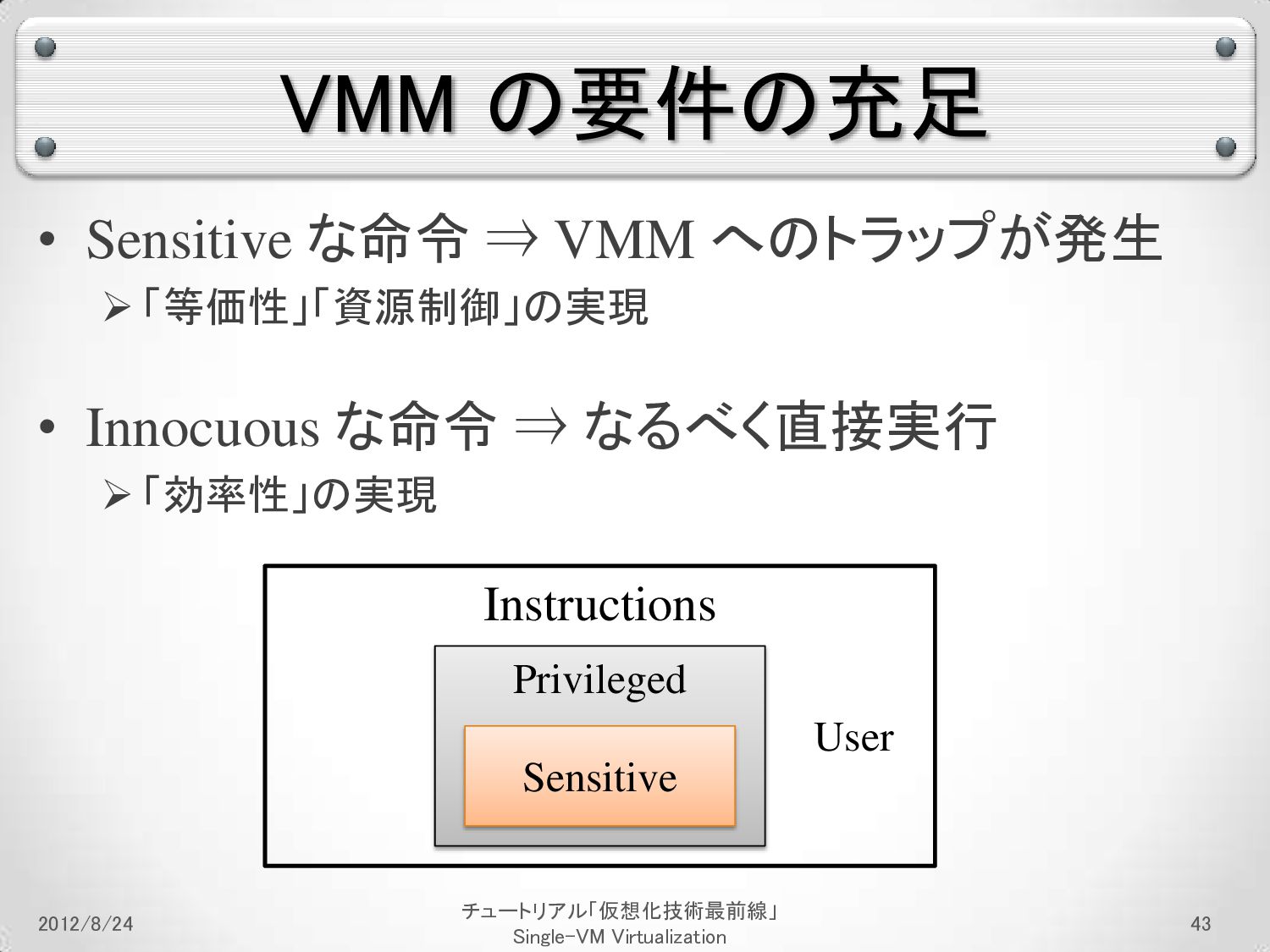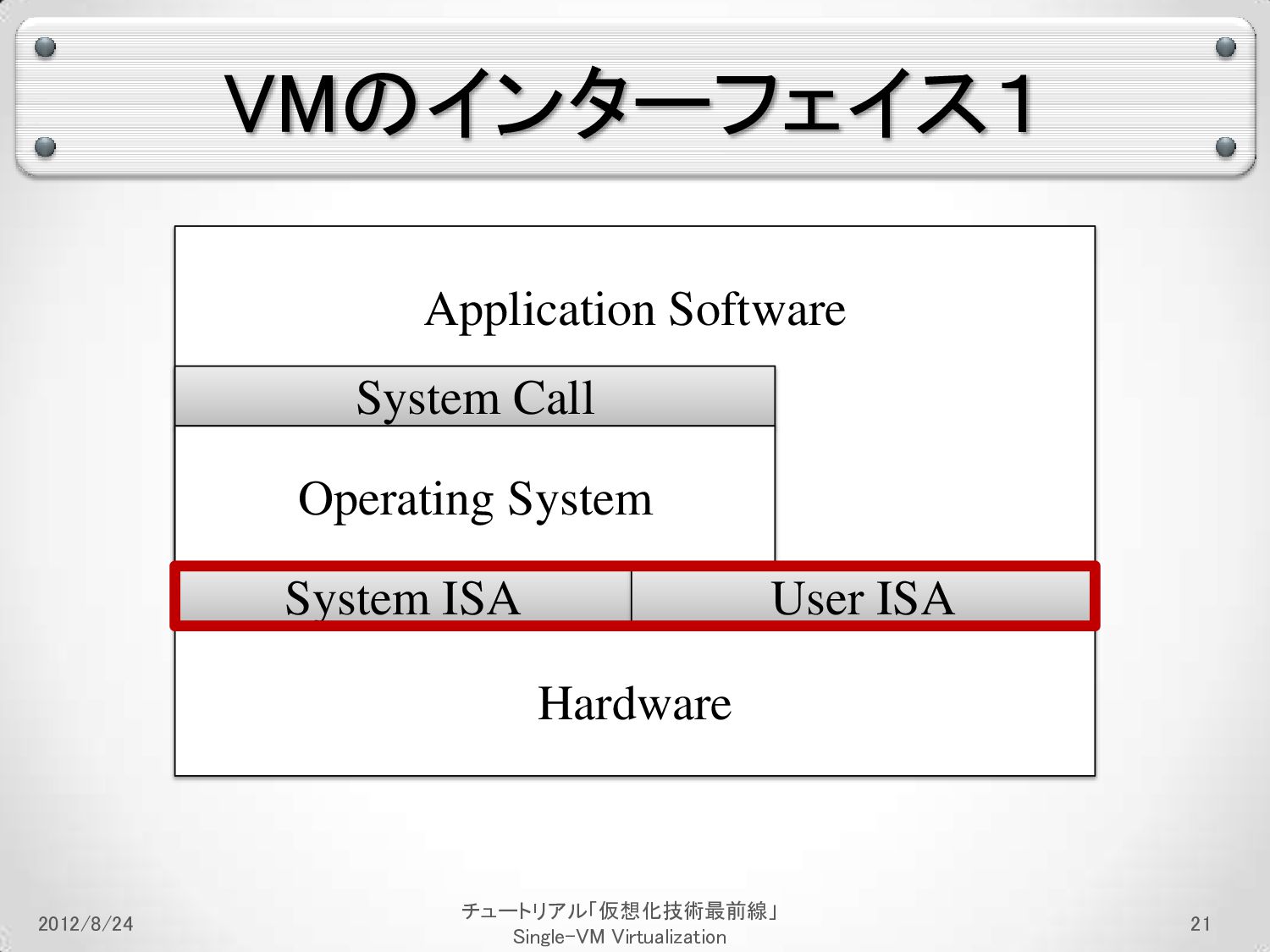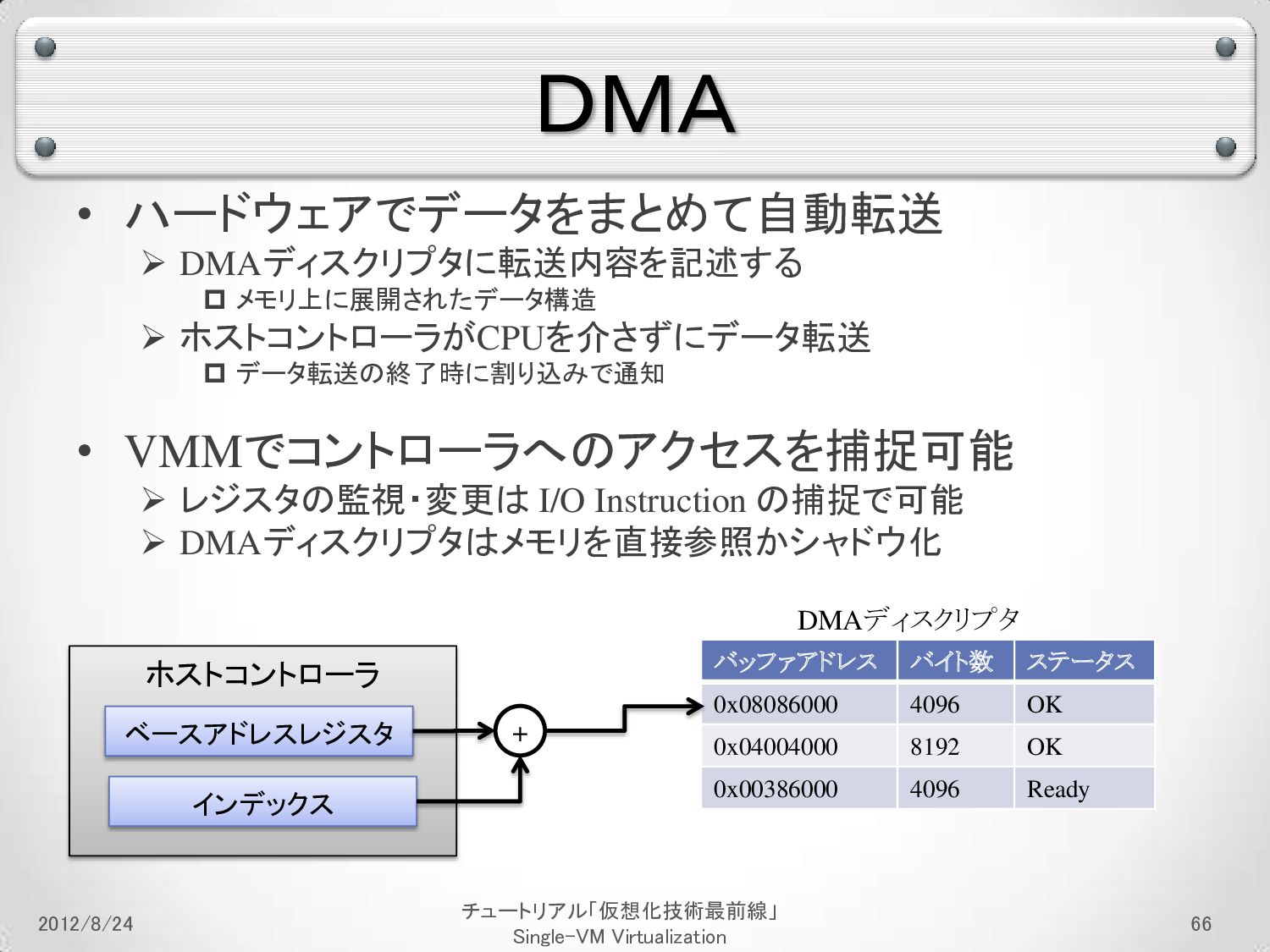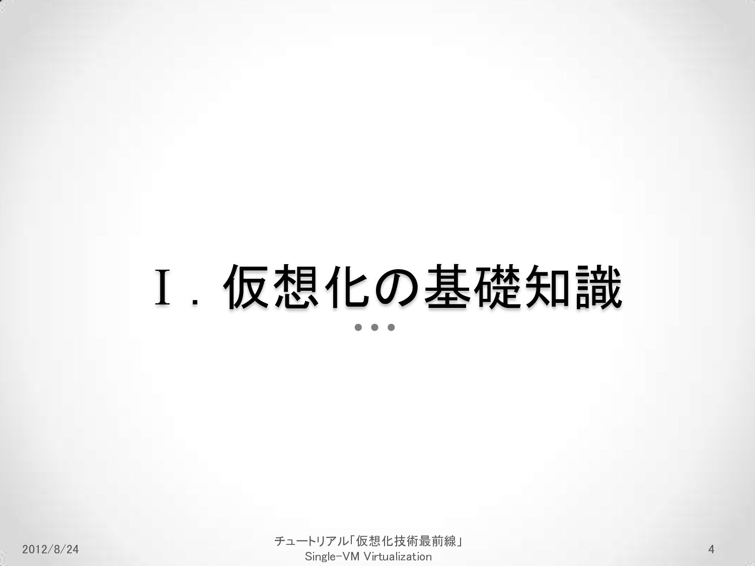INVD, XSETBV • 設定により VM Exit が発生する条件 割り込み関係 o 外部割り込み,NMI, VMX preemption timer システムレジスタへのアクセス o CR3, CR8, RDMPC, RDTSC, RDRAND, MSR, DR, Descriptor table, APIC, ... 制御関係 o MONITOR, PAUSE, HLT, MWAIT, ... メモリ関係 o INVLPG, WBINVD, Enable INVPCID, enable VPID I/O関係 o Unconditional I/O, Use I/O bitmaps 2012/8/24 チュートリアル「仮想化技術最前線」 Single-VM Virtualization 49
