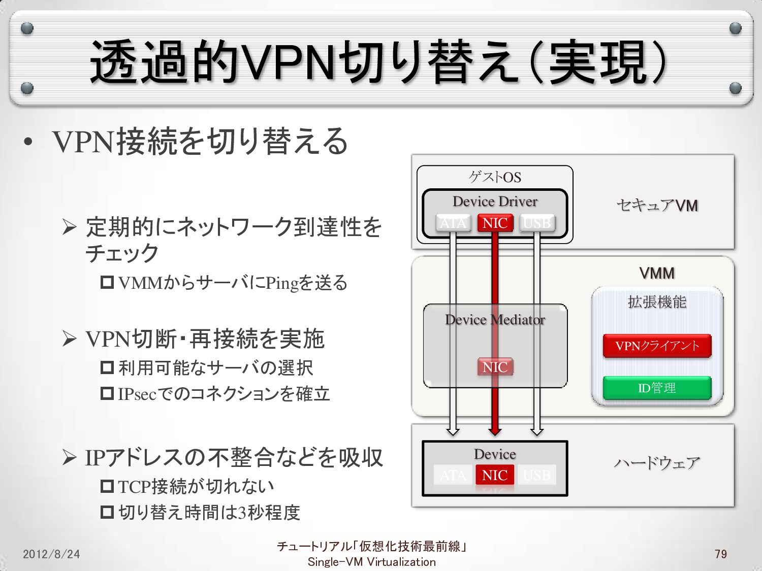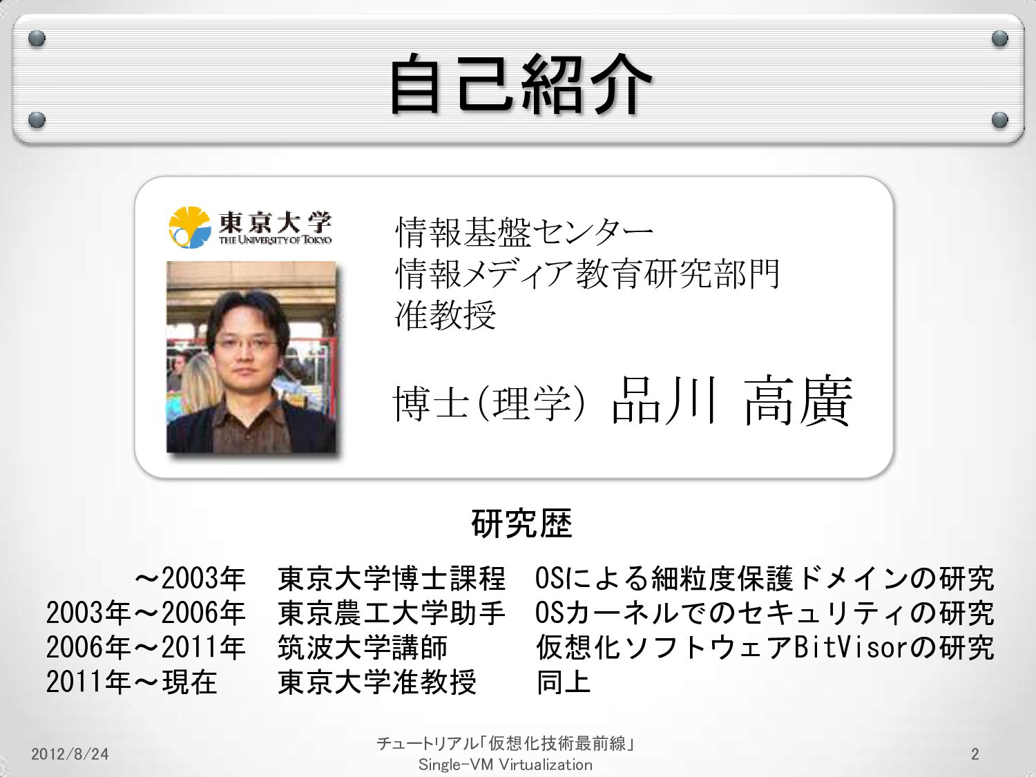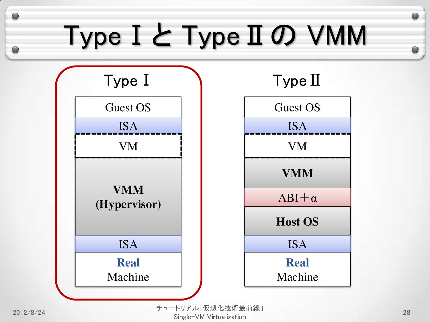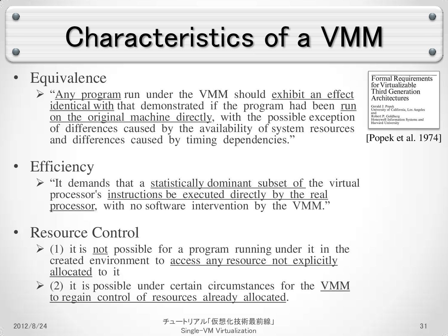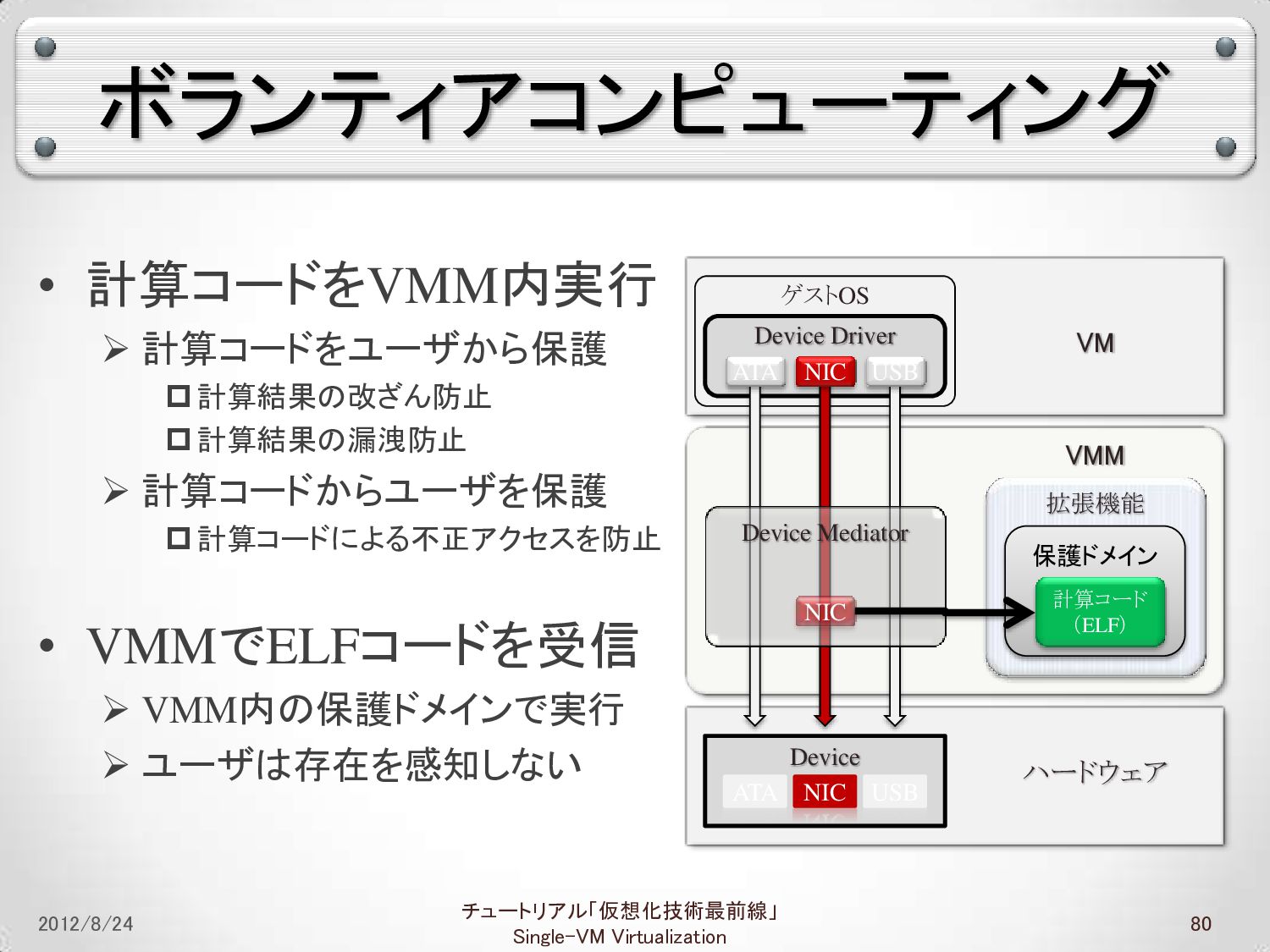 INVD, XSETBV • 設定により VM Exit が発生する条件 割り込み関係 o 外部割り込み,NMI, VMX preemption timer システムレジスタへのアクセス o CR3, CR8, RDMPC, RDTSC, RDRAND, MSR, DR, Descriptor table, APIC, ... 制御関係 o MONITOR, PAUSE, HLT, MWAIT, ... メモリ関係 o INVLPG, WBINVD, Enable INVPCID, enable VPID I/O関係 o Unconditional I/O, Use I/O bitmaps 2012/8/24 チュートリアル「仮想化技術最前線」 Single-VM Virtualization 49