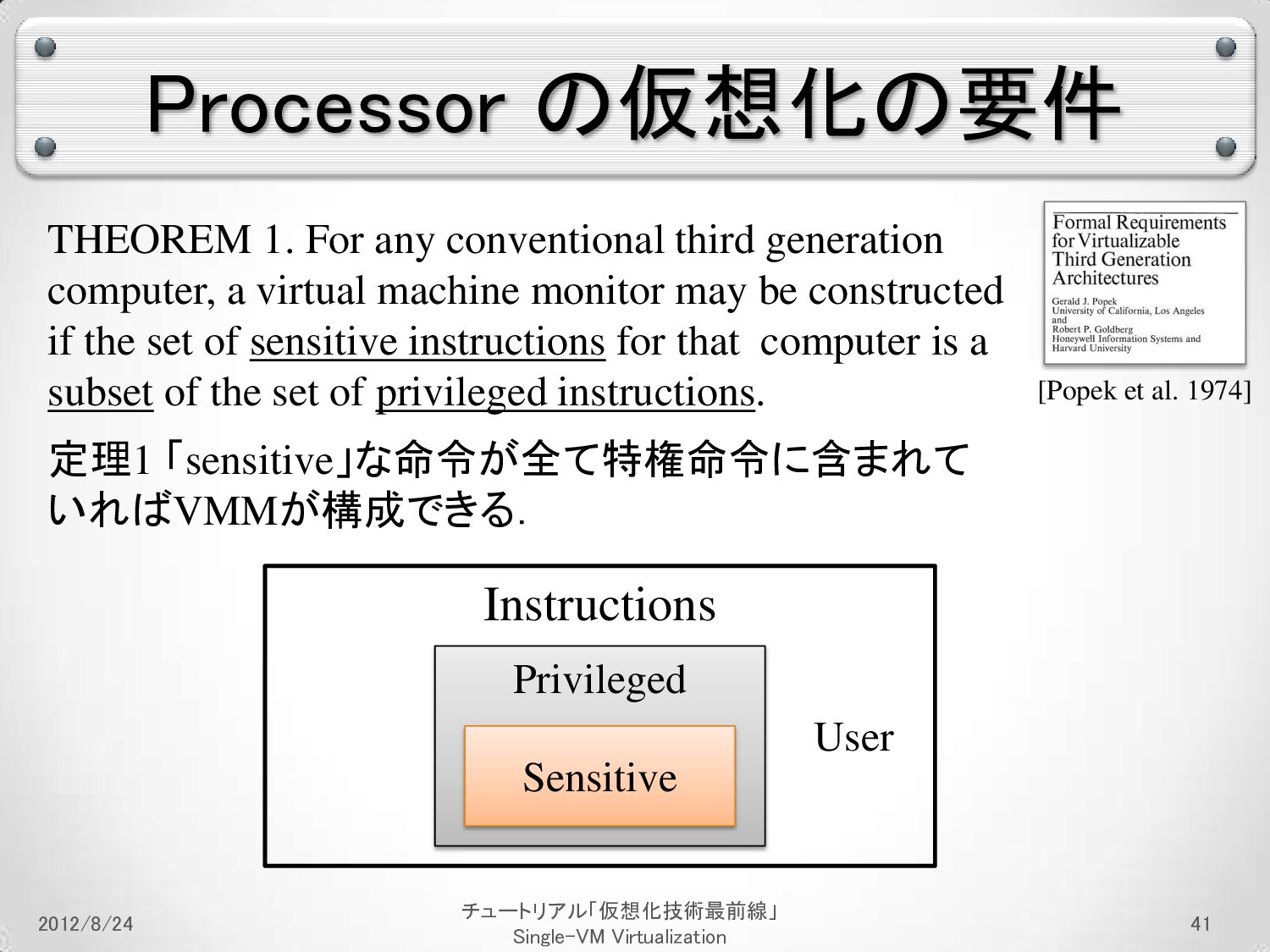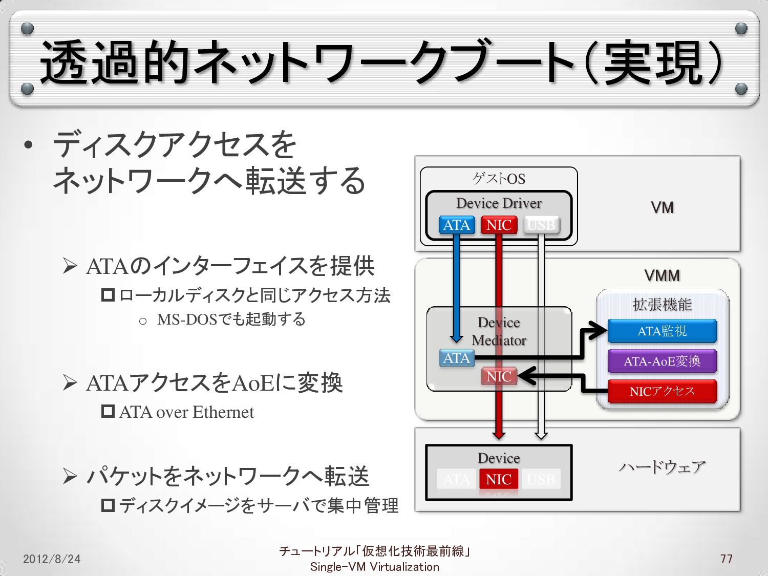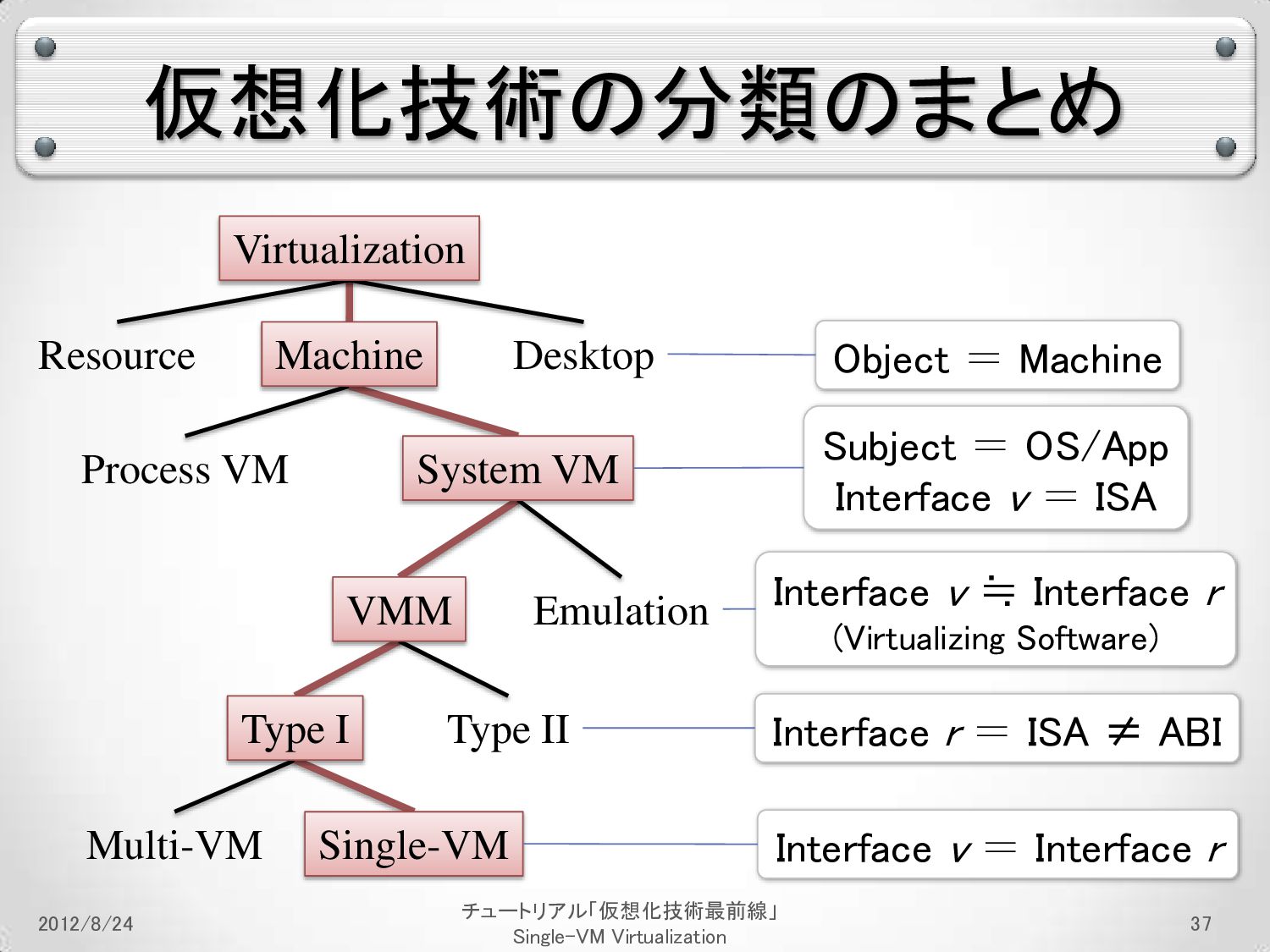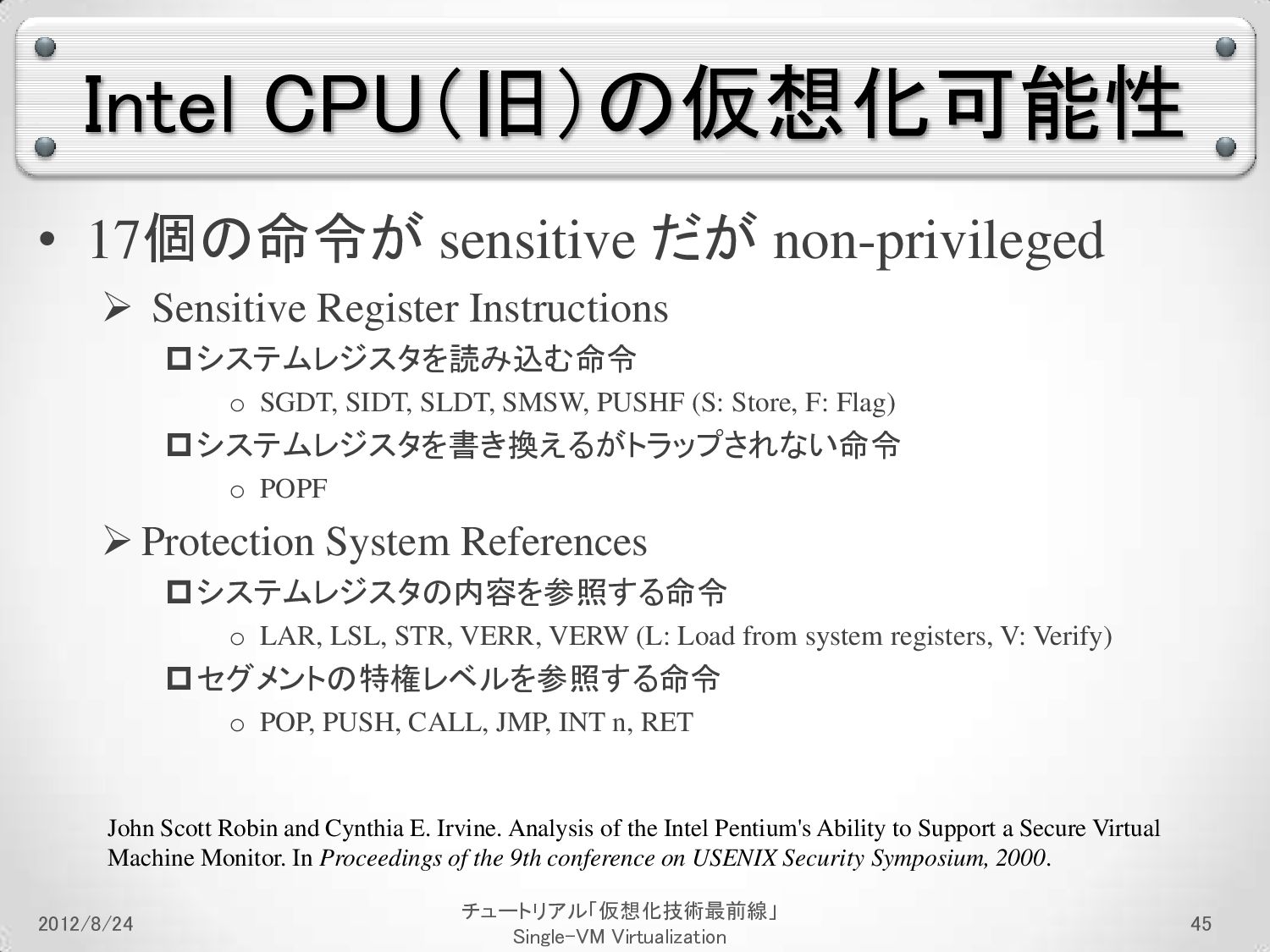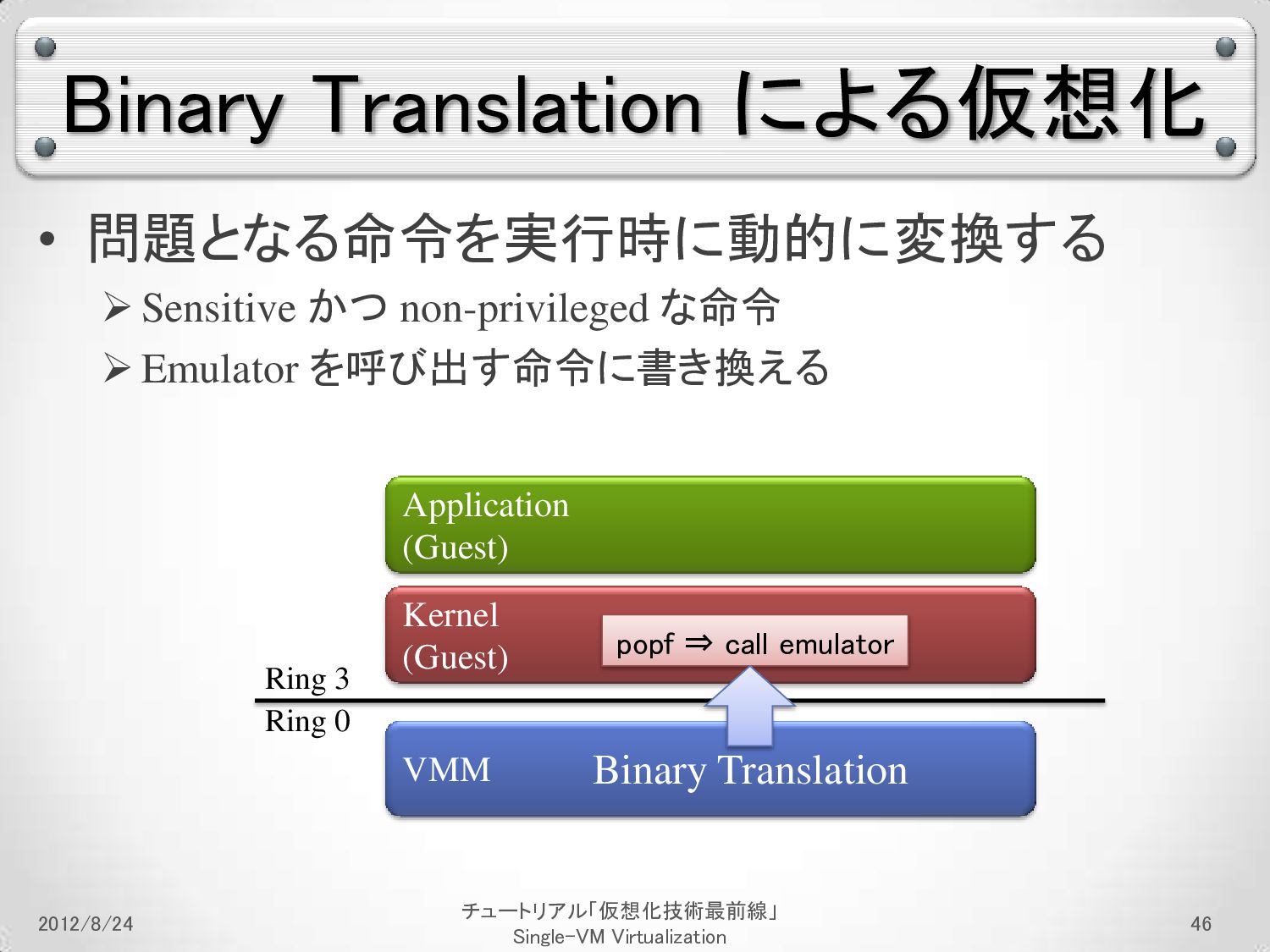 INVD, XSETBV • 設定により VM Exit が発生する条件 割り込み関係 o 外部割り込み,NMI, VMX preemption timer システムレジスタへのアクセス o CR3, CR8, RDMPC, RDTSC, RDRAND, MSR, DR, Descriptor table, APIC, ... 制御関係 o MONITOR, PAUSE, HLT, MWAIT, ... メモリ関係 o INVLPG, WBINVD, Enable INVPCID, enable VPID I/O関係 o Unconditional I/O, Use I/O bitmaps 2012/8/24 チュートリアル「仮想化技術最前線」 Single-VM Virtualization 49