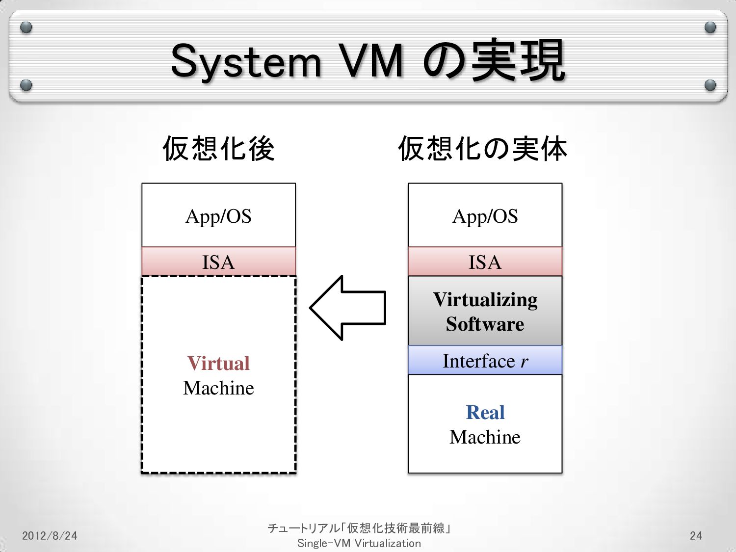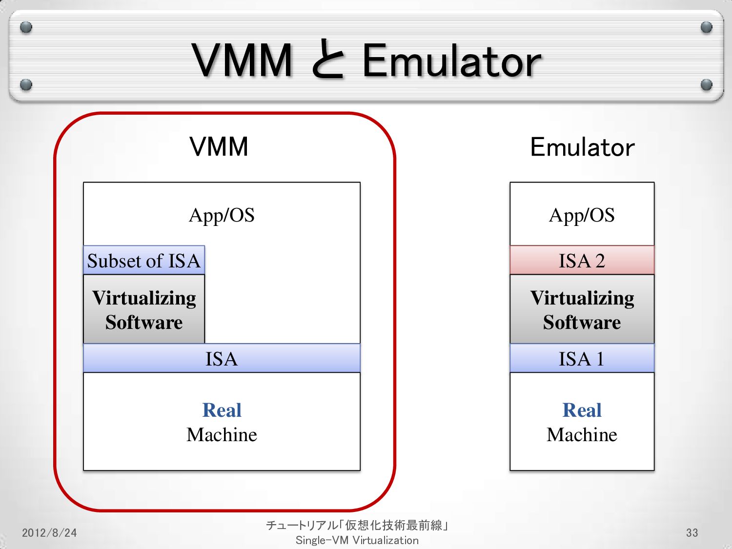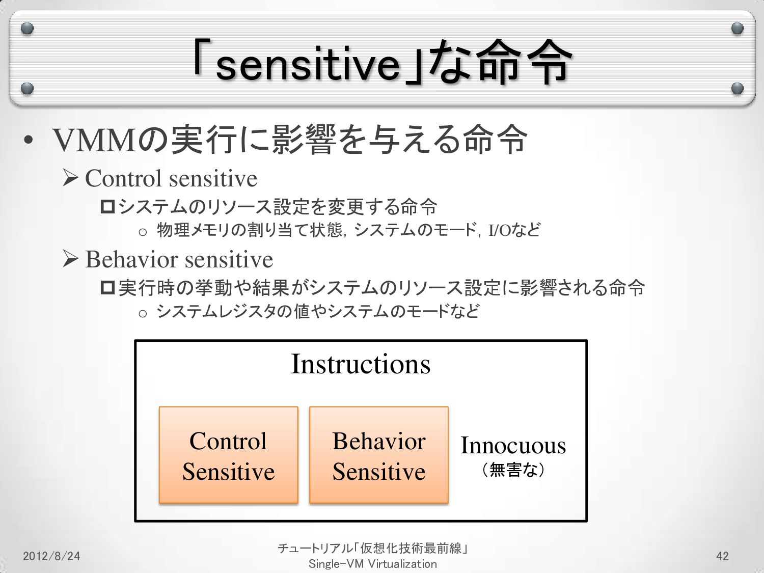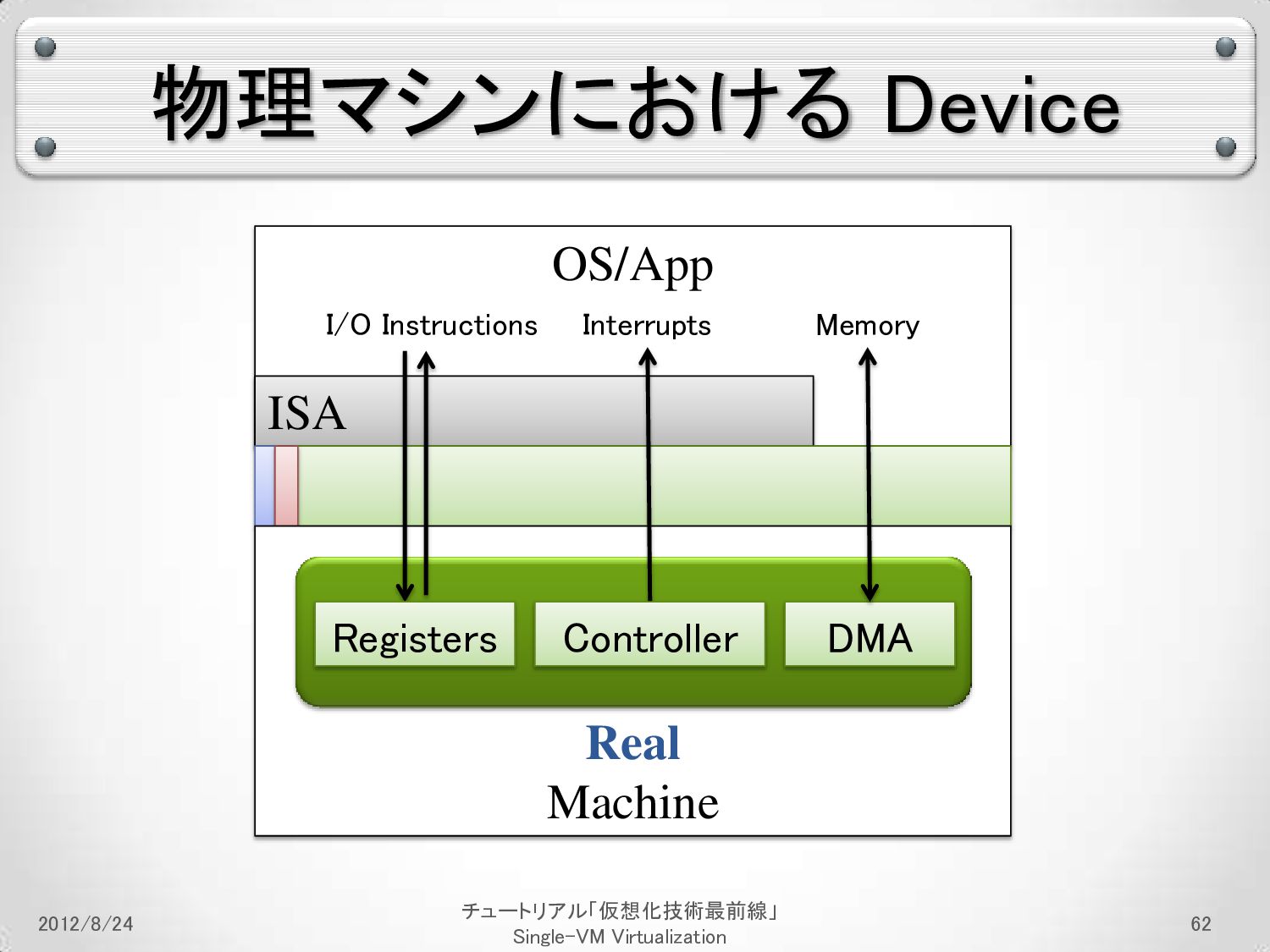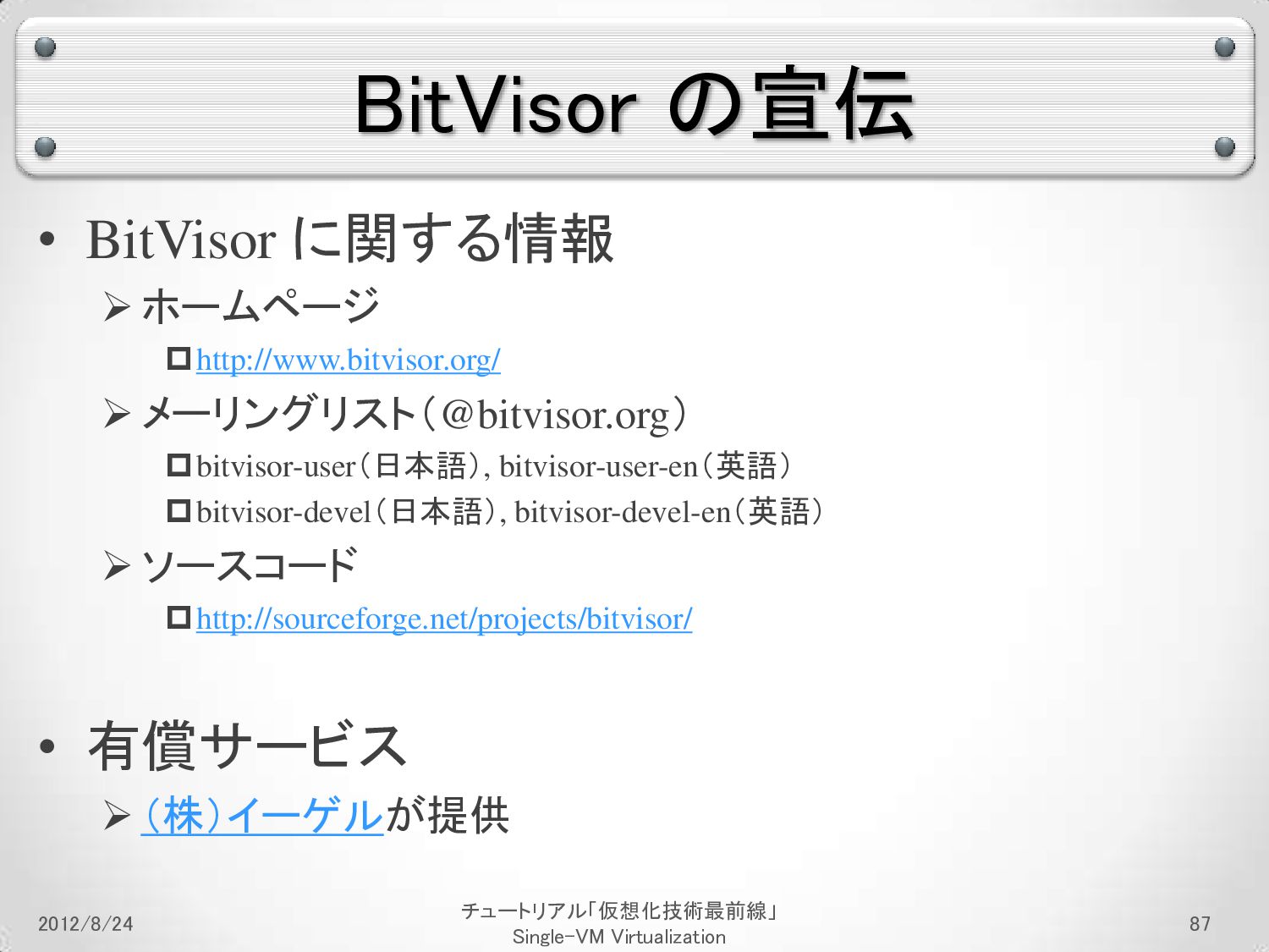 INVD, XSETBV • 設定により VM Exit が発生する条件 割り込み関係 o 外部割り込み,NMI, VMX preemption timer システムレジスタへのアクセス o CR3, CR8, RDMPC, RDTSC, RDRAND, MSR, DR, Descriptor table, APIC, ... 制御関係 o MONITOR, PAUSE, HLT, MWAIT, ... メモリ関係 o INVLPG, WBINVD, Enable INVPCID, enable VPID I/O関係 o Unconditional I/O, Use I/O bitmaps 2012/8/24 チュートリアル「仮想化技術最前線」 Single-VM Virtualization 49