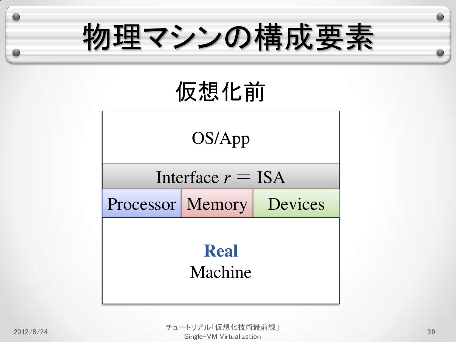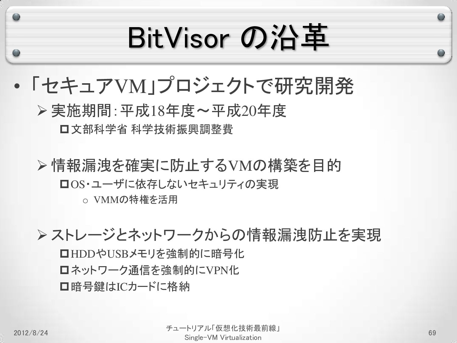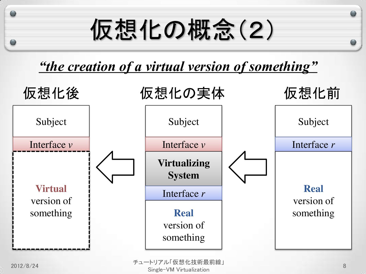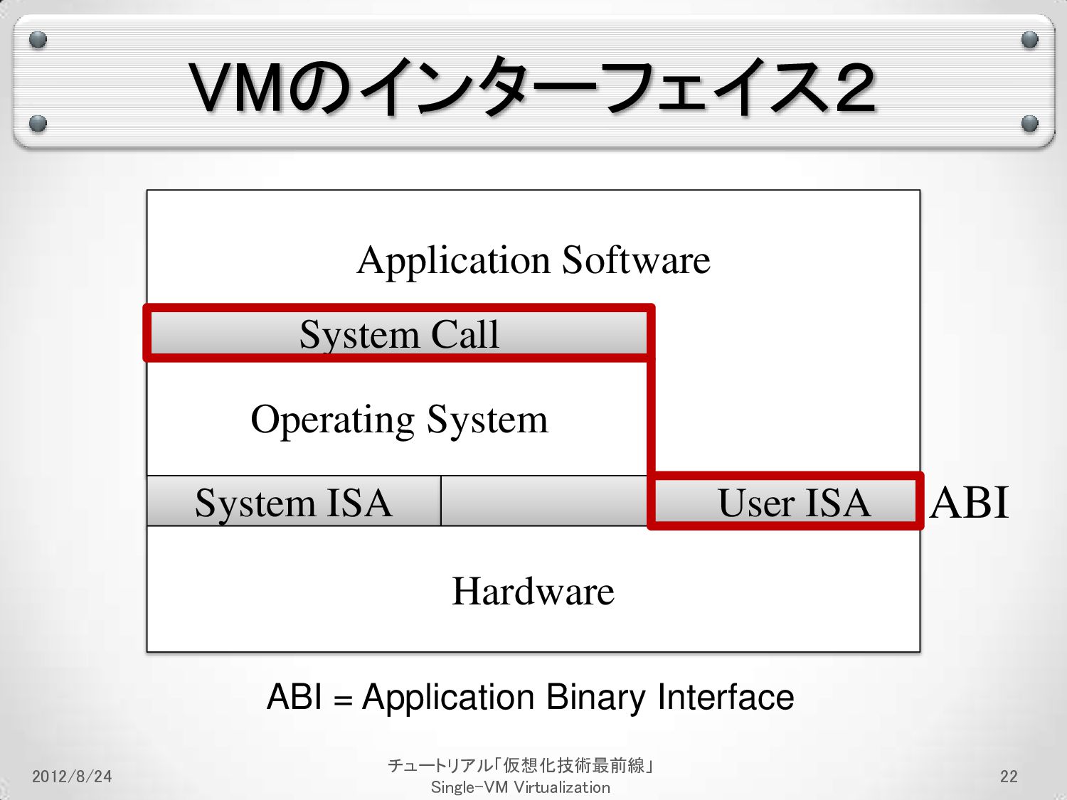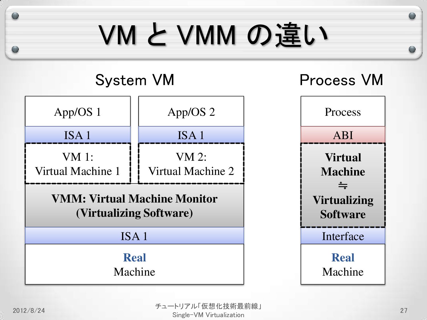 INVD, XSETBV • 設定により VM Exit が発生する条件 割り込み関係 o 外部割り込み,NMI, VMX preemption timer システムレジスタへのアクセス o CR3, CR8, RDMPC, RDTSC, RDRAND, MSR, DR, Descriptor table, APIC, ... 制御関係 o MONITOR, PAUSE, HLT, MWAIT, ... メモリ関係 o INVLPG, WBINVD, Enable INVPCID, enable VPID I/O関係 o Unconditional I/O, Use I/O bitmaps 2012/8/24 チュートリアル「仮想化技術最前線」 Single-VM Virtualization 49