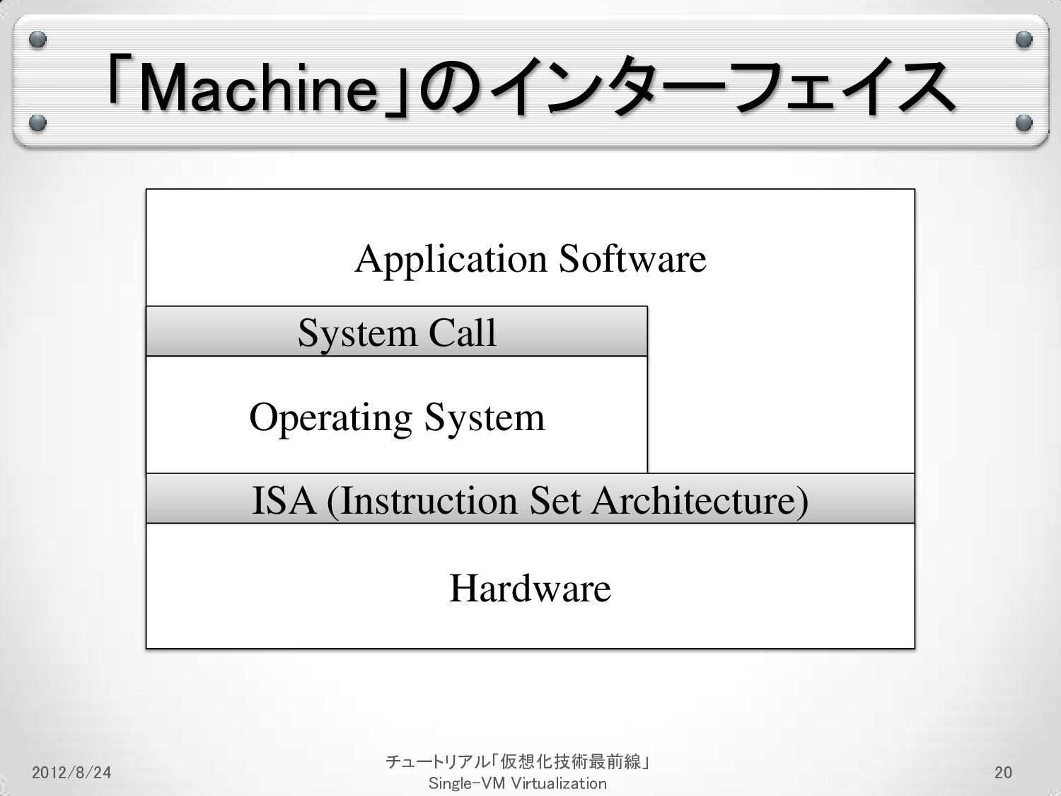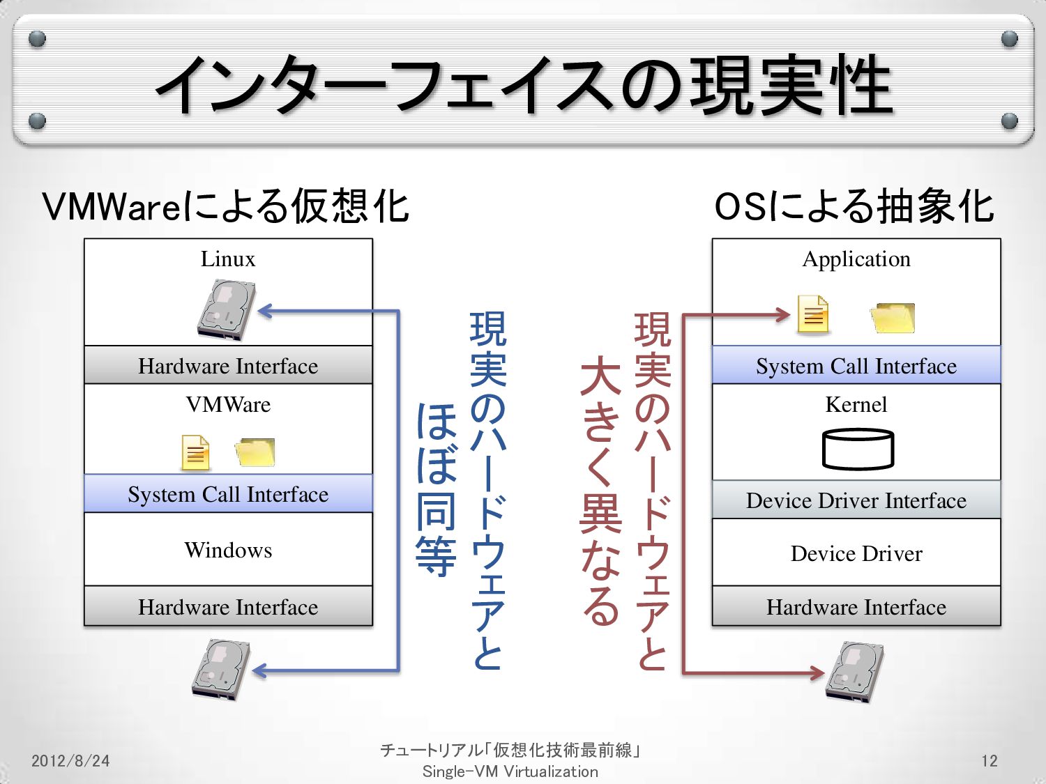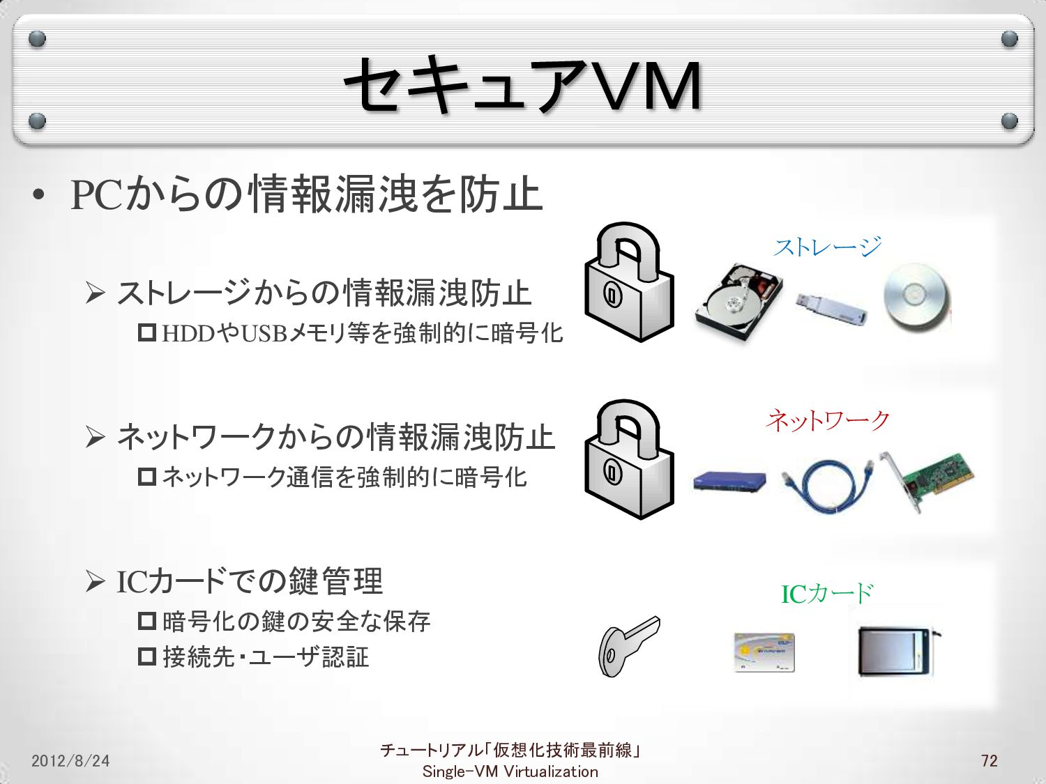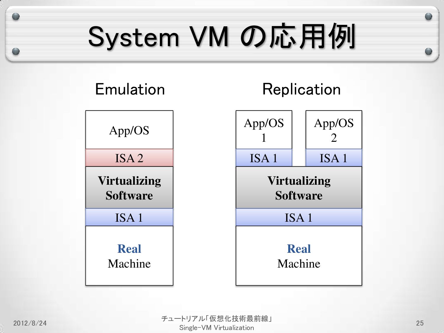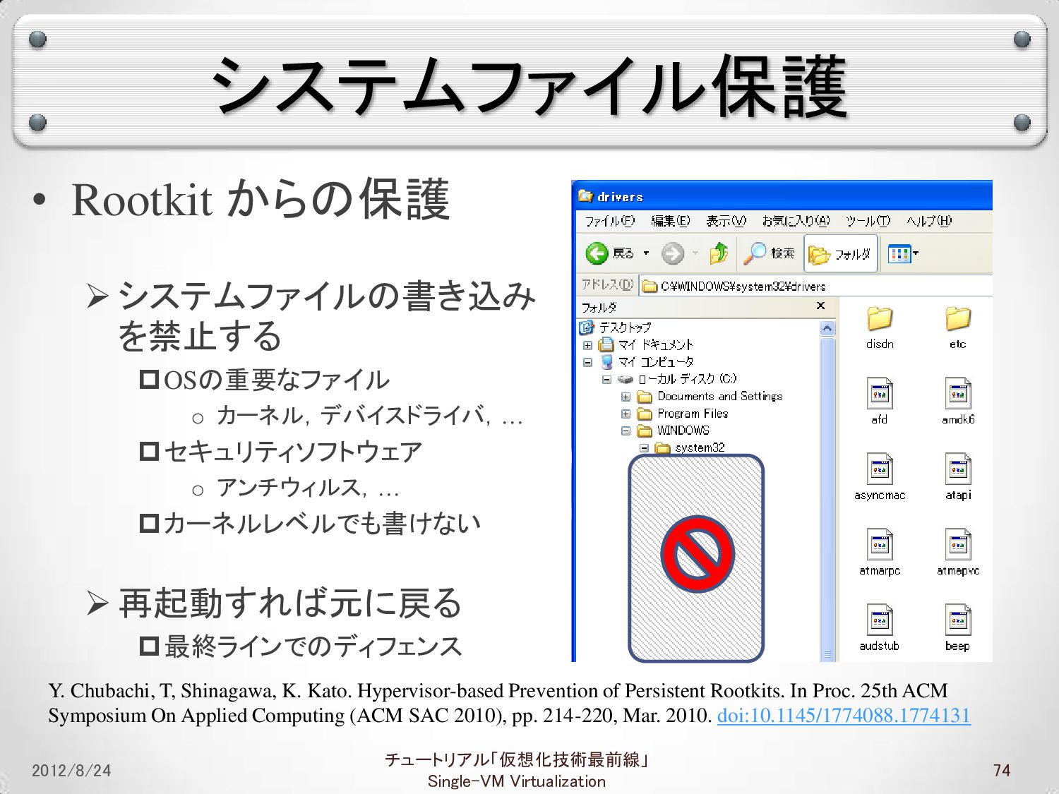 INVD, XSETBV • 設定により VM Exit が発生する条件 割り込み関係 o 外部割り込み,NMI, VMX preemption timer システムレジスタへのアクセス o CR3, CR8, RDMPC, RDTSC, RDRAND, MSR, DR, Descriptor table, APIC, ... 制御関係 o MONITOR, PAUSE, HLT, MWAIT, ... メモリ関係 o INVLPG, WBINVD, Enable INVPCID, enable VPID I/O関係 o Unconditional I/O, Use I/O bitmaps 2012/8/24 チュートリアル「仮想化技術最前線」 Single-VM Virtualization 49