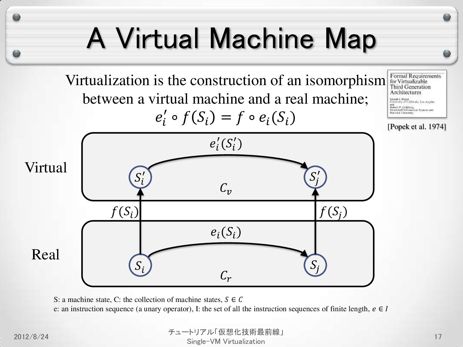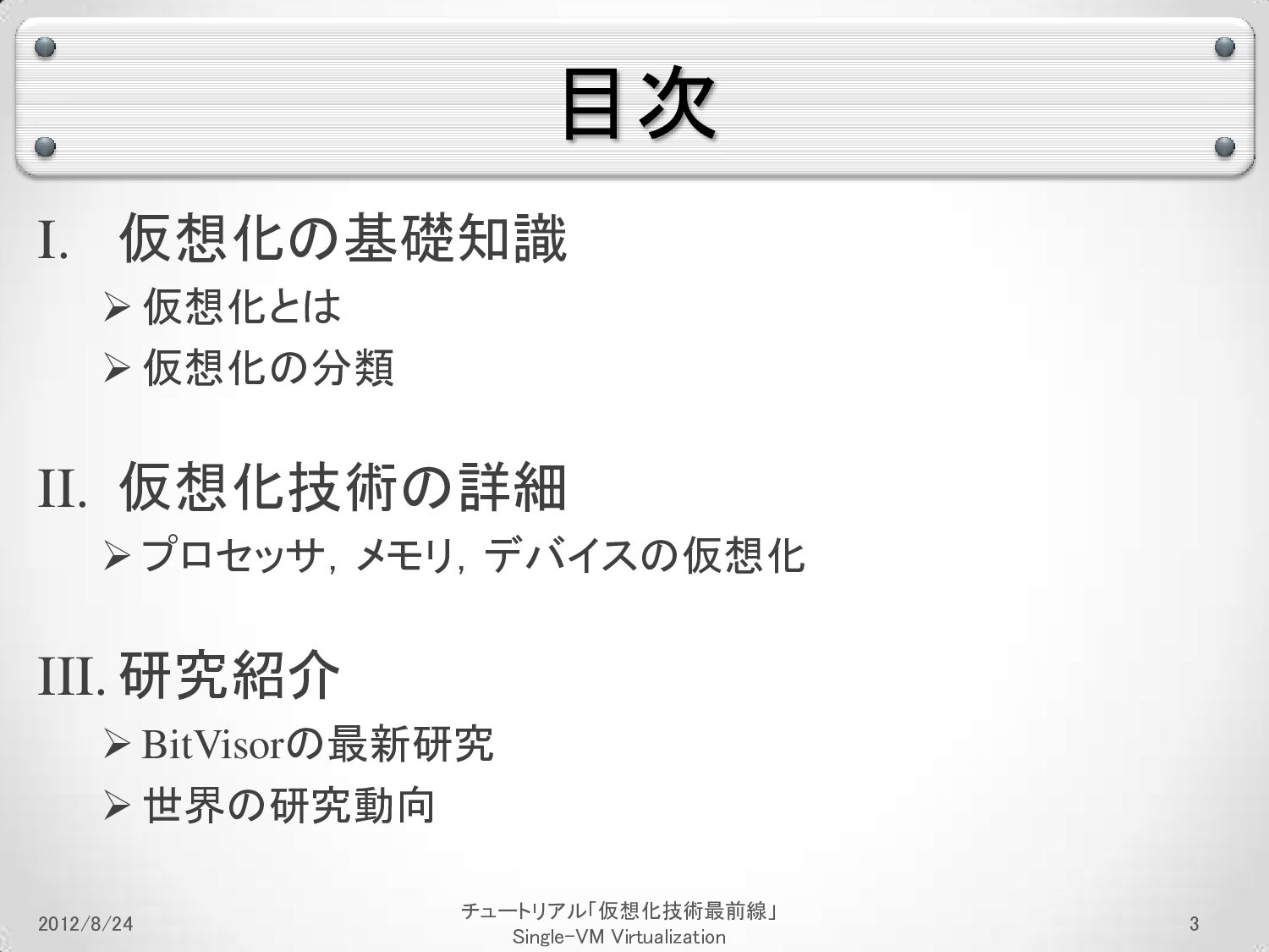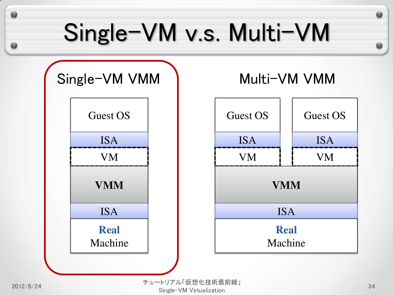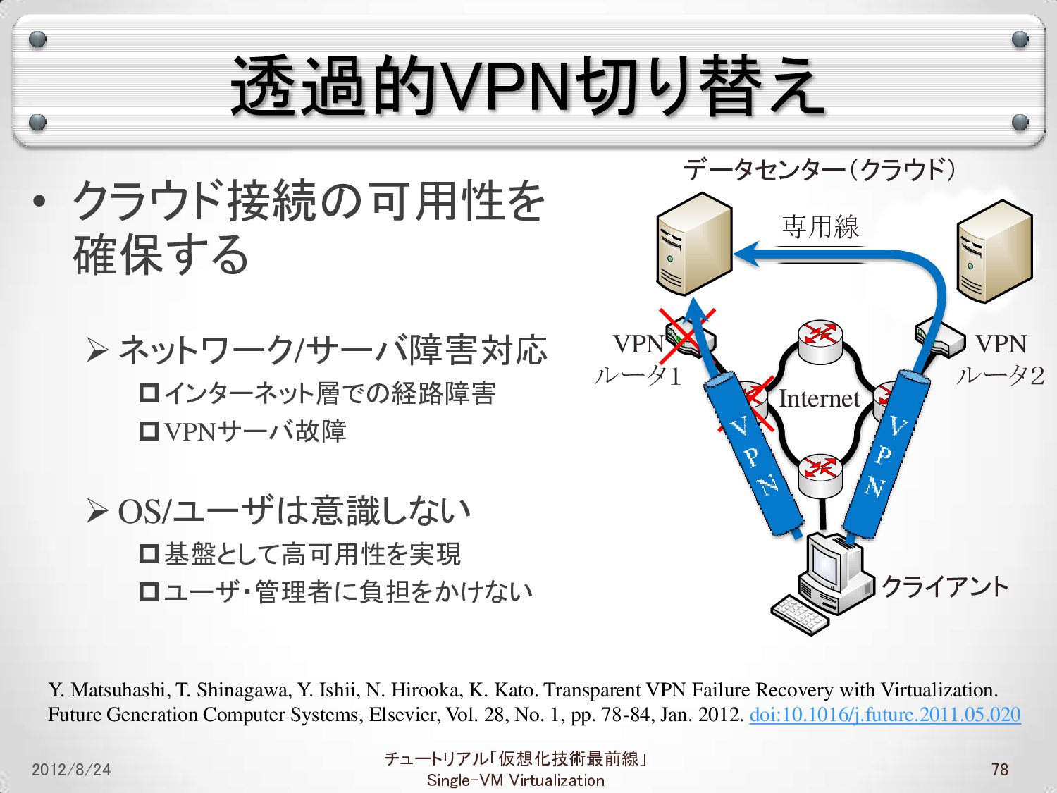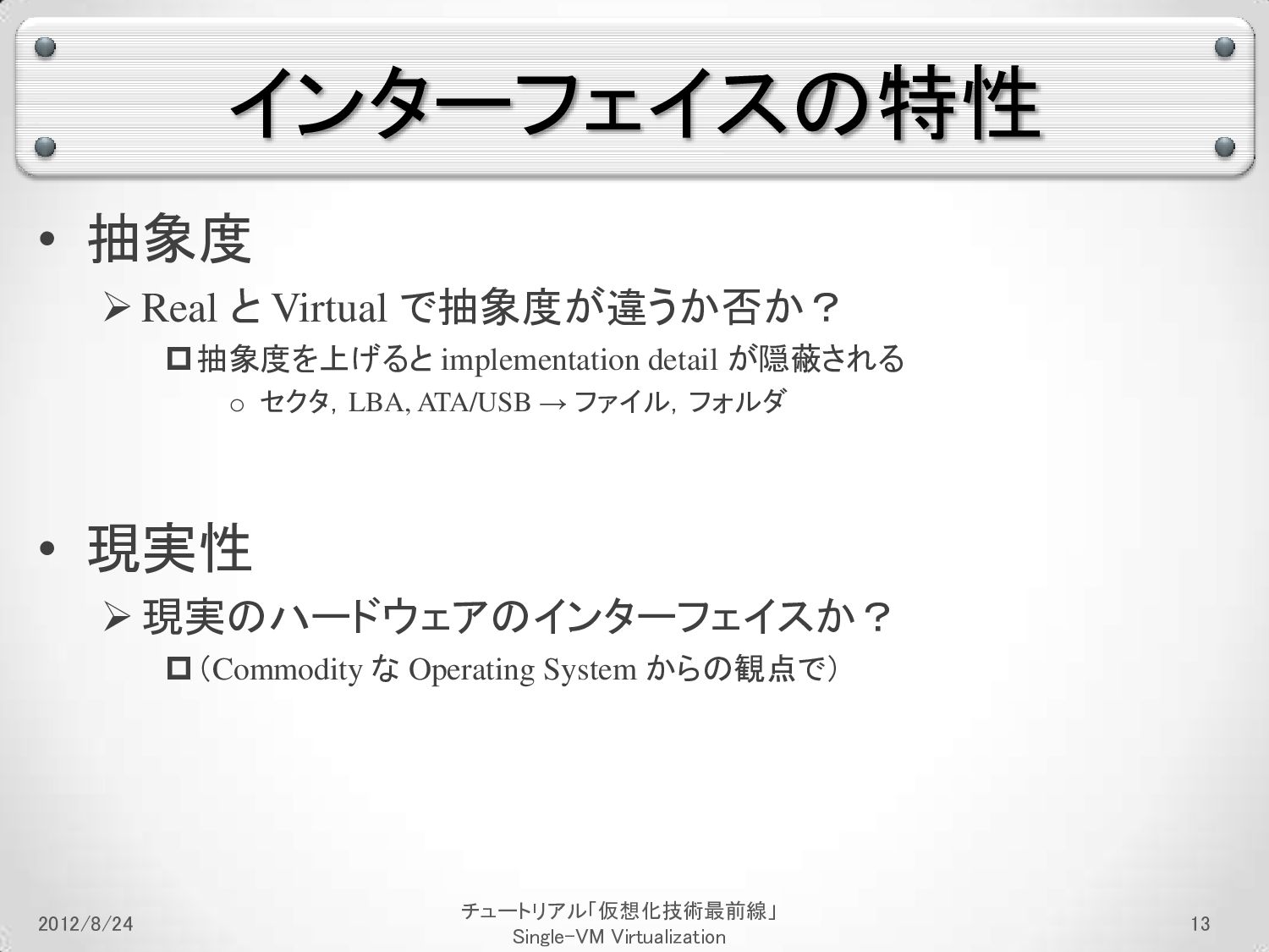 INVD, XSETBV • 設定により VM Exit が発生する条件 割り込み関係 o 外部割り込み,NMI, VMX preemption timer システムレジスタへのアクセス o CR3, CR8, RDMPC, RDTSC, RDRAND, MSR, DR, Descriptor table, APIC, ... 制御関係 o MONITOR, PAUSE, HLT, MWAIT, ... メモリ関係 o INVLPG, WBINVD, Enable INVPCID, enable VPID I/O関係 o Unconditional I/O, Use I/O bitmaps 2012/8/24 チュートリアル「仮想化技術最前線」 Single-VM Virtualization 49