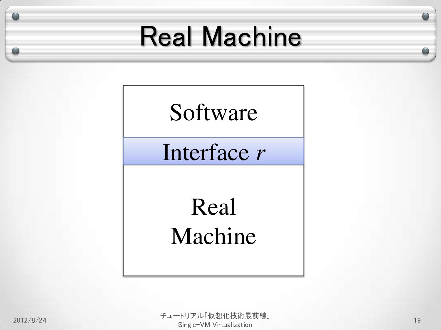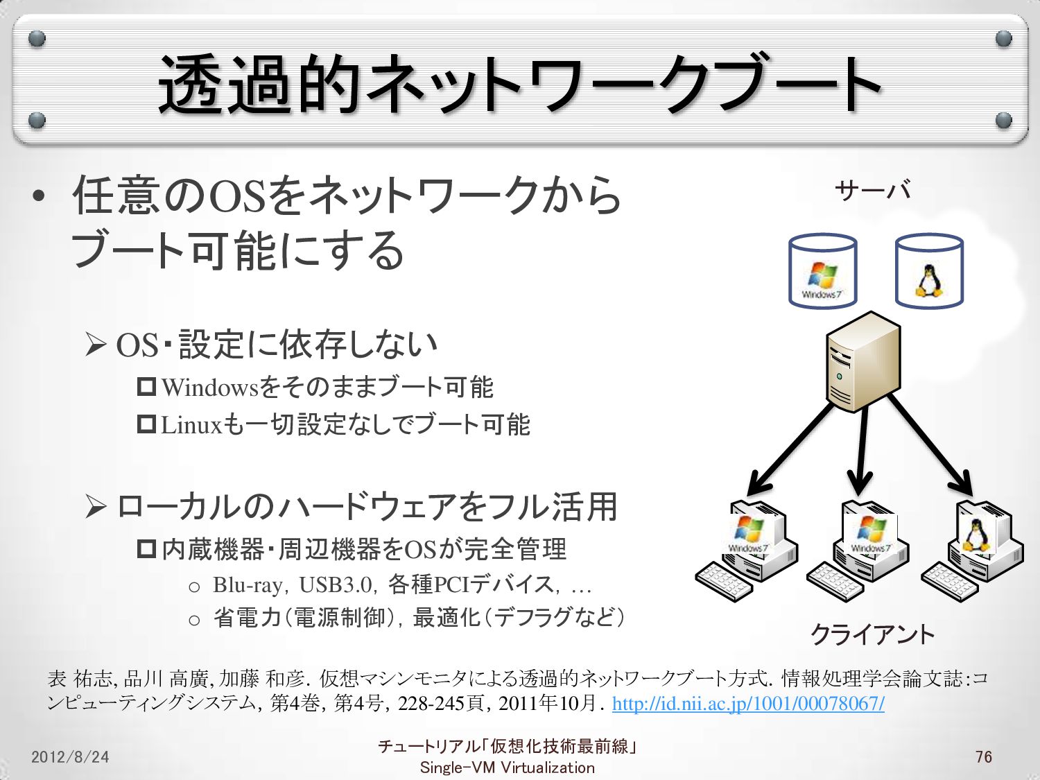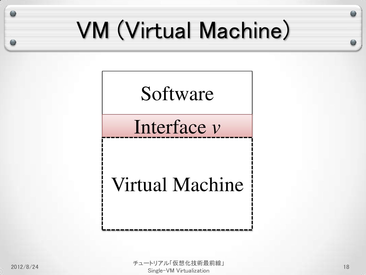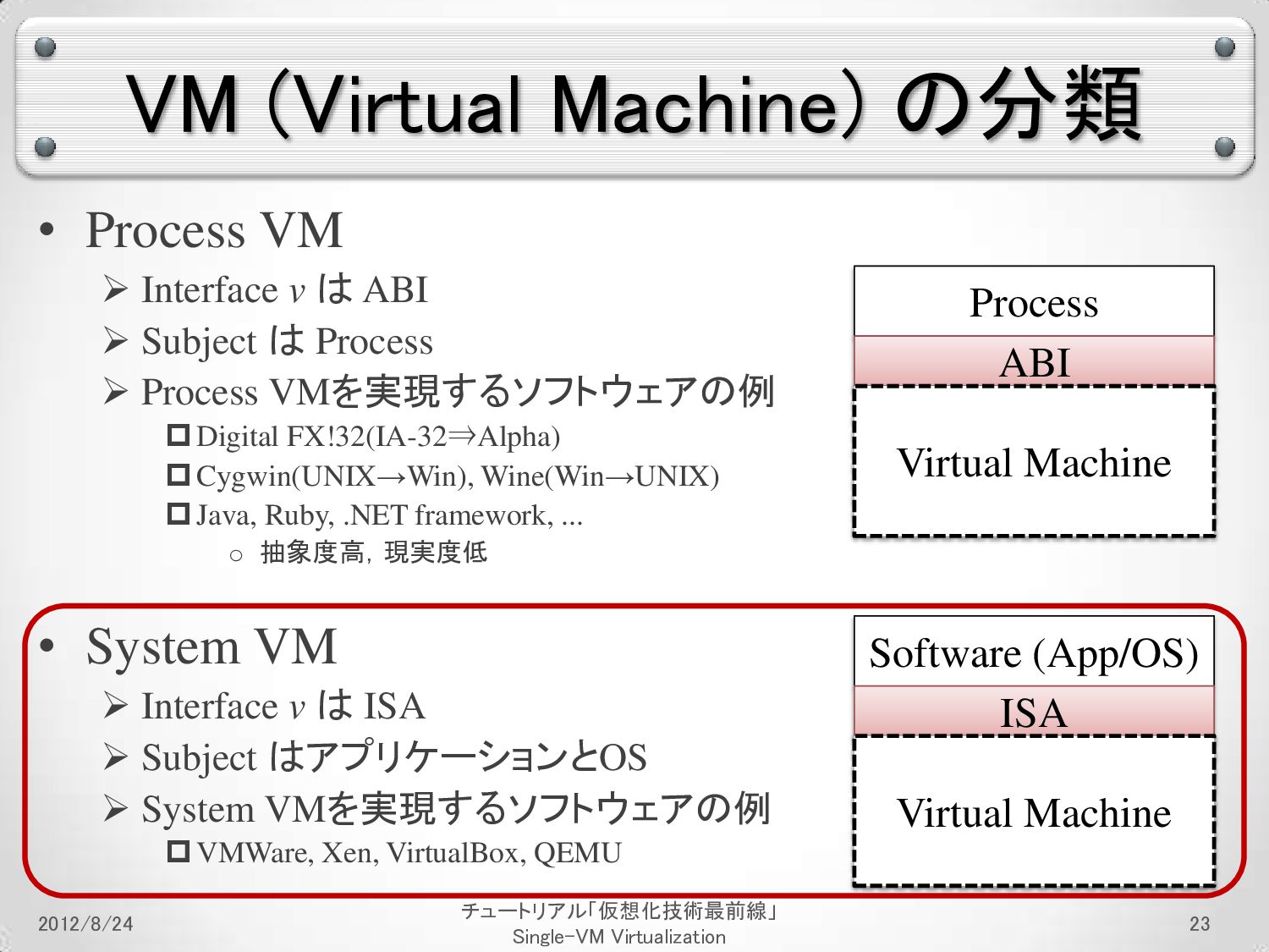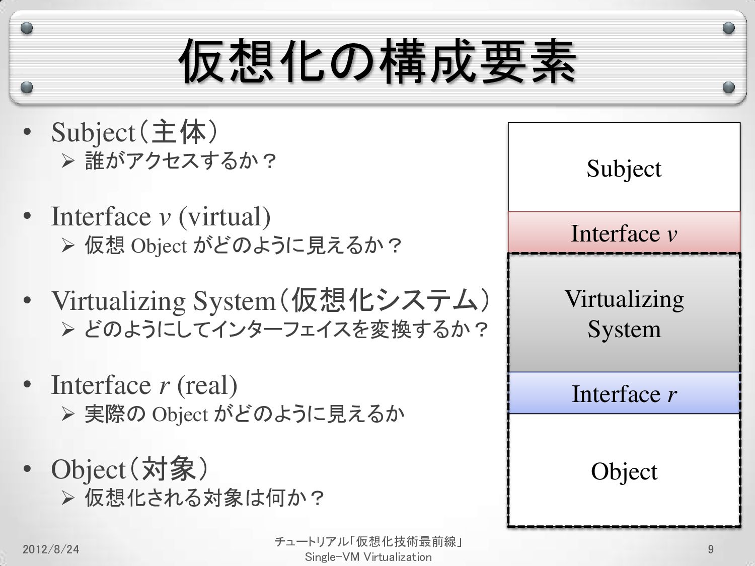 INVD, XSETBV • 設定により VM Exit が発生する条件 割り込み関係 o 外部割り込み,NMI, VMX preemption timer システムレジスタへのアクセス o CR3, CR8, RDMPC, RDTSC, RDRAND, MSR, DR, Descriptor table, APIC, ... 制御関係 o MONITOR, PAUSE, HLT, MWAIT, ... メモリ関係 o INVLPG, WBINVD, Enable INVPCID, enable VPID I/O関係 o Unconditional I/O, Use I/O bitmaps 2012/8/24 チュートリアル「仮想化技術最前線」 Single-VM Virtualization 49