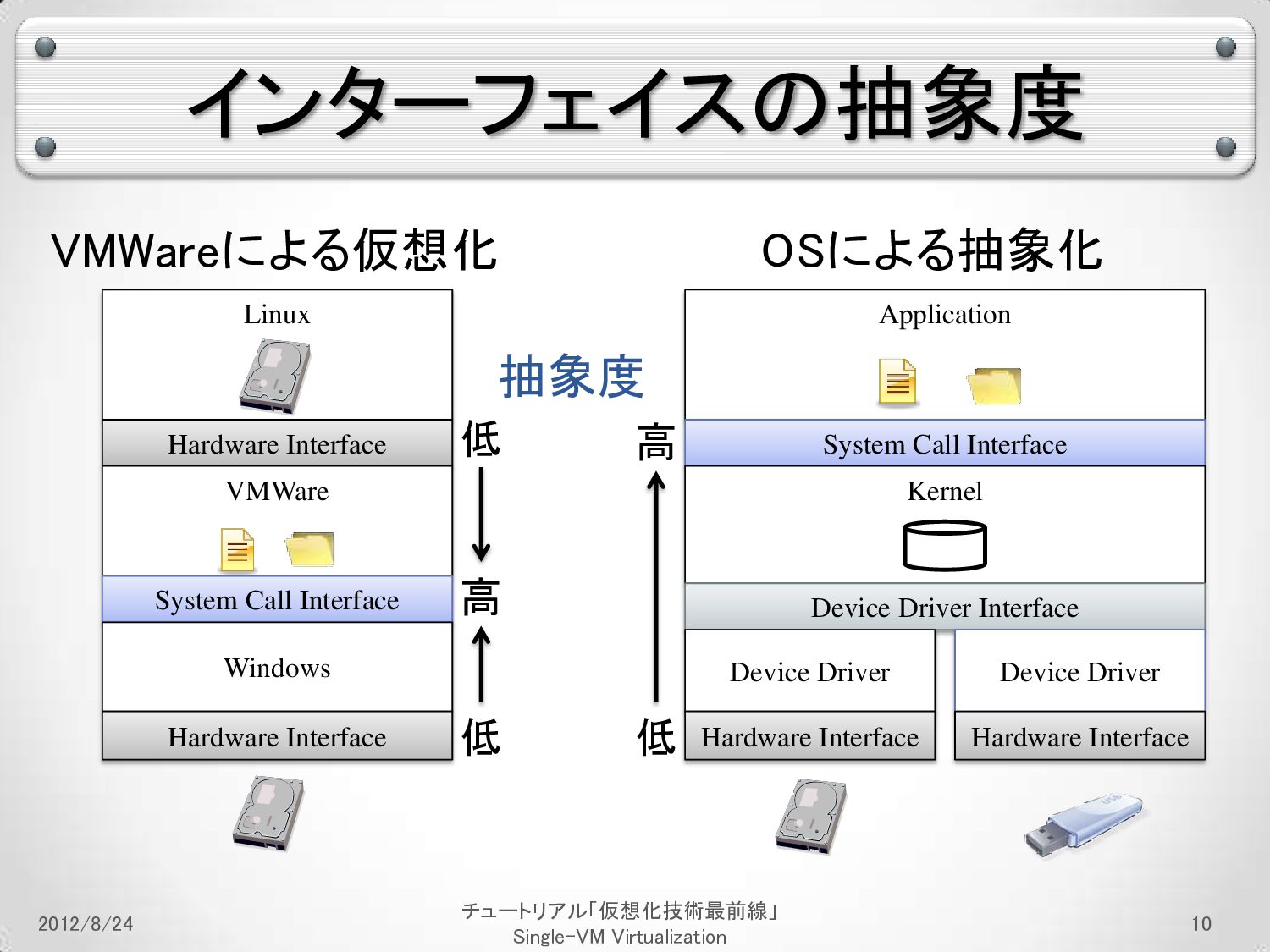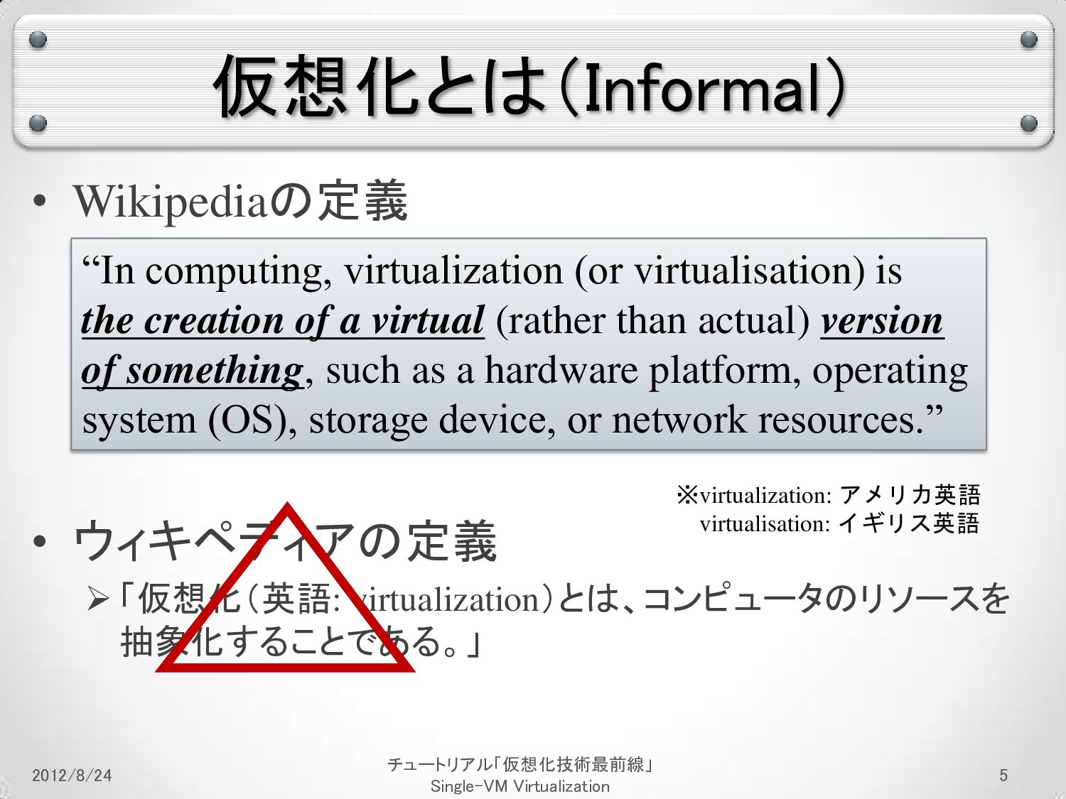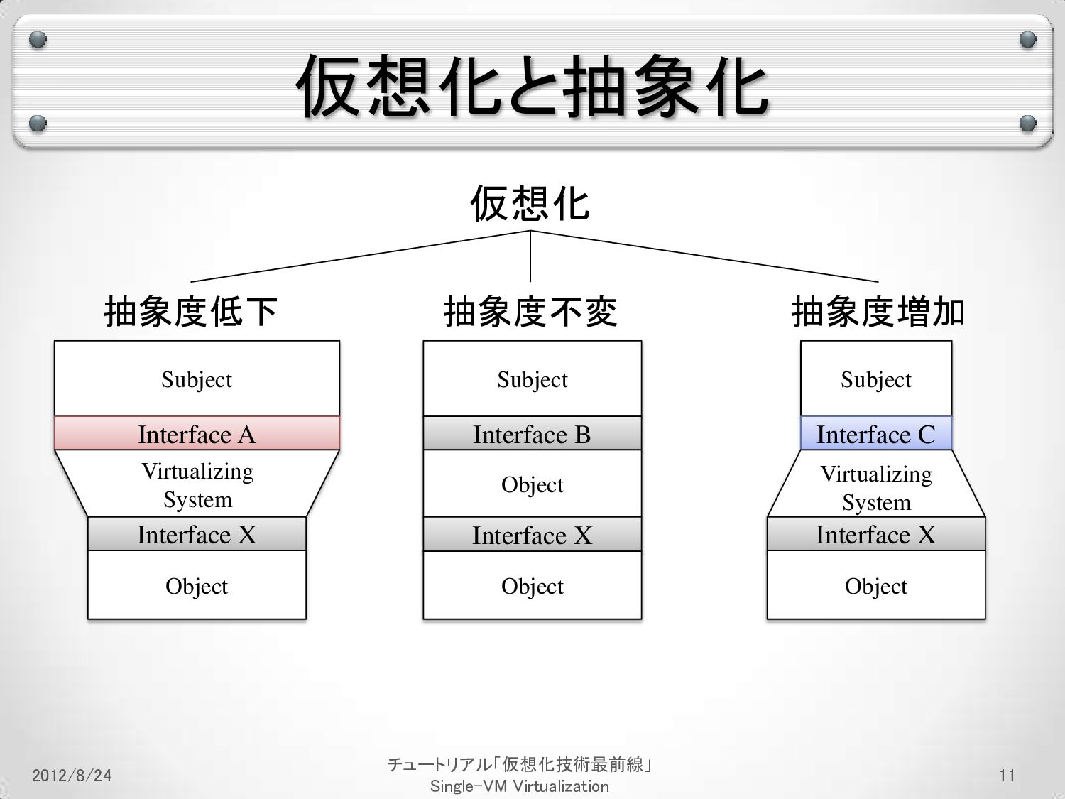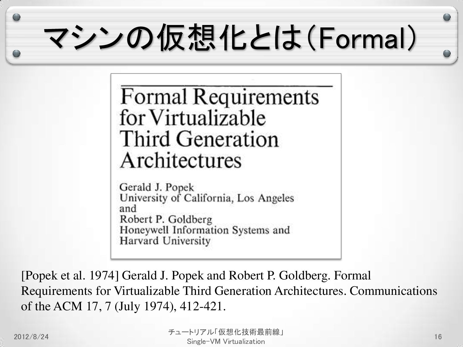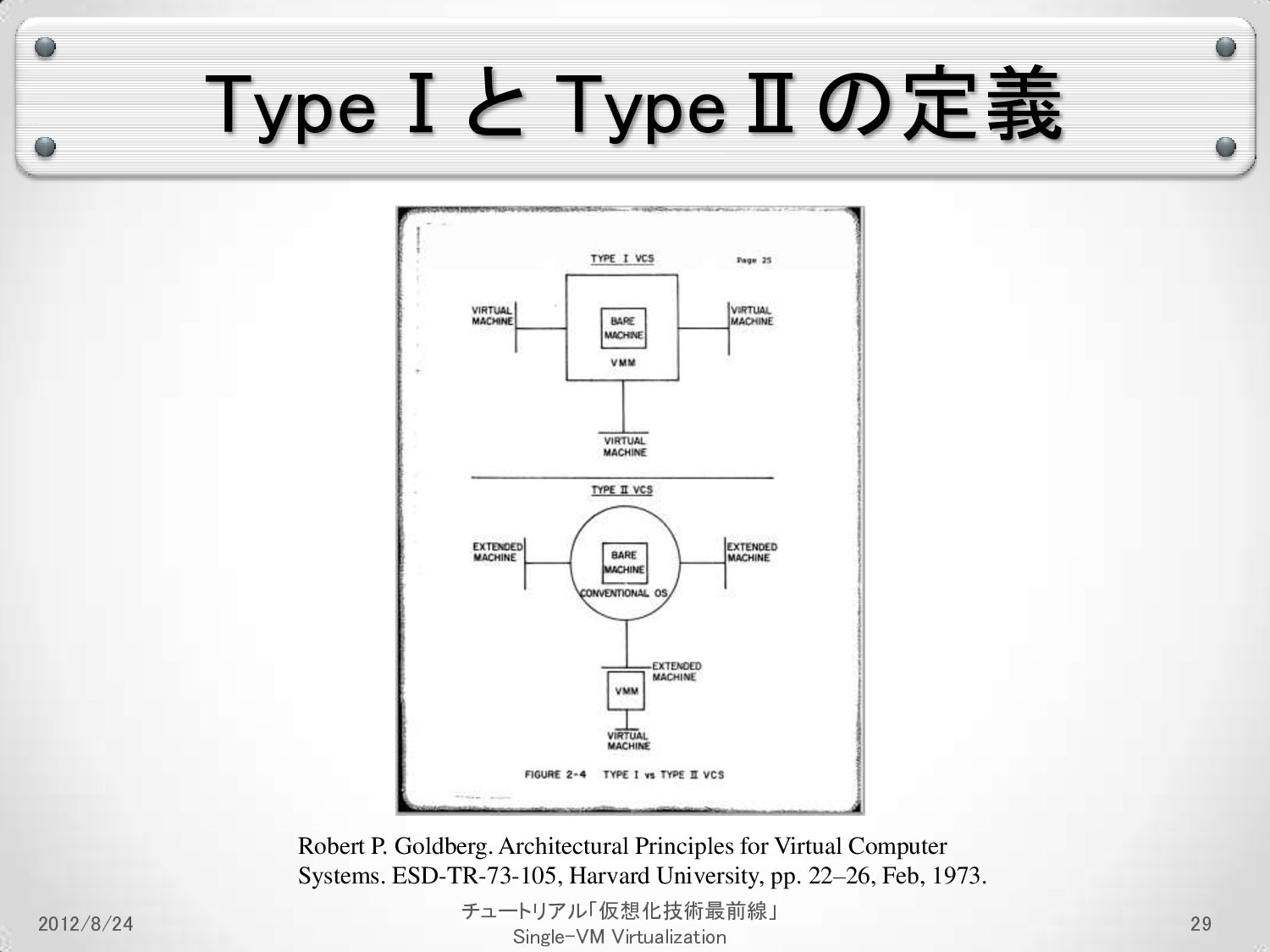 INVD, XSETBV • 設定により VM Exit が発生する条件 割り込み関係 o 外部割り込み,NMI, VMX preemption timer システムレジスタへのアクセス o CR3, CR8, RDMPC, RDTSC, RDRAND, MSR, DR, Descriptor table, APIC, ... 制御関係 o MONITOR, PAUSE, HLT, MWAIT, ... メモリ関係 o INVLPG, WBINVD, Enable INVPCID, enable VPID I/O関係 o Unconditional I/O, Use I/O bitmaps 2012/8/24 チュートリアル「仮想化技術最前線」 Single-VM Virtualization 49