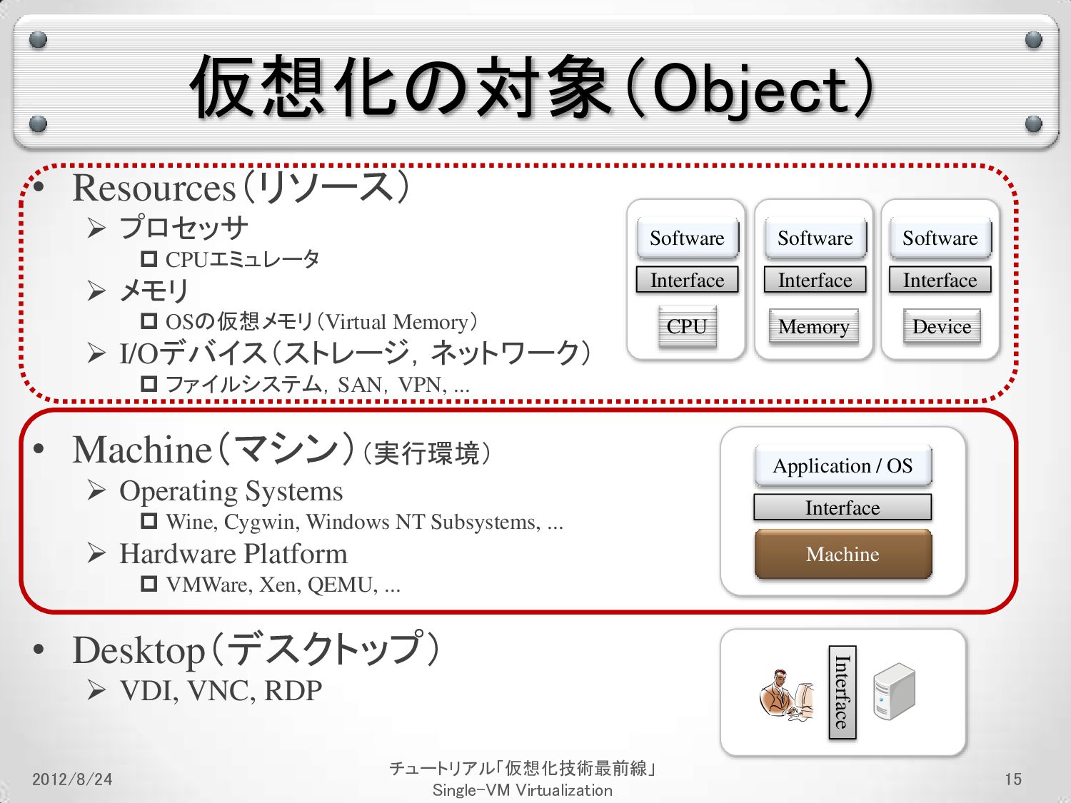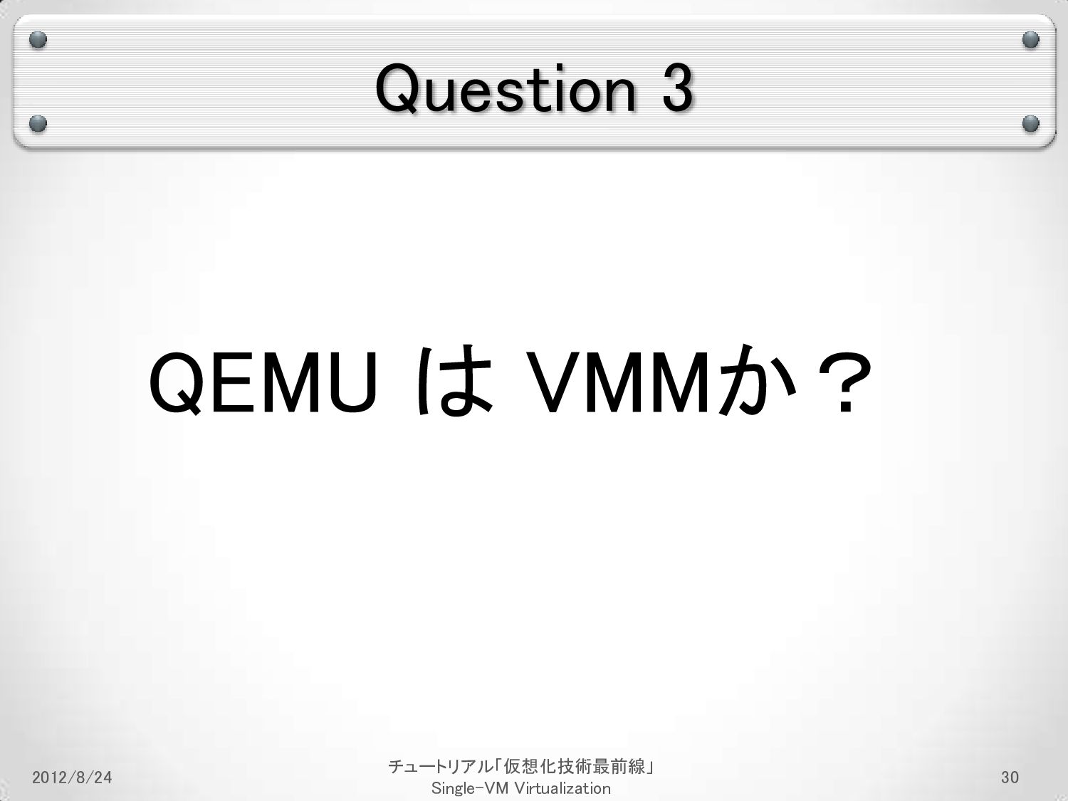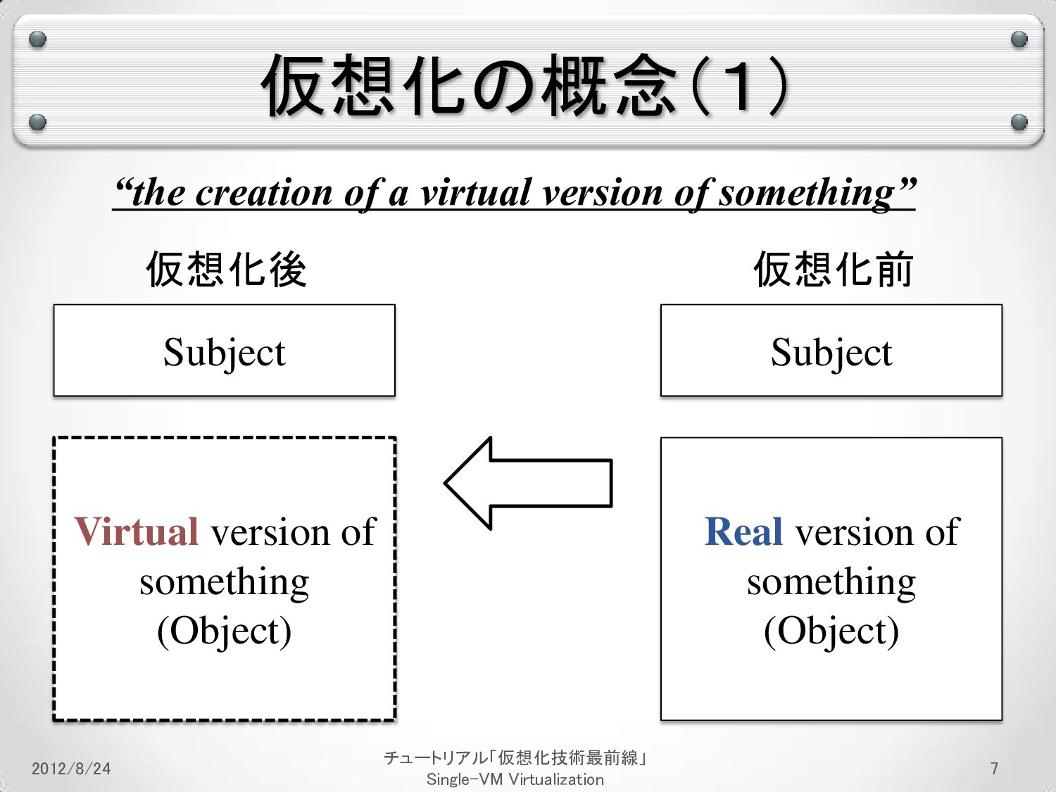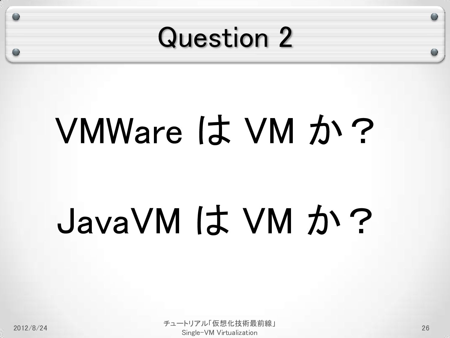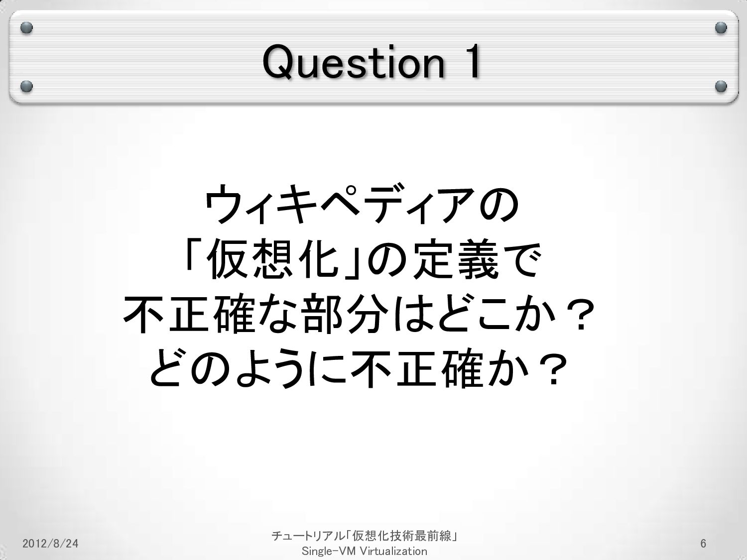 INVD, XSETBV • 設定により VM Exit が発生する条件 割り込み関係 o 外部割り込み,NMI, VMX preemption timer システムレジスタへのアクセス o CR3, CR8, RDMPC, RDTSC, RDRAND, MSR, DR, Descriptor table, APIC, ... 制御関係 o MONITOR, PAUSE, HLT, MWAIT, ... メモリ関係 o INVLPG, WBINVD, Enable INVPCID, enable VPID I/O関係 o Unconditional I/O, Use I/O bitmaps 2012/8/24 チュートリアル「仮想化技術最前線」 Single-VM Virtualization 49
