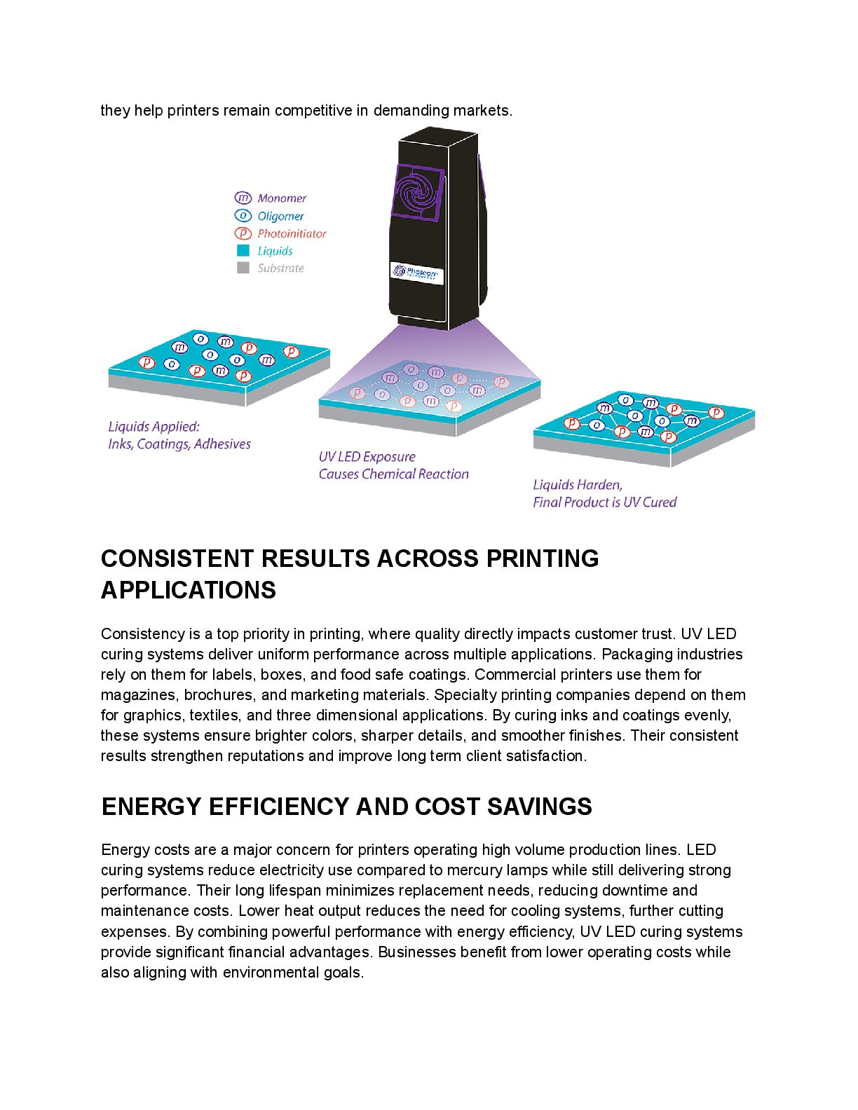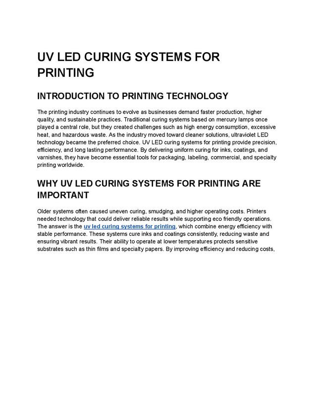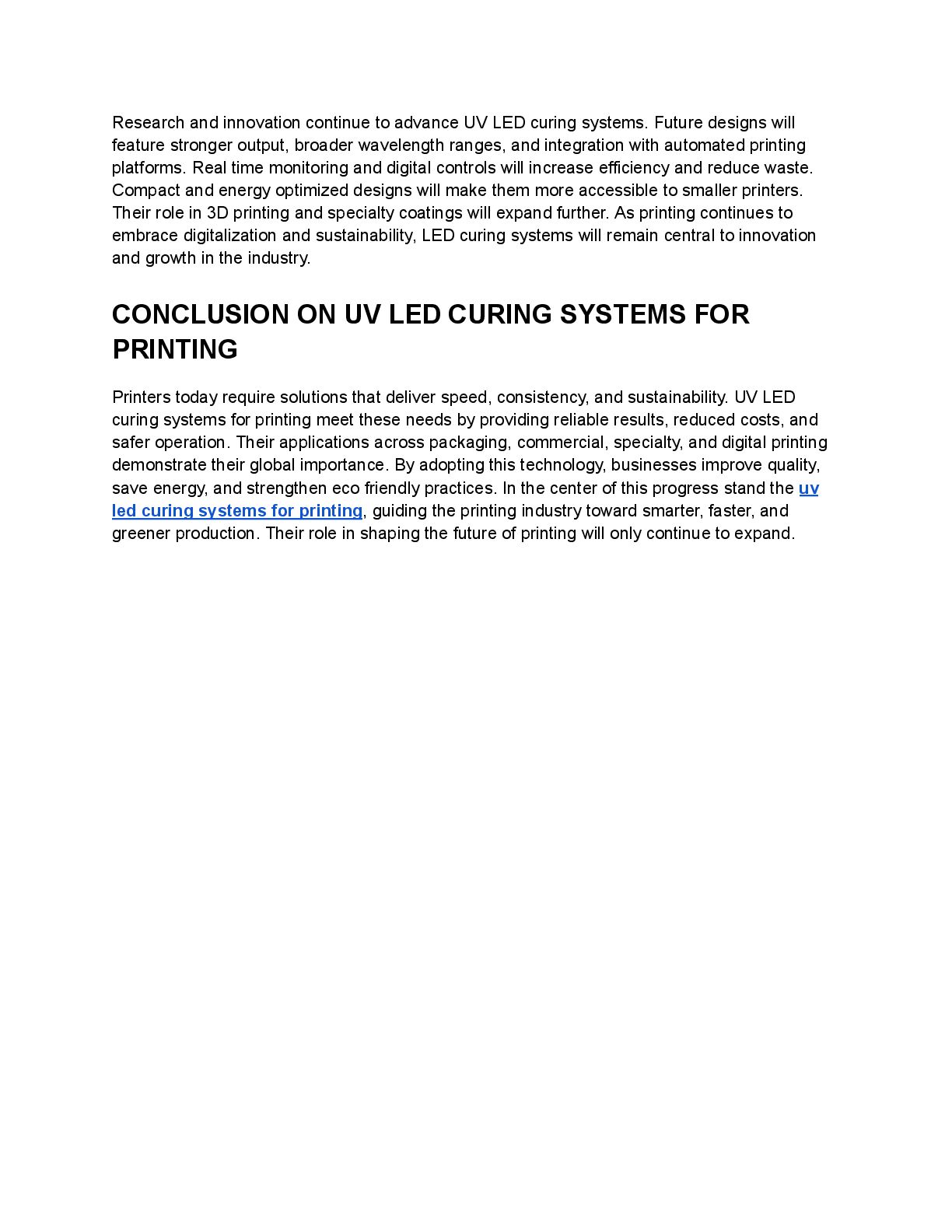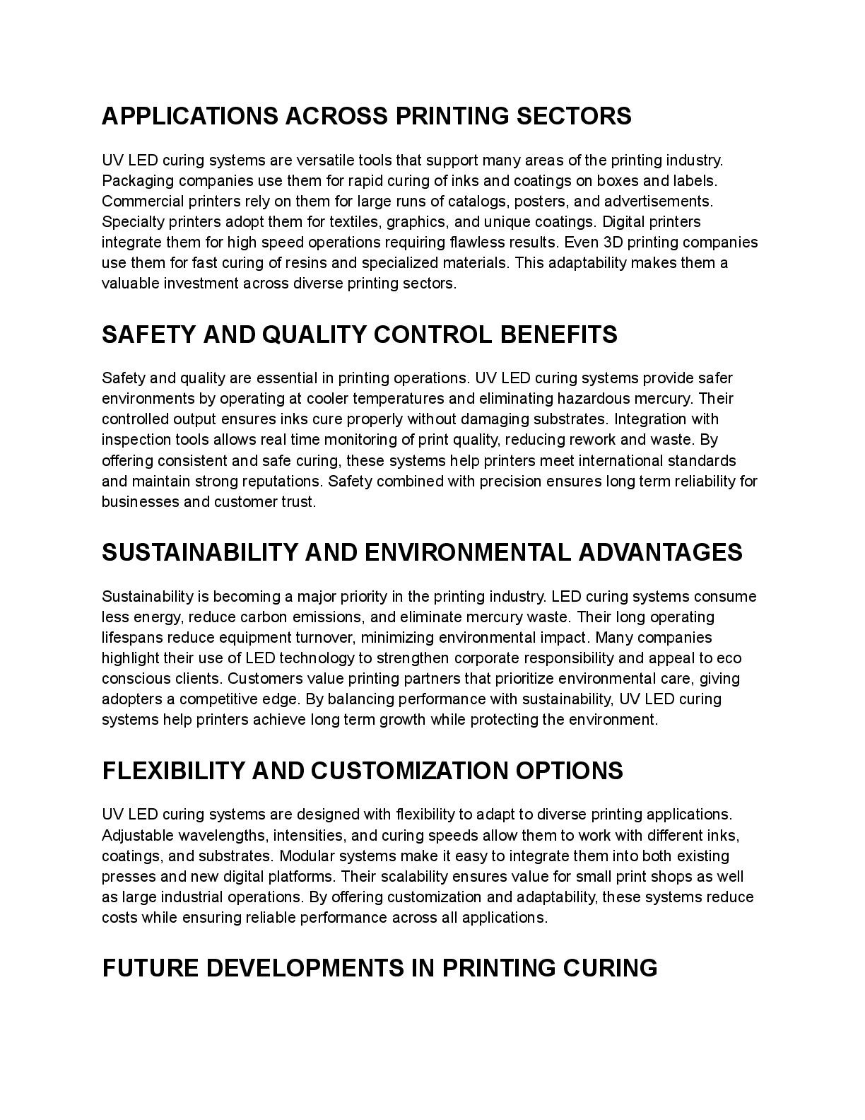 tools that support many areas of the printing industry. Packaging companies use them for rapid curing of inks and coatings on boxes and labels. Commercial printers rely on them for large runs of catalogs, posters, and advertisements. Specialty printers adopt them for textiles, graphics, and unique coatings. Digital printers integrate them for high speed operations requiring flawless results. Even 3D printing companies use them for fast curing of resins and specialized materials. This adaptability makes them a valuable investment across diverse printing sectors. SAFETY AND QUALITY CONTROL BENEFITS Safety and quality are essential in printing operations. UV LED curing systems provide safer environments by operating at cooler temperatures and eliminating hazardous mercury. Their controlled output ensures inks cure properly without damaging substrates. Integration with inspection tools allows real time monitoring of print quality, reducing rework and waste. By offering consistent and safe curing, these systems help printers meet international standards and maintain strong reputations. Safety combined with precision ensures long term reliability for businesses and customer trust. SUSTAINABILITY AND ENVIRONMENTAL ADVANTAGES Sustainability is becoming a major priority in the printing industry. LED curing systems consume less energy, reduce carbon emissions, and eliminate mercury waste. Their long operating lifespans reduce equipment turnover, minimizing environmental impact. Many companies highlight their use of LED technology to strengthen corporate responsibility and appeal to eco conscious clients. Customers value printing partners that prioritize environmental care, giving adopters a competitive edge. By balancing performance with sustainability, UV LED curing systems help printers achieve long term growth while protecting the environment. FLEXIBILITY AND CUSTOMIZATION OPTIONS UV LED curing systems are designed with flexibility to adapt to diverse printing applications. Adjustable wavelengths, intensities, and curing speeds allow them to work with different inks, coatings, and substrates. Modular systems make it easy to integrate them into both existing presses and new digital platforms. Their scalability ensures value for small print shops as well as large industrial operations. By offering customization and adaptability, these systems reduce costs while ensuring reliable performance across all applications. FUTURE DEVELOPMENTS IN PRINTING CURING