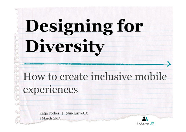 So everyone’s got smartphones these day yes? But not everyone who has a smartphone can see, hear, move or handle cognitive loads without impairment. So how can we include everyone in our mobile design? This talk shares some top tips on how to create an inclusive mobile design and reveals some things you may not know people with disabilities can definitely do on a mobile device.