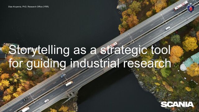 I will explain how we're using Storytelling as a strategic tool to guide industrial research at Scania. The development process, and resulting stories, help us engage with, and anchor, our research endeavors with three different stakeholders groups.