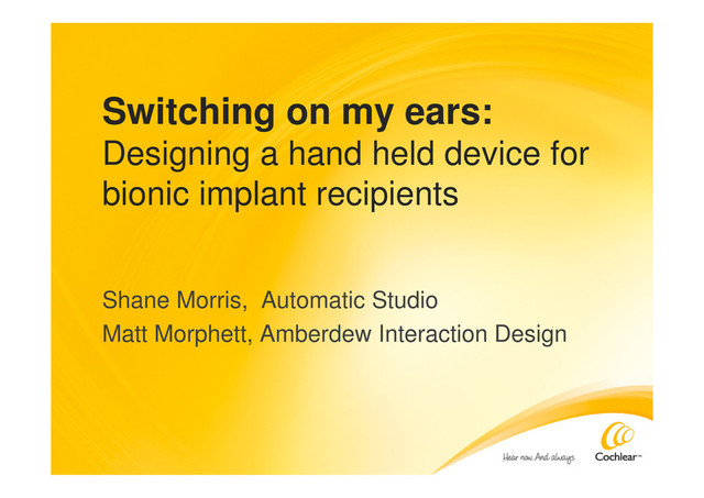 Designing a hand-held device presents a number of challenges. Designing that device for use by folks with impaired physical abilities introduces another layer of complexity. Ensuring that the experience is appropriate for an audience from five year-old kids to ninety five year-old retirees controlling one of their senses is just downright difficult. Shane recently worked with Australian innovator and international success story Cochlear to design device to help bionic ear implant recipients monitor and control their hearing. The design represented an evolution to a simpler more usable device.