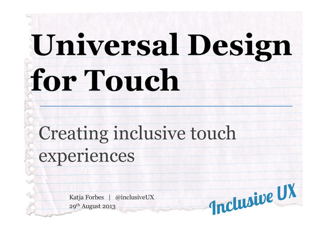 from Katja Forbes, at UX Australia 2013. The touch device landscape is diverse, fast paced and changing every week, providing new challenges to designers with each new incarnation of device or operating system. But there's more to challenge designers… thinking about inclusion of people who may have visual, cognitive, hearing, motor or speech impairments…or some of all of them due to age. So what do we mean when we say "designing for all" in the world of touch devices, what makes it so darn hard to do and how can we create user experiences that are inclusive for this hugely diverse group of people?