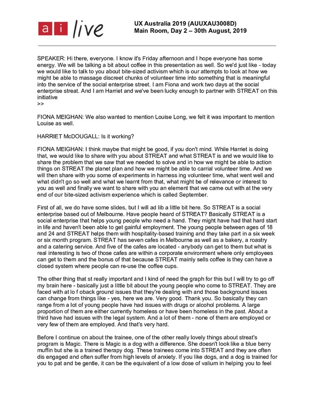 August, 2019 Page 4 of 11 snowballed in so many meaningful and surprising ways since then. So I'm just going to backtrack a little bit. Like so many other things, we had actually started bite- sized activism a long time before we really believed we had. So going back to 2017 when Fiona and her colleagues were working (inaudible) at the time, they saw an opportunity with STREAT to bring on board a few engineering students from the University of Melbourne. There they are. Never seen people more happy to be next to bins in my life. So what these people were doing with their expertise out of their course and getting credit to it, they were helping STREAT to do a baseline waste audit. So that is everything that was thrown out, everything that was being audited, observing the customers and the food waste and the packaging waste that was left over and essentially creating a baseline understanding of where the opportunities to improve on that waste were. And one of the first opportunities they saw was the nearly 2,500 un recyclable hand towels were being thrown away every week. This is something straight forward. Having that number gave enough leverage to say to Bec and say let's invest in some hand driers and have some (inaudible) in the bathroom. Suddenly the planet is visible. Around the same time one of our site managers called Sean who turned out to have a background in environmental management, he saw this and was like, oh, cool, I can kind of see how I can use that thing I learned at university now. So off he went and the next thing we knew he had brokened a deal with E-water, I am not going to pretend how it works but it's scientific magic, but essentially what E water does is it takes electricity and salts and it produces amazing chemical-free cleansers which are now being used across all of the STREAT sites with no expense to them. Another thing that Sean did was decide - commit to taking on 180,000 new employees in the form of compose ing worms. So these guys are happily chowing down on all the organic waste from our kitchens. So what started with, you know, a very simple kind of, hey, how about use the hand drier rather than the hand towels spirallied into something more than that. Soon afterwards we had a horticulturalist come in to help design our ditchen garden at the STREAT HQ and Fiona came on board, just one day a week initially as a volunteer to focus on the planet plan. Not long after that, here we are and we're formalising impact frameworks, we're formalising mini briefs and we actually have spent a lo lot of time and energy sorting out how to formalise bite-sized activism. FIONA MEIGHAN: Now to the fun bit. The experiments. So we had a range of experiments that we decided to put to the test to see which ones might help us to actually achieve the objectives which were to usefully harness volunteer time, to measure the impact we were making and create the meaningful outcomes. And the other thing that was really important is to see these experiments to help build a volunteer network on an ongoing basis as well. So that was really important for us and we were worried, though, a little bit that volunteers might not commit. We had experiences in the past with volunteers saying anyway would do thing d - they would do things and flaking out at the last minute and that would be worse than not trying. So we were worried about that and we thought it might take a lot of effort to set this up based on past experience but we had a go at it. Our first experiment was look at - we worked with RMIT, the design thinking course they had. We worked with (Inaudible) and he leads the course and we worked with two classes so there
