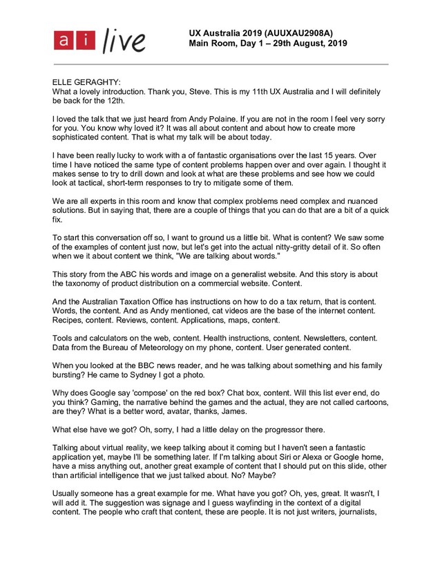 August, 2019 Page 2 of 6 copywriters and technical writers, it is also sound designers, illustrators, videographers, and we know people who are creating big fakes using artificial intelligence, these are all content creators. So let's think about why content is so important. Let's have a look, I know this is quite small, but this is the Apple website. I've taken a nice long screen grab of it. You might think these guys are doing alright. Apple sent to be pretty successful, perhaps their homepage is a pretty good one. But let's deconstructed. What is going on on this homepage? The first thing I can see is content. I can see words and images. Let's get rid of that, I want to get rid of that so I can see what is left in the content. There are some more words, I know that is content, I said that before. More words, and other image. They are content. Hyperlinks are content. Thanks, good point, but that on the slide as well. More content, more words, a link, images. Beautiful photography, I wonder how much they paid for that. They probably thought about that for they did it as well. Notice I left the global navigation and the footer there as well. I would argue that navigation is content as well. I will leave the global navigation for you. So that is apple, they are a commercial site. It is all about the shiny imagery. Let's go back to the Australia Taxation Office and did the same thing but more quickly. You can see the same thing will happen there. Can I see the top? I can see some words. Maybe there is the micro copy on the search function, content. Then I can see a whole bunch of 'read more' trying to solicit me into reading more about the site. I can see chat box, some help text explaining how to use it. I can see infographics, more infographics, more infographics. I will get rid of that again. So what is left on this website? How many people submit a tax return? It is about 11.5 million people in Australia every year. You can say proportion of them have had a look at this website, it is a pretty important site, made up substantially of content. It is pretty important. You can say they are information websites but what about a functional website. Where is the interaction? Google maps. Words, content, icons, content. More words, content. It goes on and on. You might say, "Hang on, that is not content." But the map is content. The GIS is content. That is why content is so, so important. If we are not thinking about it from a more tactical point of view, if you think about the storytelling that Andy Polaine talked about, content is really the basis of why it will come to a digital space. And really interestingly, I just heard from Tad McGillin who was instrumental in heading up the UK government Digital strategy, and he came to Sydney conference, and he headed up the UK government estimate, any said it cost 10 times as much to service the user from the call centre, or if you potentially have a walk-in branch, then it does via digital.