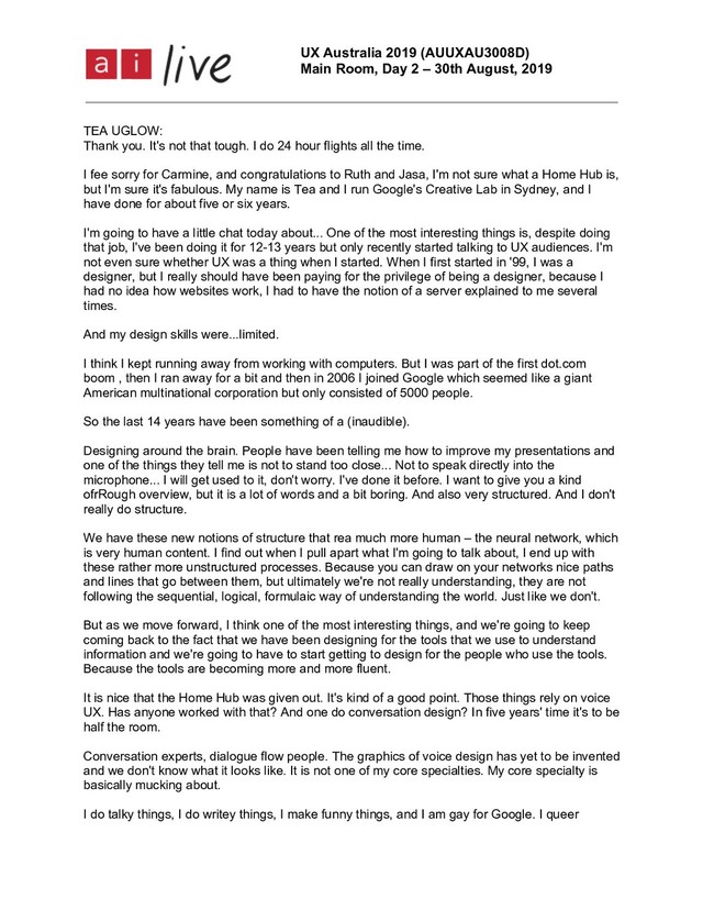 August, 2019 Page 4 of 11 everywhere. And one of the things I would love to touch on is how we deal with difference. I like explaining about leadership. Because I come from a place I have never been able to deal with the hierarchy, leadership. Because there is someone at the top, normally a white guy, kind of telling everyone else what to do, when to do it, how to do it, how loud, when to shut up. And then you get to this place they have decided – their vision, what they're going to do. And I prefer a gardening approach, which is much more like find the pretty flowers, bury them in the soil, and then basically water them and talk to them. And then let them do their thing and then other people come along and say, "What a beautiful garden!" And I'm like, "Yes, I grew it myself." My team don't listen to me, the only point of absolute decision is when I tell them to stop doing things. Because there was a was a point where you have to stop being in control, allowing experts to do what they do really well. And I am not an expert in the things that they do. So there is definitely a point where I need to become a user because that is the nearest thing I can do to being helpful. So I am quite good at that. We all have different leadership styles. I find it's like the (inaudible) industry. We have a notion of expertise which is around what is important. In this era when science is debatable. We should remember that science is debatable. Science is, as his excess, as maths is, anything apart from ballet, debatable. And the way I often construe this and explain this to people is that, do you trust your doctor? Does everyone? Mostly. You probably do now more than you did 20 years ago, because they didn't know anything. And if you trusted your doctor from 100 years ago more than today, you would be an idiot. Because we have learned. But on that logic, if you could move me forward 20 years, without ageing, and if we could move me 100 years into the future, it would be useless to suggest that the experts from hundred years ago – the physicist, neuroscientists, behavioural psychologists, environmentalists, designers, anyone – would be more trustworthy in their expertise. Because it is an evolving thing. It is a continuum, in the same way that there are small children, and as a small child, I wanted things to get better. I was excited about what was coming next. And then I don't remember the bit when everything was OK, great, perfect. I don't remember that happening. But I do remember a moment of, "Everything is going to shit, why can't it be like it was?" And what occurred to me was that every single human who has ever existed as almost certainly follow the trajectory, which means that if you mass them all together, there is a huge wave of people going, "Isn't that exciting?" And that wave will pass on in time from cave dwellers to space astronaut – isn't life exciting? Isn't it amazing what we're going to do? Equally, just ahead of them, is a group of people going, "Oh, my God! Stop."