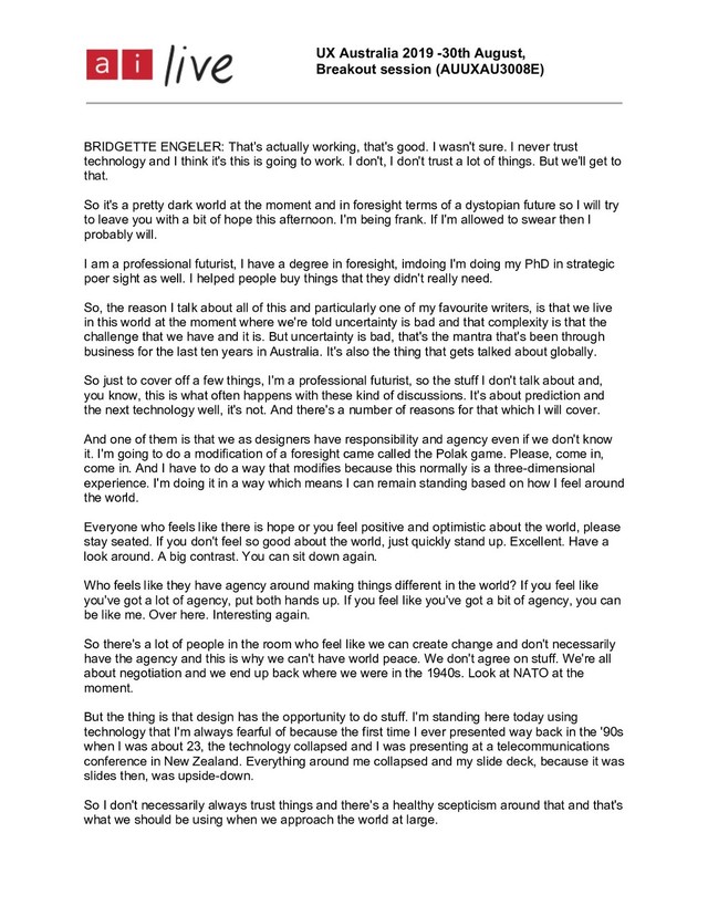 of 10 Starting to think through the consequences of what we're doing into five years' time. If we design this now, what does that do to change things to the five years out? And you can extrapolate quite readily. Also using longer time horizons. I say different, longer, because most work in design is quite short term. We need to get this to market in six weeks, six months, I worked in a wine that had to go to market in six weeks and they didn't have a (inaudible). It was a tight deadline. But it worked. Doesn't necessarily mean it's good, except in this sense they had excess fruit so they wanted to get it out and do something with it. There was a commercial imperative as well. So thinking about longer time horizons in the work that we do. Asking better questions. We're good at asking questions in design, we're good at asking people what they think and feel about things and there's been a discussion with Cameron Tonkin yesterday and today about when we ask people what they do and what they say is different, are we then interrogating them further? Maybe we are and maybe sometimes we have to but maybe we should just ask a better question. Maybe we can anticipate people's needs without drilling too hard into stuff that's actually a bit - it feels like we're pulling their lives apart sometimes. Still, the other thing is that the multiple perspective, if I ask you to close your eyes for 30 seconds now, and I won't, but if I asked you to do that and imagine a future, how many of you are going to have the same image of the future? Some of you will have study ed semiotics. Who saw a black cat? Who saw a tortoise shell? Who saw a nondomestic cat? Who saw Felix the cat? Still a cat. So images of futures are down to a multiple perspective and what I want in a future and not necessarily what you want and we need to, going back to that first little hands up, stand up thing, we need to acknowledge that there are different perspectives and different preferences and we've got to work through that. We also need to foster the divergent thinking because otherwise we're going to continue with the business as usual. This is the way it's going to be. This is the way it has to be. It doesn't have to be. We've had change significantly and anyone remember Y2K? Didn't happen, did it? Why didn't it happen? We did something about it. So we've been getting the bad news about climate change since the '70s. We've been getting bad news about politics and fragmentation of society for longer than that. We did something about Y2K, we need to do something about the other stuff. Have a view and hold it lightly. The biggest part of foresight work. Yep, that's a possibility, what else is out there? Being able to move from a big macro global perspective down to the really small local perspective, that's part of what we do. There's always going to be multiple futures and things change all the time. The weather changes all the time. Those things affect what we do and the decisions that we make from what clothes we buy. I've got a serious consideration at the moment, look at my overcoat, my beautiful black, long coat that I bought ten years ago, still wearing it, buy quality, people. It's just getting to the end of its tether. I think I might have to do something with the cuffs, it's just starting to get a bit thin. Because I don't think I really need to buy another overcoat. I don't think that I'm really going to get the use out of it even if I live in the UK because at the moment the UK is threatened with its