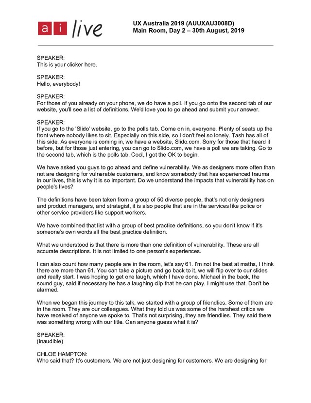 August, 2019 Page 2 of 11 people. We are designing for beautiful, messy, complex people. This is a comment that was made yesterday in the other room, in the ethically designed discussion. It was, when will we replace customers and users and start calling them humans? That's what we all are, and that is who we are designing our products and services for. It's important that we remove that customer lens, and we understand people, where they are coming from and their contacts around it. Between Tash and I, we worked out we have 15 years of experience in this space. that's not just exclusively as designers, we want to share the stories we have and the knowledge we have gained along the way. We want to share with you our point of view. What we believe is that if we start at the definition of vulnerability, we can elevate everyone in the room, and beyond, then it makes it less scary to talk about vulnerability and designing for people that come from these circumstances. Introduction, now that I have bored you with 15 minutes of talking. I am Chloe. Hi! That is my beautiful family on… What side is that? My right, your left. I don't know if you have noticed, but I am a black woman. I wear my identity on my sleeve. Often times because I am a black woman, I am part of a marginalised community, that is often times taken advantage of. We will talk about these different groups of people and how marginalised community can become more vulnerable. I have experience with layers of vulnerability, Liz Jackson who I think is in the room, she talked yesterday about how important it is to not just design with empathy, but to design with lived experience. We believe the same thing. I worked with survivors of sexual assault, survivors of child sexual abuse, I have worked with veterans, and also people that are homeless, people that are unemployed and elderly. I am currently working with chronically and terminally ill patients. Or people, I should say. I am passionate about this, I come from a privileged place. I get to sit at a table with executives and people like yourself, and tell their stories. Not only my story, but their stories. To become a voice for the voiceless. NATASHA BALLANTYNE: I am Tash, I work with Chloe. Working for a big corporation comes with some bias, it also comes with an amazing opportunity for us to pool our resources and make a difference. It's not about what organisation we work for, it comes down to people. The people we work with and design with. It's us as individuals, we are people too. We have our own vulnerabilities we experience. It's about taking stories from different types of people and about sharing those stories to effect change. It's not just on us to share those stories, it's on us to bring them along and have those stories heard, and support them to tell their stories of vulnerability. Part of our role as designers is about challenging what projects we are working on, challenging whether or not we are designing to make a difference to people. Ultimately, what it comes down to, it is no longer angers is for us to say that we work for a big corporation, that has constraints.