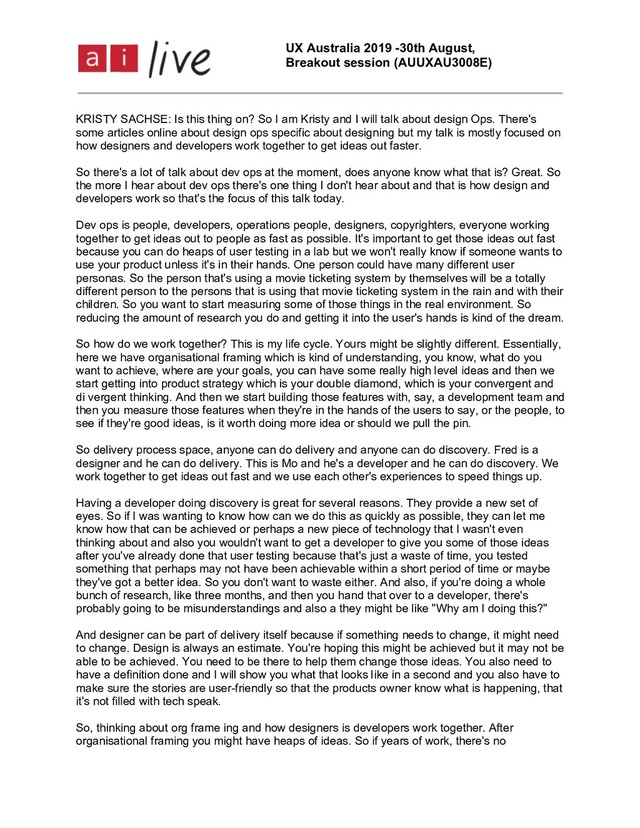 Is this thing on? So I am Kristy and I will talk about design Ops. There's some articles online about design ops specific about designing but my talk is mostly focused on how designers and developers work together to get ideas out faster. So there's a lot of talk about dev ops at the moment, does anyone know what that is? Great. So the more I hear about dev ops there's one thing I don't hear about and that is how design and developers work so that's the focus of this talk today. Dev ops is people, developers, operations people, designers, copyrighters, everyone working together to get ideas out to people as fast as possible. It's important to get those ideas out fast because you can do heaps of user testing in a lab but we won't really know if someone wants to use your product unless it's in their hands. One person could have many different user personas. So the person that's using a movie ticketing system by themselves will be a totally different person to the persons that is using that movie ticketing system in the rain and with their children. So you want to start measuring some of those things in the real environment. So reducing the amount of research you do and getting it into the user's hands is kind of the dream. So how do we work together? This is my life cycle. Yours might be slightly different. Essentially, here we have organisational framing which is kind of understanding, you know, what do you want to achieve, where are your goals, you can have some really high level ideas and then we start getting into product strategy which is your double diamond, which is your convergent and di vergent thinking. And then we start building those features with, say, a development team and then you measure those features when they're in the hands of the users to say, or the people, to see if they're good ideas, is it worth doing more idea or should we pull the pin. So delivery process space, anyone can do delivery and anyone can do discovery. Fred is a designer and he can do delivery. This is Mo and he's a developer and he can do discovery. We work together to get ideas out fast and we use each other's experiences to speed things up. Having a developer doing discovery is great for several reasons. They provide a new set of eyes. So if I was wanting to know how can we do this as quickly as possible, they can let me know how that can be achieved or perhaps a new piece of technology that I wasn't even thinking about and also you wouldn't want to get a developer to give you some of those ideas after you've already done that user testing because that's just a waste of time, you tested something that perhaps may not have been achievable within a short period of time or maybe they've got a better idea. So you don't want to waste either. And also, if you're doing a whole bunch of research, like three months, and then you hand that over to a developer, there's probably going to be misunderstandings and also a they might be like "Why am I doing this?" And designer can be part of delivery itself because if something needs to change, it might need to change. Design is always an estimate. You're hoping this might be achieved but it may not be able to be achieved. You need to be there to help them change those ideas. You also need to have a definition done and I will show you what that looks like in a second and you also have to make sure the stories are user-friendly so that the products owner know what is happening, that it's not filled with tech speak. So, thinking about org frame ing and how designers is developers work together. After organisational framing you might have heaps of ideas. So if years of work, there's no