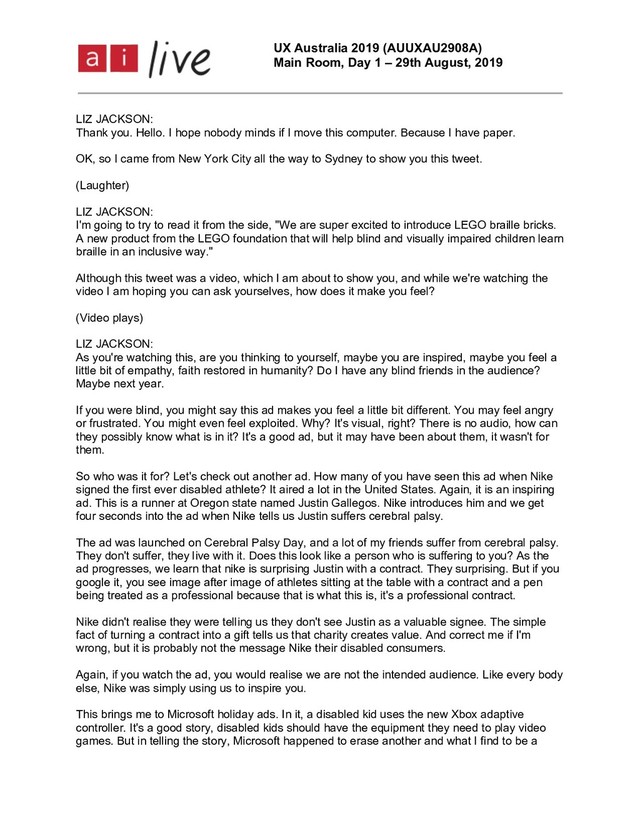 August, 2019 Page 8 of 9 accessibility lab. It was in a really big building in New York City. You say the word 'accessibility lab', and you think it is going to be a lab. They built it up and built it up. I show up, it's not a lab. It's a small room. I walked in and I was like, huh. But it was a strange small room. It looked like they had cleared out a closet, stuck a couple of computers in it, and they were like, "Welcome to our accessibility lab." And I was weirded out. I just started playing. I remember they had those glasses that have the headphones on them from Bose. I started playing Lizzo. Then they have simulation goggles so I put those on and I am missing shit up. So I start blasting the music, taking over the room dancing, and while I am doing that, I am thinking to myself, what the hell is wrong with me? Maybe they want to work with me. Not anymore. But I think the thing I realised was this was not disability at all. You can't just clean out a closet, stick in a couple of things, and call that accessibility and think you are reaching disability. I think when disability finally enters the corporation, it is going to feel a bit messier. And I wanted to show them they could not constrain me. I wanted to show them this was expansive, I wanted to show them the messiness of it. So I think that's where I am at, we want the process to be clean but it is not. We are designers. As children we may discover we have a knack for design, yet we know it is not enough. We go to school and develop our skills, we graduate, we attend events like this one today, this is our commitment to our profession. And yet when it comes to disability, we often think 'we just know'. But we don't. It is a process that requires commitment and reflection. A year ago I was walking through New York City and I encountered the most beautiful bouquet of flowers I had ever seen in my entire life. And I just couldn't believe it. The first thing I did was I took this picture. The second thing I did was I was going to save it, so the cherry blossoms, they were like 6 feet tall, but there were tulips at the base. I picked up a lot of the tulips and took them into the office. I was sitting there looking at them, thinking about it, and I pulled open my phone and looked at the picture. And I cannot get over, I cannot understand, who would throw these flowers away. I need to save them. And so I hobbled back down the two blocks to where these cherry blossoms were. It was really early and I was the first person to reach it. So I tugged at a few of the cherry blossoms to see if I could get them out, and as soon as I did that, the entire trashcan fell over. I was thinking to myself, what have I done? It was so beautiful, I ruined it! No longer was it something I was going to save, now I had ruined a thing of beauty. And I had just got a brand-new leather jacket. I didn't care. I hugged that New York City trashcan and lifted it right up. In doing so, it wasn't quite as beautiful. Everything was lopsided.