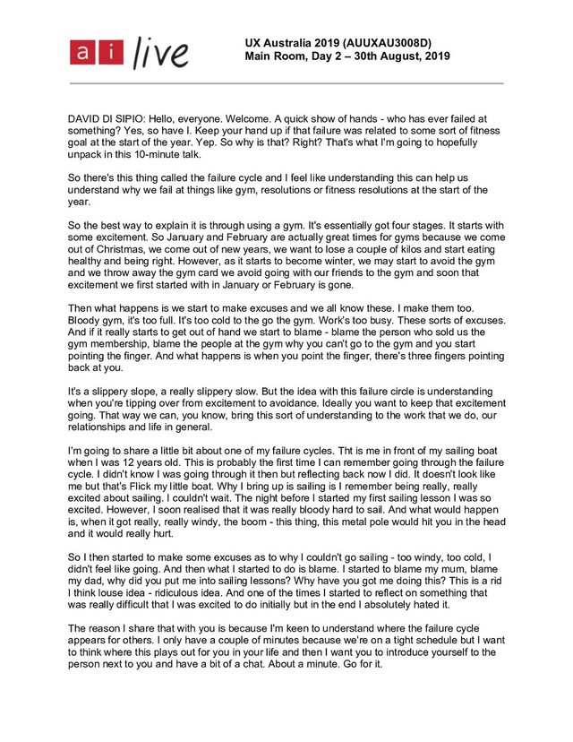 August, 2019 DAVID DI SIPIO: Hello, everyone. Welcome. A quick show of hands - who has ever failed at something? Yes, so have I. Keep your hand up if that failure was related to some sort of fitness goal at the start of the year. Yep. So why is that? Right? That's what I'm going to hopefully unpack in this 10-minute talk. So there's this thing called the failure cycle and I feel like understanding this can help us understand why we fail at things like gym, resolutions or fitness resolutions at the start of the year. So the best way to explain it is through using a gym. It's essentially got four stages. It starts with some excitement. So January and February are actually great times for gyms because we come out of Christmas, we come out of new years, we want to lose a couple of kilos and start eating healthy and being right. However, as it starts to become winter, we may start to avoid the gym and we throw away the gym card we avoid going with our friends to the gym and soon that excitement we first started with in January or February is gone. Then what happens is we start to make excuses and we all know these. I make them too. Bloody gym, it's too full. It's too cold to the go the gym. Work's too busy. These sorts of excuses. And if it really starts to get out of hand we start to blame - blame the person who sold us the gym membership, blame the people at the gym why you can't go to the gym and you start pointing the finger. And what happens is when you point the finger, there's three fingers pointing back at you. It's a slippery slope, a really slippery slow. But the idea with this failure circle is understanding when you're tipping over from excitement to avoidance. Ideally you want to keep that excitement going. That way we can, you know, bring this sort of understanding to the work that we do, our relationships and life in general. I'm going to share a little bit about one of my failure cycles. Tht is me in front of my sailing boat when I was 12 years old. This is probably the first time I can remember going through the failure cycle. I didn't know I was going through it then but reflecting back now I did. It doesn't look like me but that's Flick my little boat. Why I bring up is sailing is I remember being really, really excited about sailing. I couldn't wait. The night before I started my first sailing lesson I was so excited. However, I soon realised that it was really bloody hard to sail. And what would happen is, when it got really, really windy, the boom - this thing, this metal pole would hit you in the head and it would really hurt. So I then started to make some excuses as to why I couldn't go sailing - too windy, too cold, I didn't feel like going. And then what I started to do is blame. I started to blame my mum, blame my dad, why did you put me into sailing lessons? Why have you got me doing this? This is a rid I think louse idea - ridiculous idea. And one of the times I started to reflect on something that was really difficult that I was excited to do initially but in the end I absolutely hated it. The reason I share that with you is because I'm keen to understand where the failure cycle appears for others. I only have a couple of minutes because we're on a tight schedule but I want to think where this plays out for you in your life and then I want you to introduce yourself to the person next to you and have a bit of a chat. About a minute. Go for it.